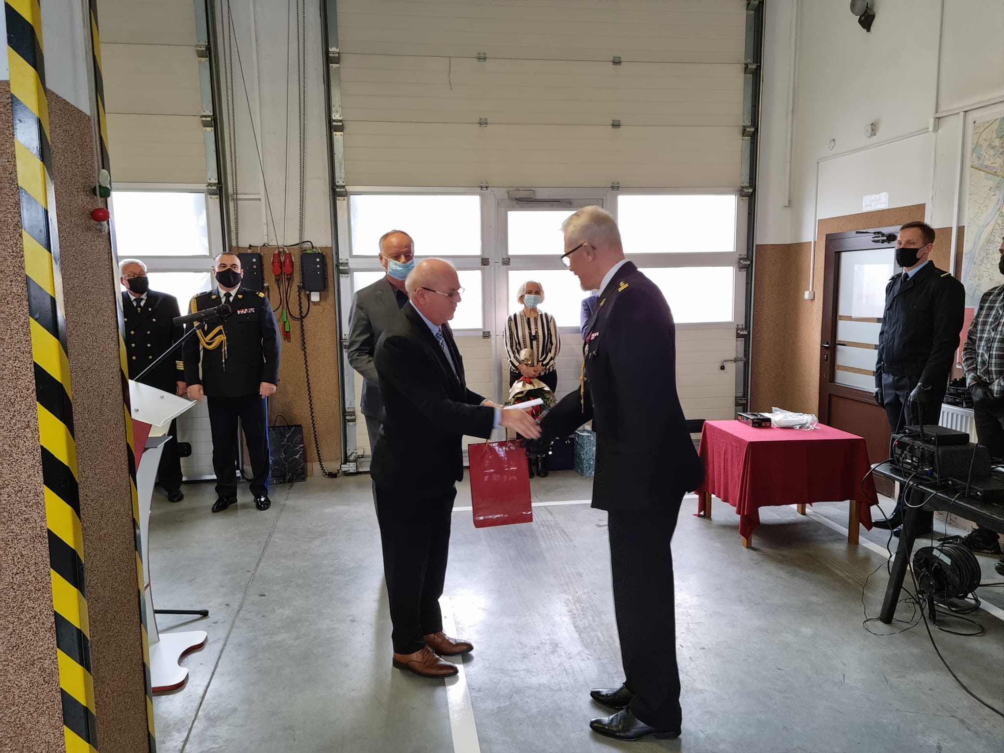 Kulminacyjnym momentem uroczystej zbiórki było pożegnanie ze sztandarem przechodzącego na zaopatrzenie emerytalne Komendanta Powiatowego PSP w Malborku bryg. Mariusza Dzieciątek.