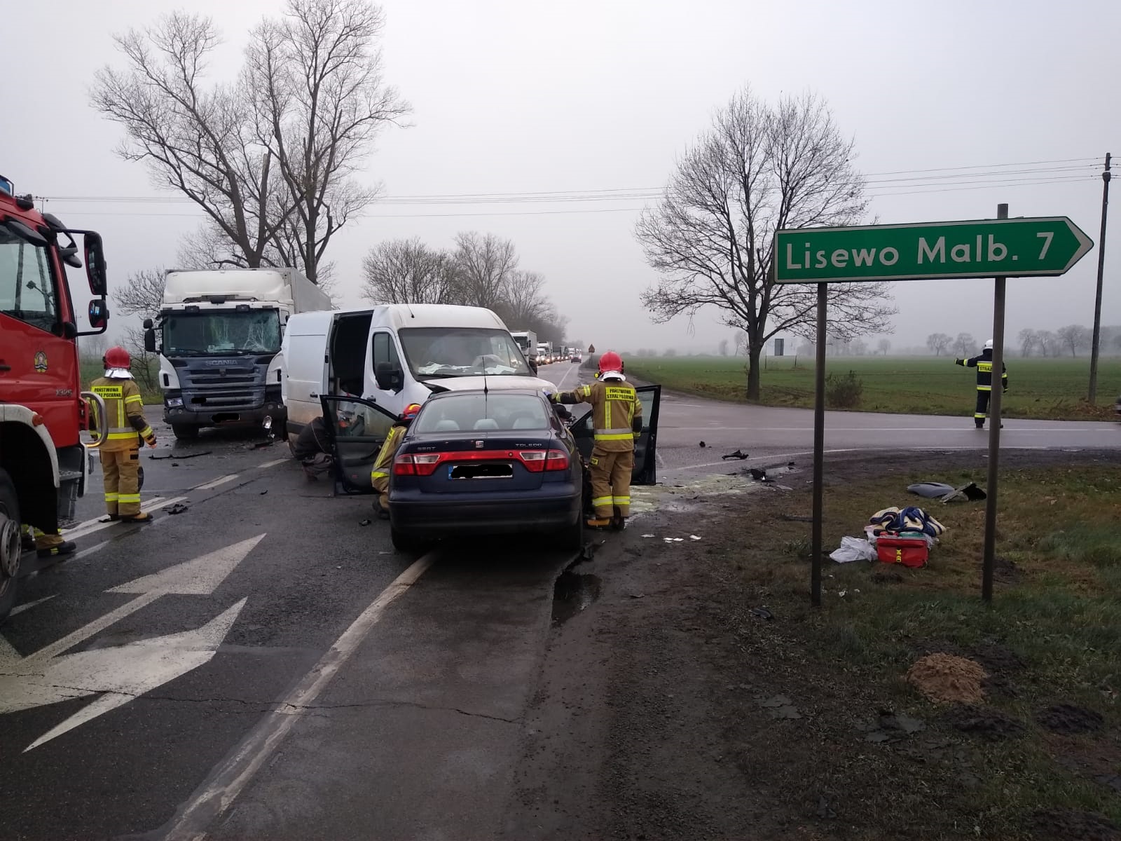 Zadysponowano 5 zastępów straży pożarnej, trzy z JRG Malbork oraz jeden z JRG Tczew (teren współdziałania) i jeden z OSP Kończewice. Po przybyciu na miejsce zdarzenia kierujący działaniami stwierdził wypadek drogowy 4 pojazdów ( 3 samochodów osobowych i 1 samochodu ciężarowego). Dwie osoby poszkodowane z samochodu osobowego w stanie ogólnym dobrym. W zdarzeniu uczestniczyło łącznie 8 osób. Widoczne wycieki płynów eksploatacyjnych. Podróżujący w jednym z pojazdów są obywatelami Ukrainy - bez obrażeń. Policja na miejscu zdarzenia.