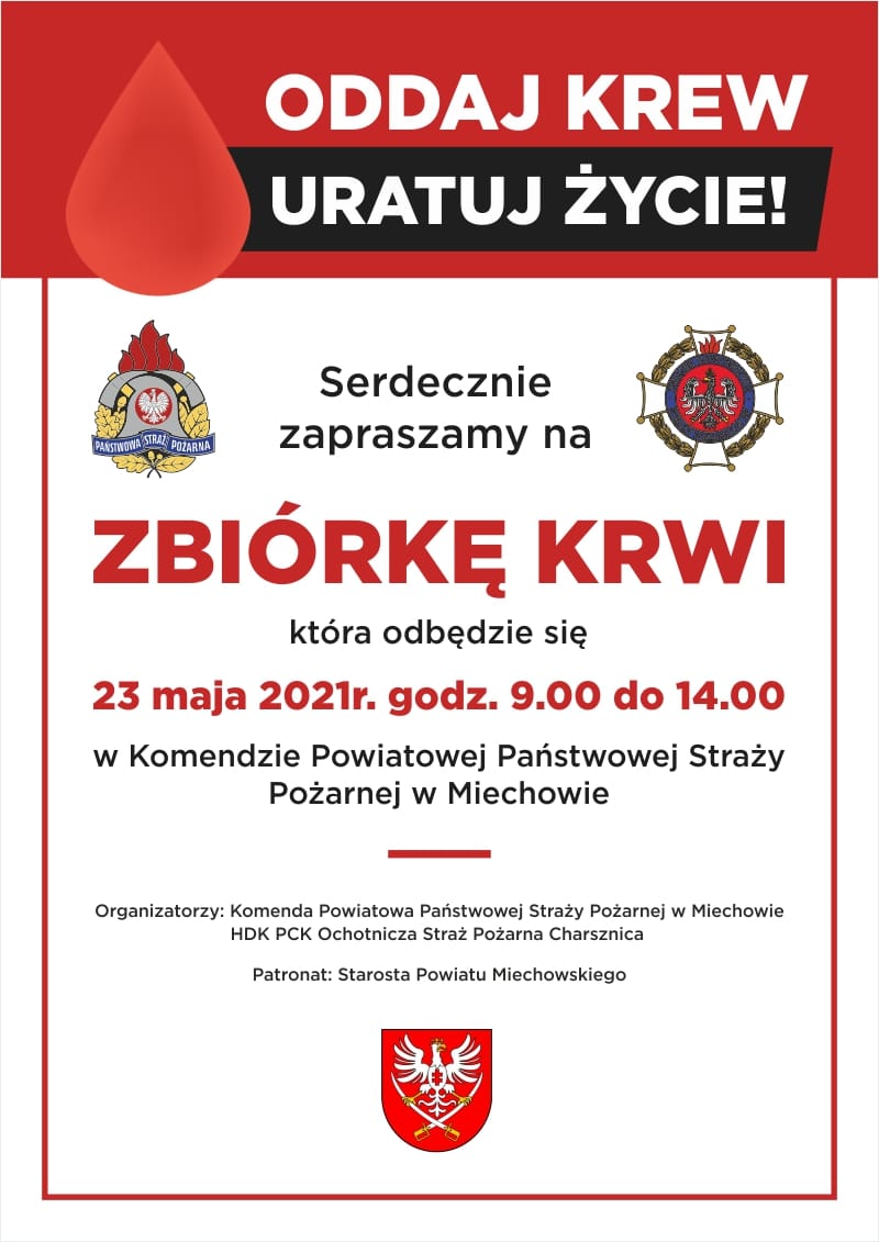 Komendant Powiatowy Państwowej Straży Pożarnej w Miechowie przy współpracy z HDK PCK Ochotniczej Straży Pożarnej w Charsznicy, oraz Regionalnym Centrum Krwiodawstwa i Krwiolecznictwa w Krakowie, zapraszają do udziału w akcji honorowego oddawania krwi.
