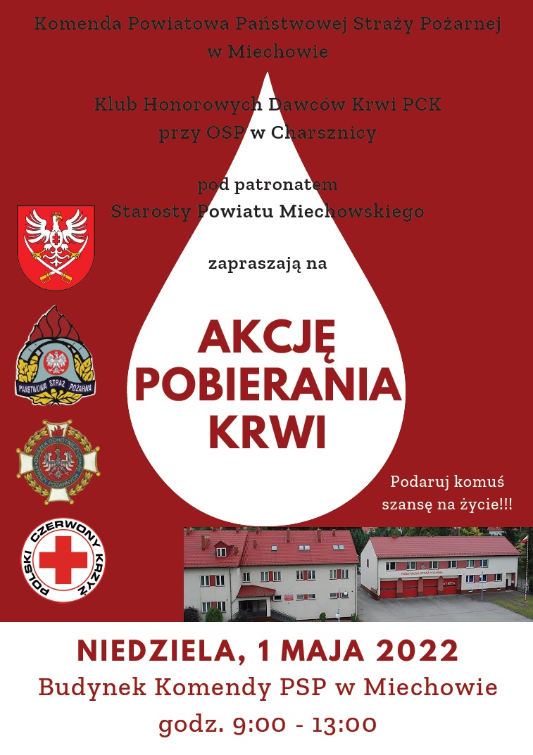 W niedzielę 1 maja br. na terenie naszej komendy pod patronatem Starosty Miechowskiego odbyła się akcja honorowego oddawania krwi. Organizatorem i pomysłodawcom była Komenda Powiatowy Państwowej Straży Pożarnej w Miechowie oraz HDK PCK Ochotniczej Straży Pożarnej w Charsznicy.