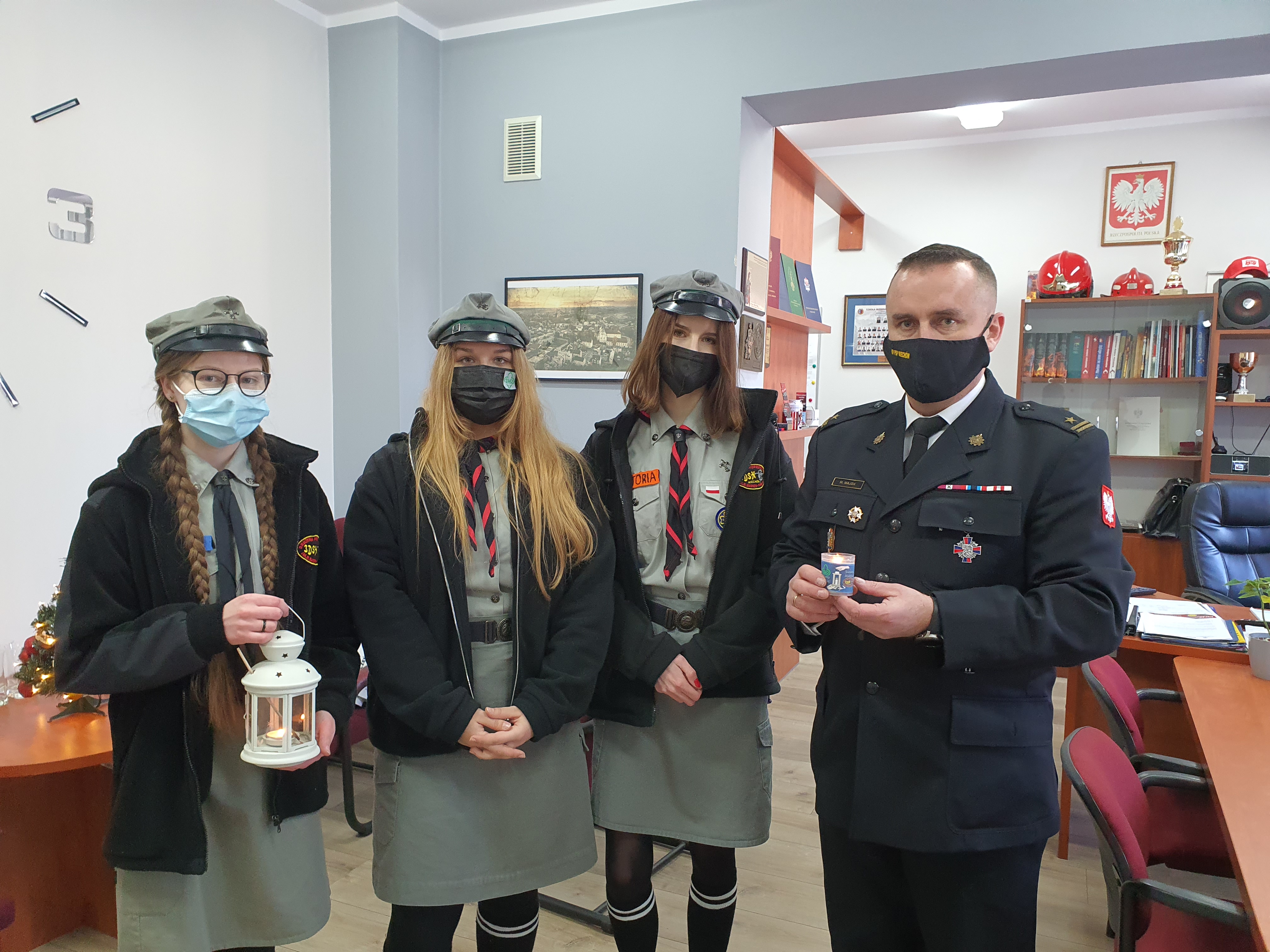 Delegacja harcerzy miechowskiego Hufca ZHP odwiedziła Komendę Powiatową Państwowej Straży Pożarnej w Miechowie w środę 22 grudnia, przynosząc ze sobą Światło i głosząc przesłanie: