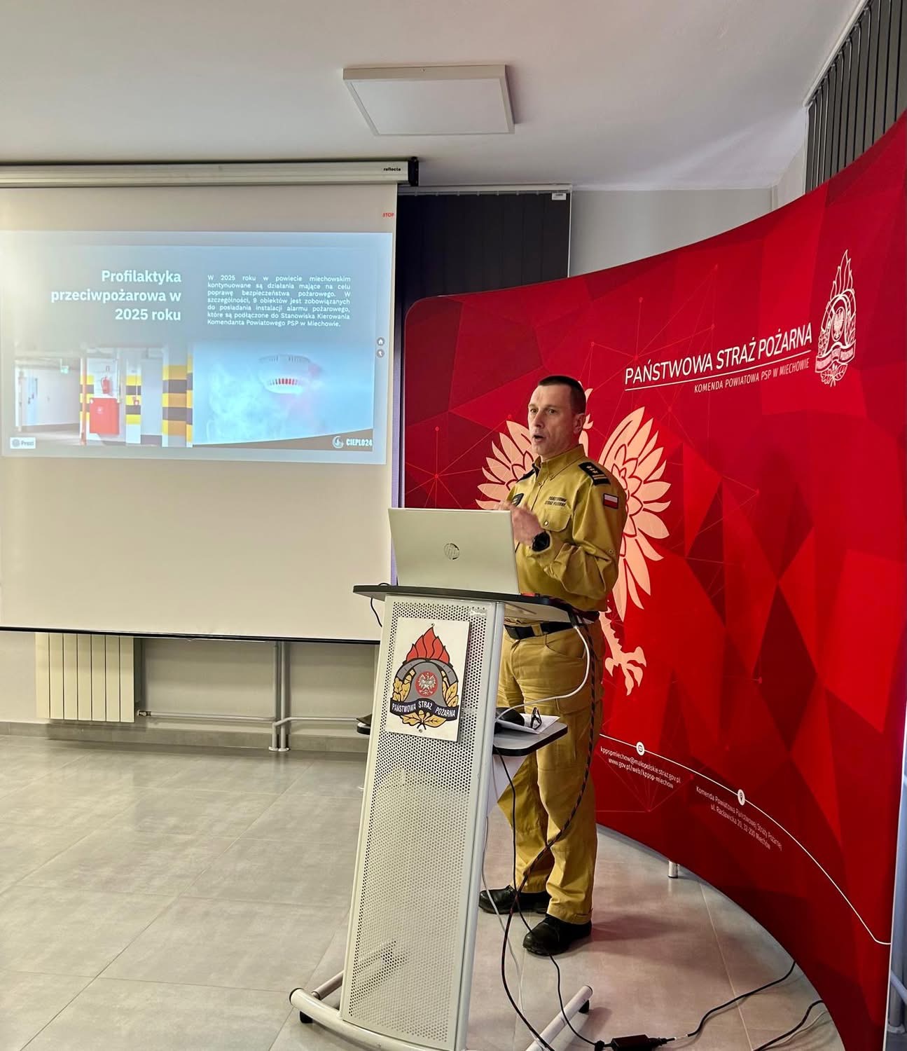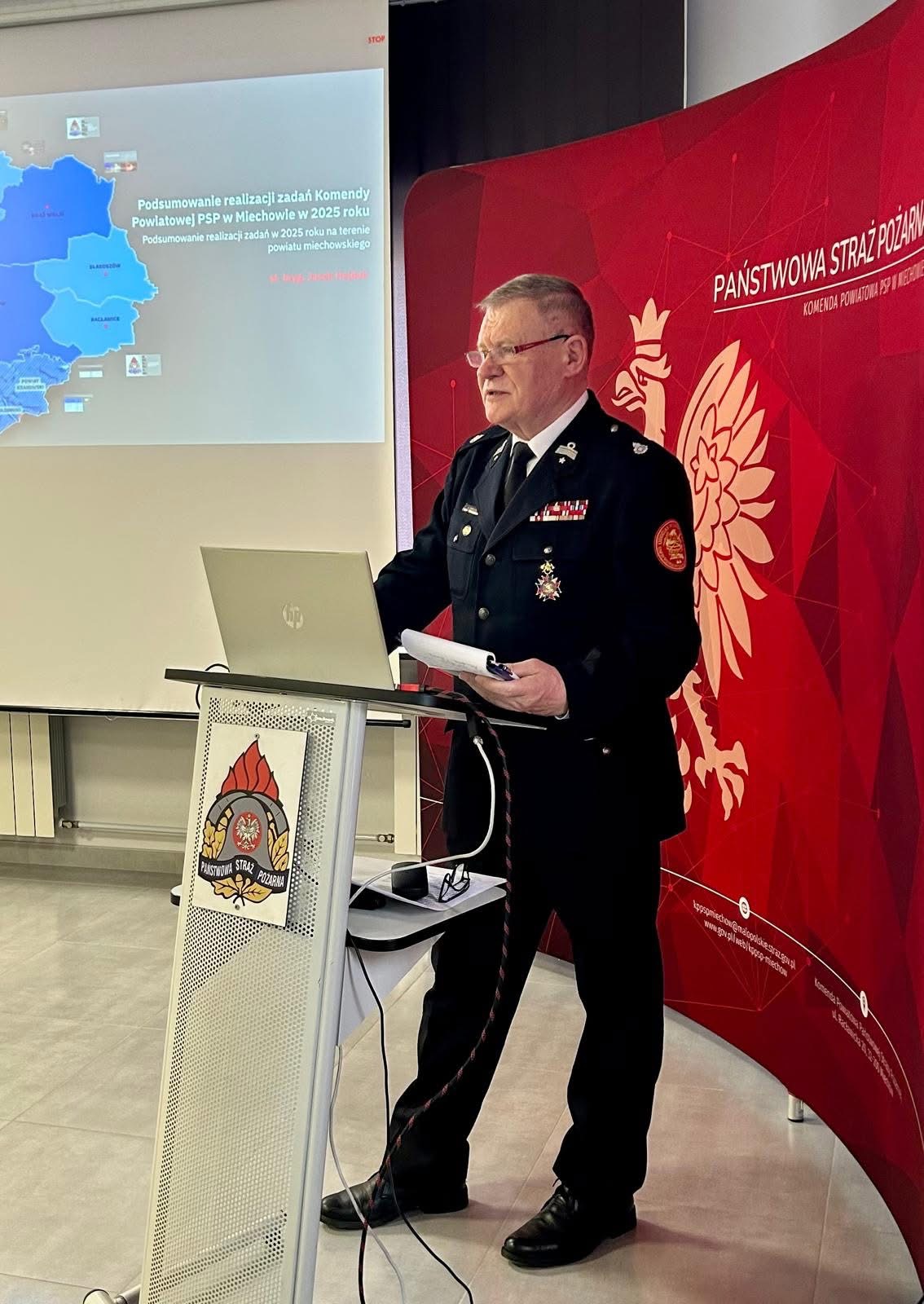 Podczas prezentacji przedstawiającej działalność Komendy Powiatowej PSP w Miechowie, st. bryg. Jacek Hajduk Komendant Powiatowy PSP w Miechowie podsumował 2025 rok w rozbiciu na poszczególne dziedziny, w obszarze których funkcjonuje Komenda Powiatowa Państwowej Straży Pożarnej w Miechowie.