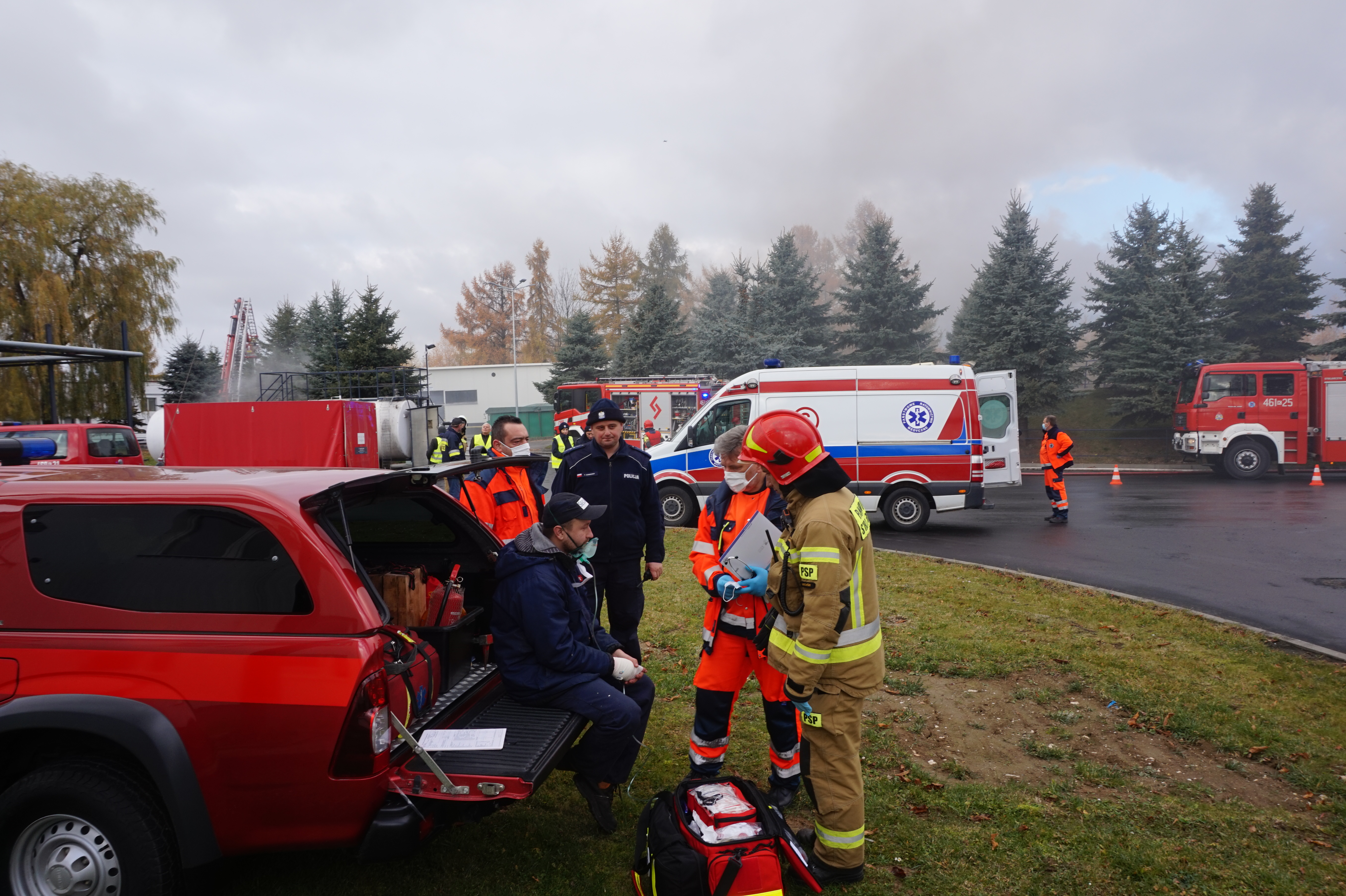 To dwa główne epizody ćwiczeń zorganizowanych przez Komendę Powiatową Państwowej Straży Pożarnej w Miechowie, które skoncentrowały w tym dniu w obrębie zakładu Saria szereg jednostek Państwowej Straży Pożarnej, Ochotniczych Straży Pożarnych, Policji, Państwowego Ratownictwa Medycznego i Powiatowego Centrum Zarządzania Kryzysowego.