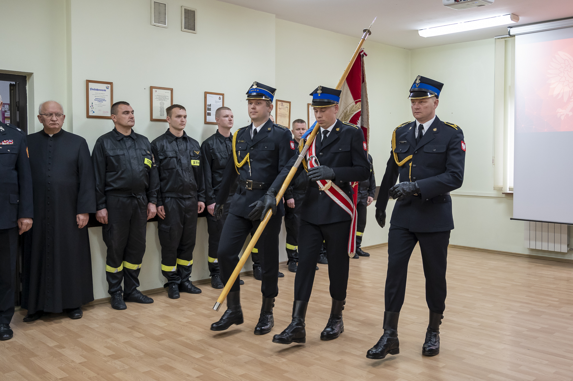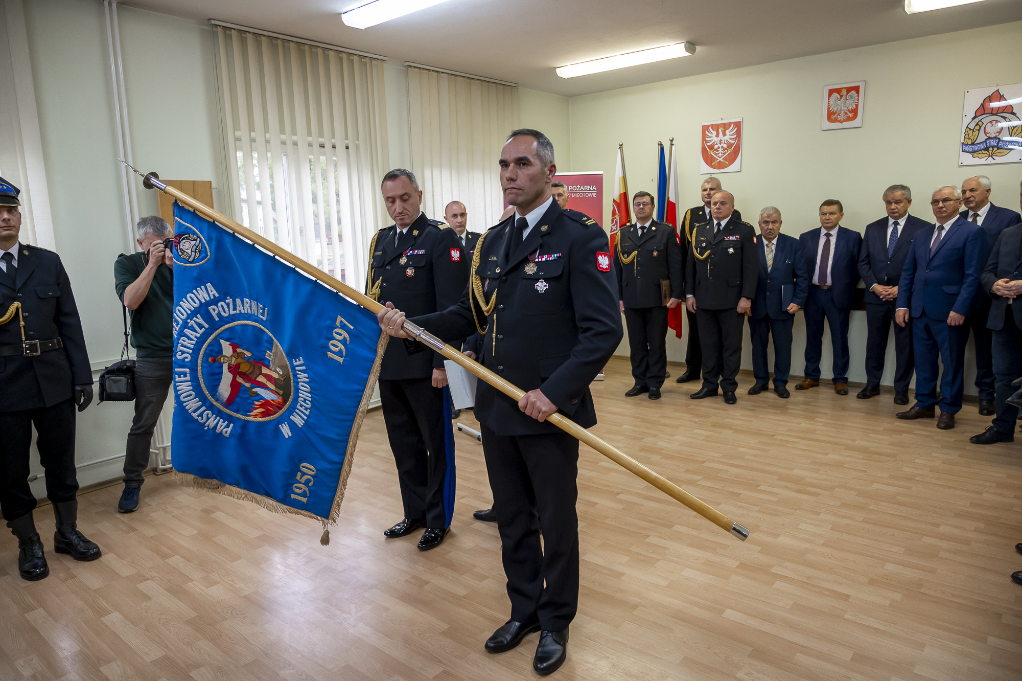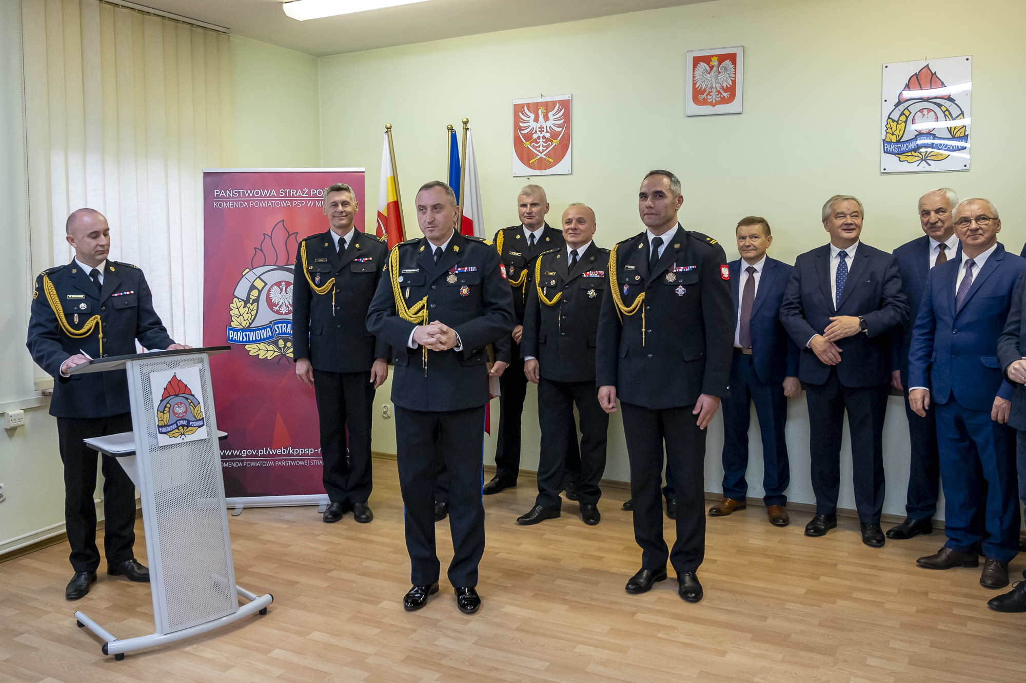 W uroczystej zbiórce poświęconej przywitaniu nowego Komendanta Powiatowego PSP w Miechowie oprócz funkcjonariuszy i pracowników komendy uczestniczyli przedstawiciele władz samorządowych z powiatu miechowskiego ze starostą miechowskim Panem Jackiem Kobyłką na czele, duchowieństwo, przedstawiciele współpracujących służb mundurowych oraz instytucji.