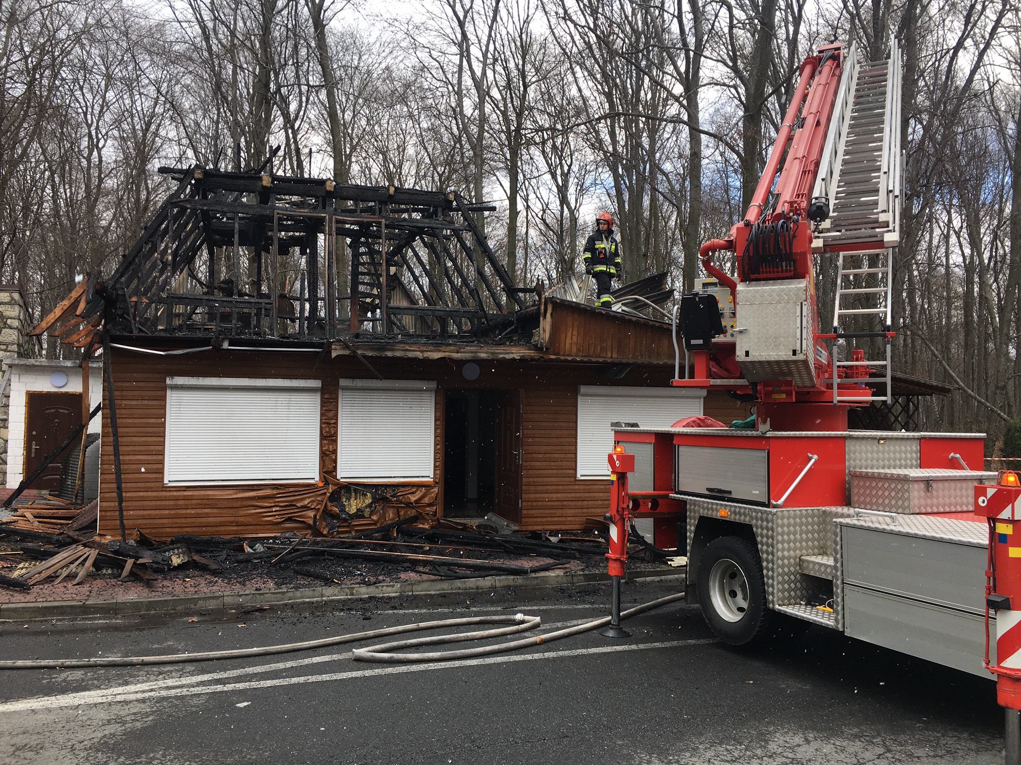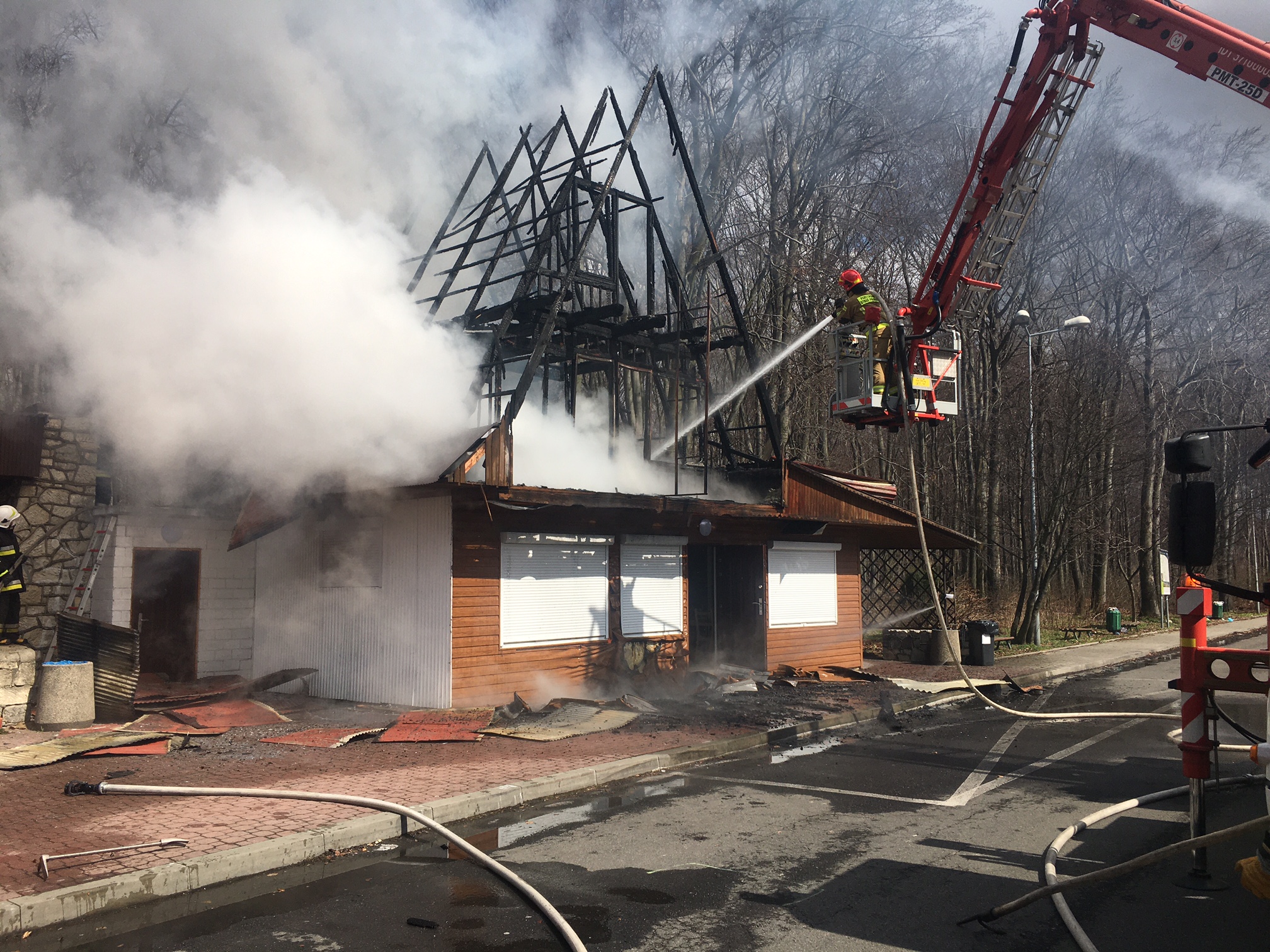 Dyżurny Stanowiska Kierowania Komendanta Powiatowego PSP w Miechowie przyjął zgłoszenie o pożarze obiektu gastronomicznego w miejscowości Brzuchania. Do zdarzenia zadysponowane zostały trzy zastępy oraz Dowódcę z JRG Miechów i zastęp OSP KSRG Książ Wielki. Na miejscu ustalono, że pożarem objęty jest cały budynek. Pożar został ugaszony przy użyciu dwóch prądów wody przez ratowników PSP wyposażonych w aparaty ochrony dróg oddechowych. Zastęp OSP KSRG Książ Wielki zorganizował zaopatrzenie wodne poprzez dowożenie. Po zakończeniu działań gaśniczych z budynku usunięto część nadpalonej więźby dachowej. Następnie obiekt skontrolowano kamerą termowizyjną oraz urządzeniem pomiarowym na obecności gazów niebezpiecznych. Na czas prowadzonych działań rejon operacyjny w JRG zabezpieczał zastęp OSP KSRG Bukowska Wola .