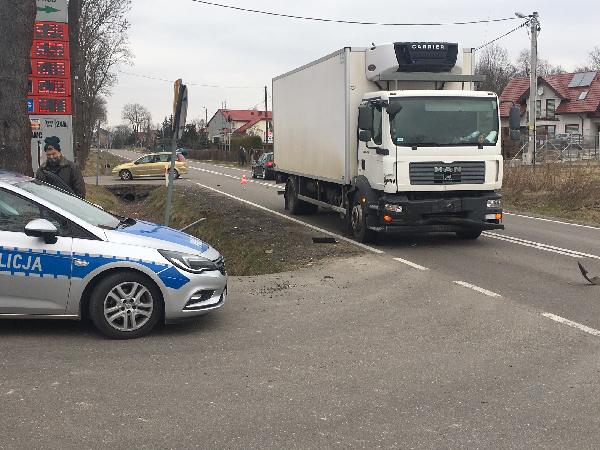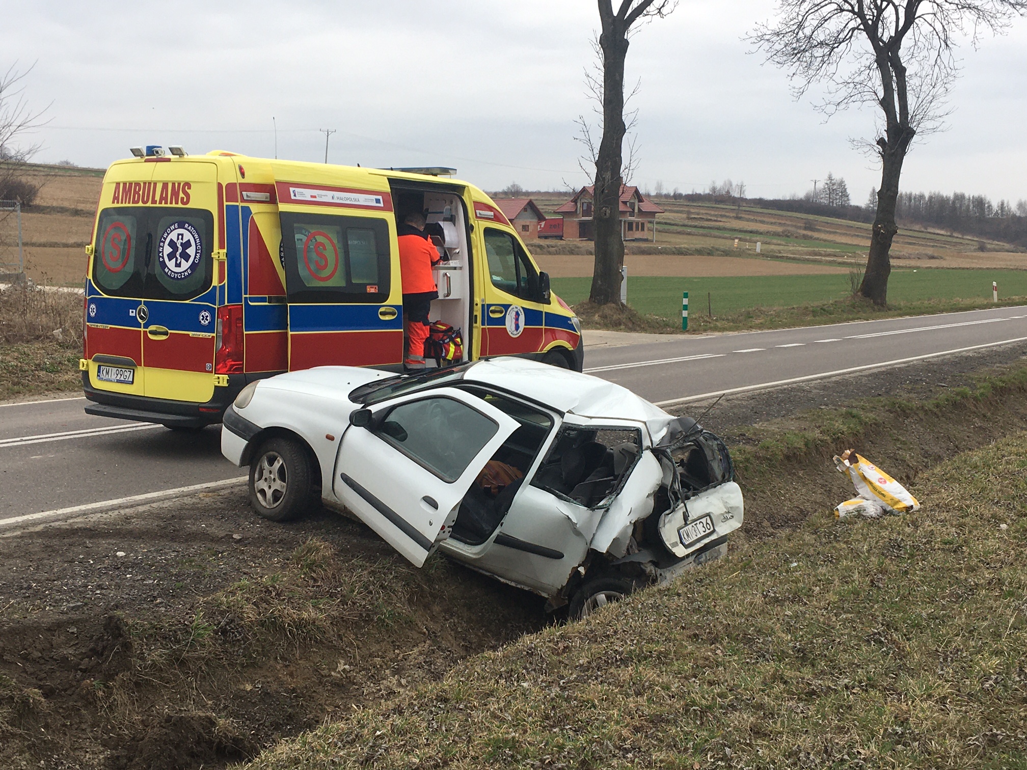 Do zdarzenia zadysponował jeden zastęp oraz Dowódca z JRG Miechów. Na miejscu ustalono, iż doszło do zderzenia samochodu ciężarowego z osobowym .W wyniku zderzenia samochód osobowy wypadł z drogi i znajduje się w rowie, natomiast samochód ciężarowy na pasie jezdni. Kierowcy oraz pasażerka samochodu osobowego opuścił pojazd o własnych siłach. Przybyły n miejsce Zespół Ratownictwa Medycznego, przebadał pasażerkę z samochodu osobowego, następnie zabrał ją do szpitala. Na czas działań ruch na drodze odbywał się wahadłowo.