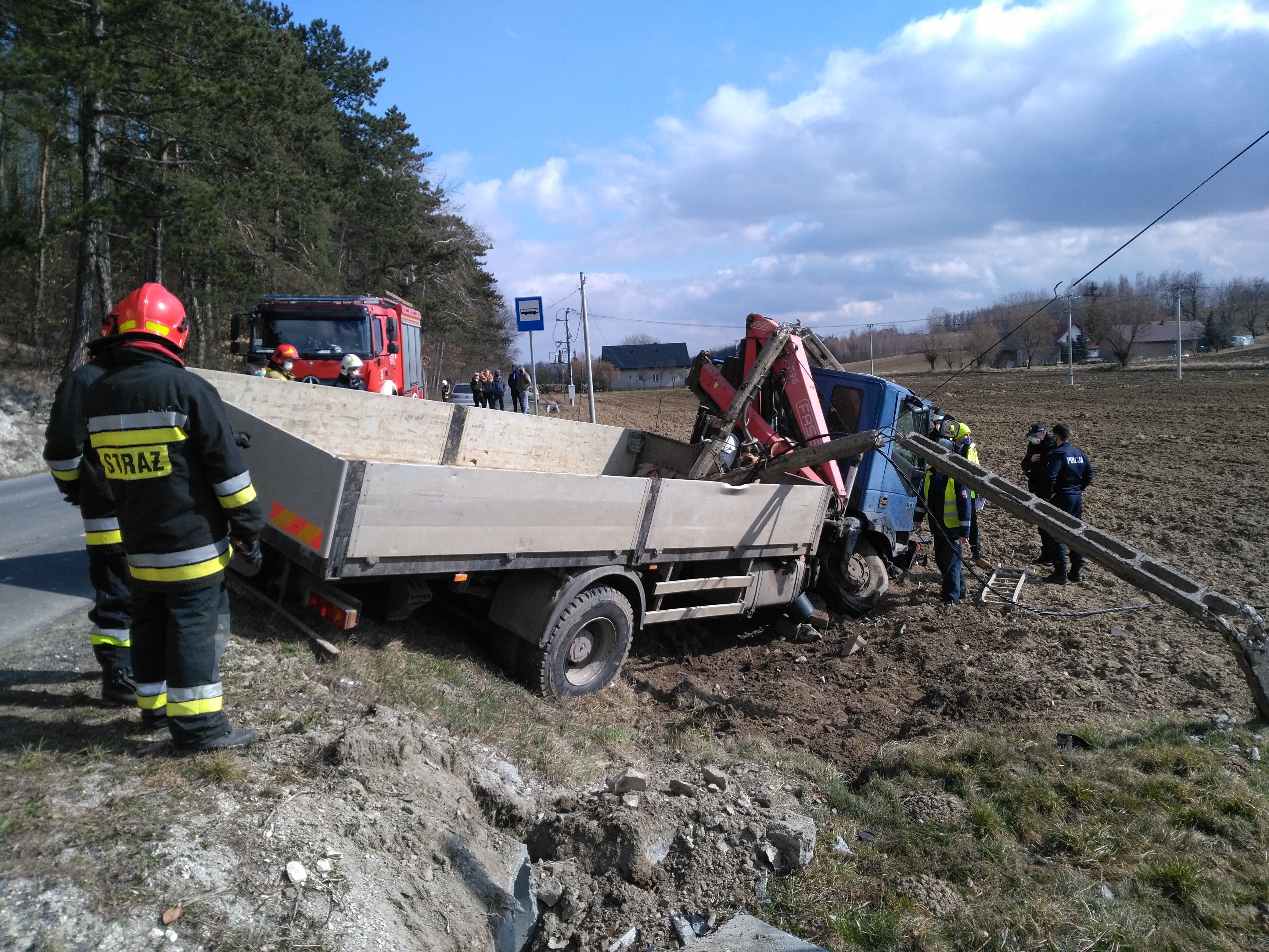 Dyżurny Stanowiska Kierowania Komendanta Powiatowego PSP w Miechowie przyjął zgłoszenie o zdarzeniu drogowym w miejscowości Czaple Wielkie. Do zdarzenia zadysponowany zostały jeden zastęp z JRG Miechów oraz dwa zastępy OSP KSRG Ulina Wilka i OSP Gołcza. Na miejscu ustalono, iż samochód ciężarowy wypadł z drogi i uderzył w słup energetyczny. Kierowca samodzielnie opuścił pojazd. Po opatrzeniu rany głowy przez strażaków i przebadaniu przez przybyły zespół Ratownictwa Medycznego pozostał na miejscu zdarzenia. Na czas działań ruch na drodze odbywał się wahadłowo.