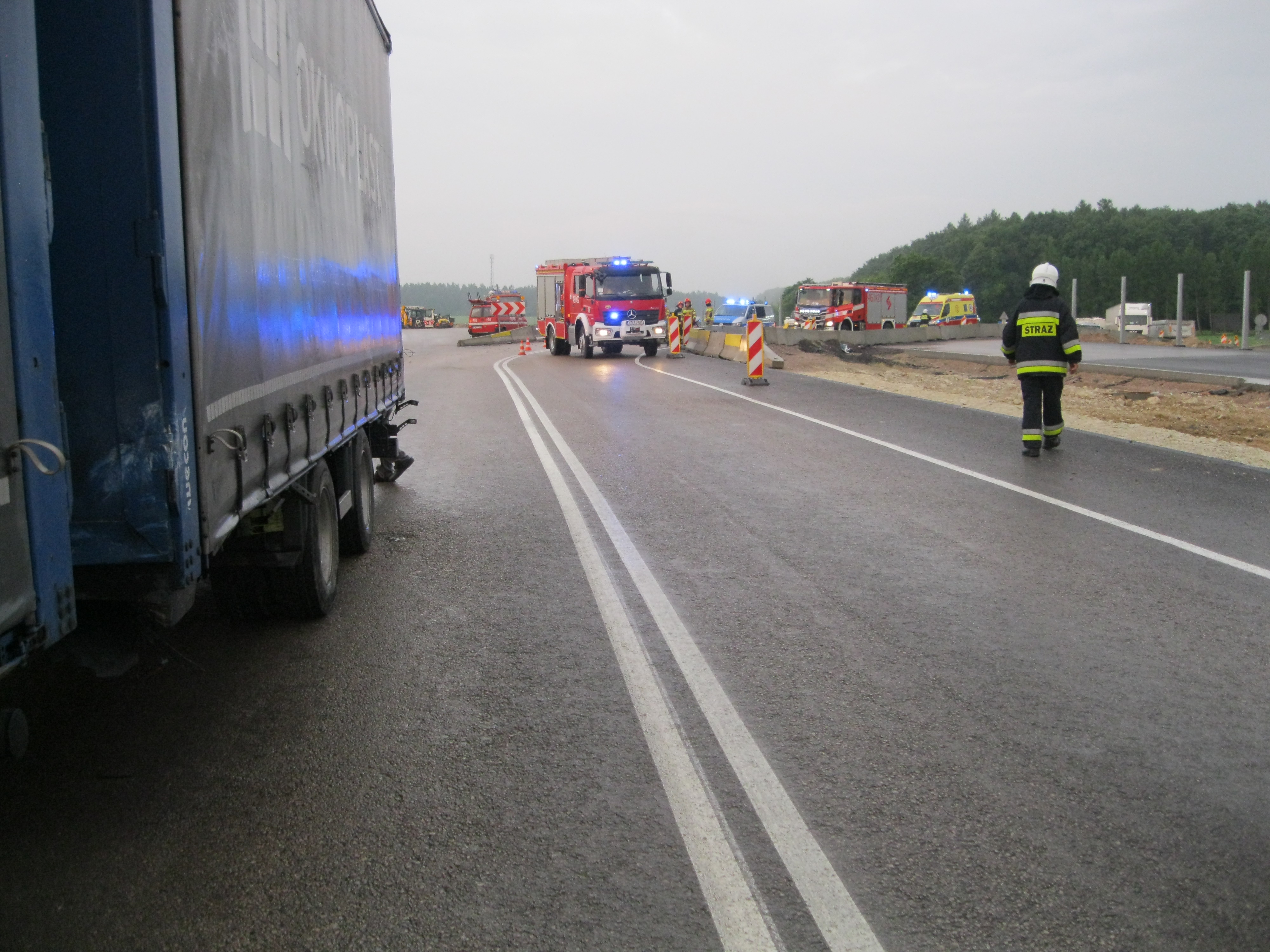 Dyżurny Stanowiska Kierowania Komendanta Powiatowego PSP w Miechowie, przyjął zgłoszenie o zdarzeniu drogowym w miejscowości Moczydło. Do zdarzenia zadysponował dwa zastępy z JRG Miechów oraz po jednym zastępie OSP Książ Wielki i OSP Moczydło. Na miejscu ustalono, iż doszło do zderzenia samochodu osobowego z naczepą samochodu ciężarowego W wyniku zderzenia samochody znajdowały się na jezdni blokując ruch drogowy na jednym pasie. W zdarzeniu nie było osób poszkodowanych – kierujący pojazdami samodzielnie opuścili pojazdy i po przebadaniu przez przybyły Zespół Ratownictwa Medycznego pozostali na miejscu zdarzenia. Działania PSP: polegały na zabezpieczeniu miejsca zdarzenia, odłączeniu zasilania w uszkodzonym pojeździe, sorpcji rozlanych płynów eksploatacyjnych, usunięciu uszkodzonego pojazdu osobowego z jezdni.
