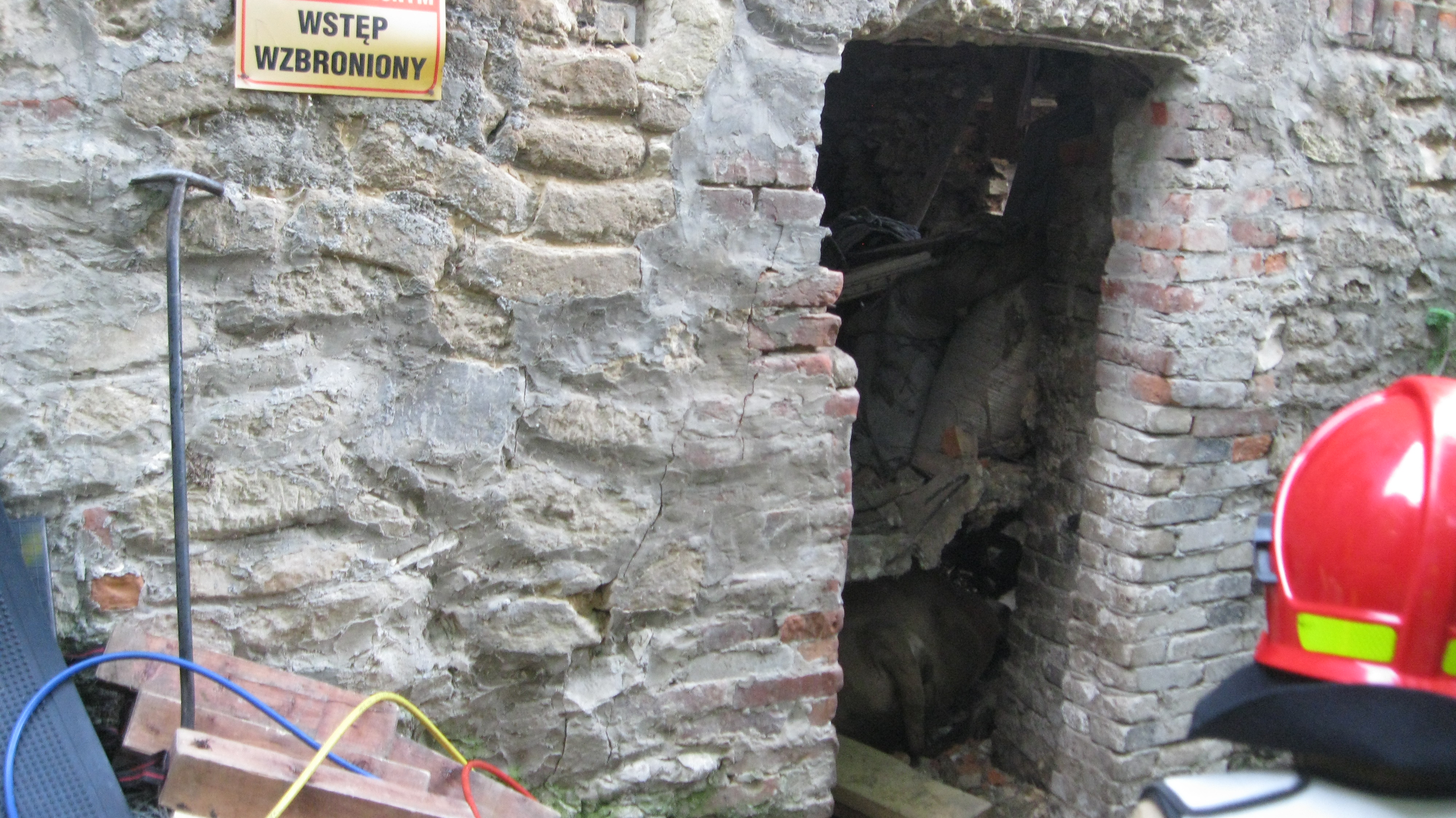 W wyniku rozpoznania na miejscu ustalono, że doszło do zawalenia części betonowego stropu ze ścianą działową. Górna część budynku stanowiła część mieszkalną, natomiast w suterynach hodowane było bydło opasowe. W wyniku zawalenia przyciśnięta została jedna osoba oraz zwierzęta znajdujące się w tej części.