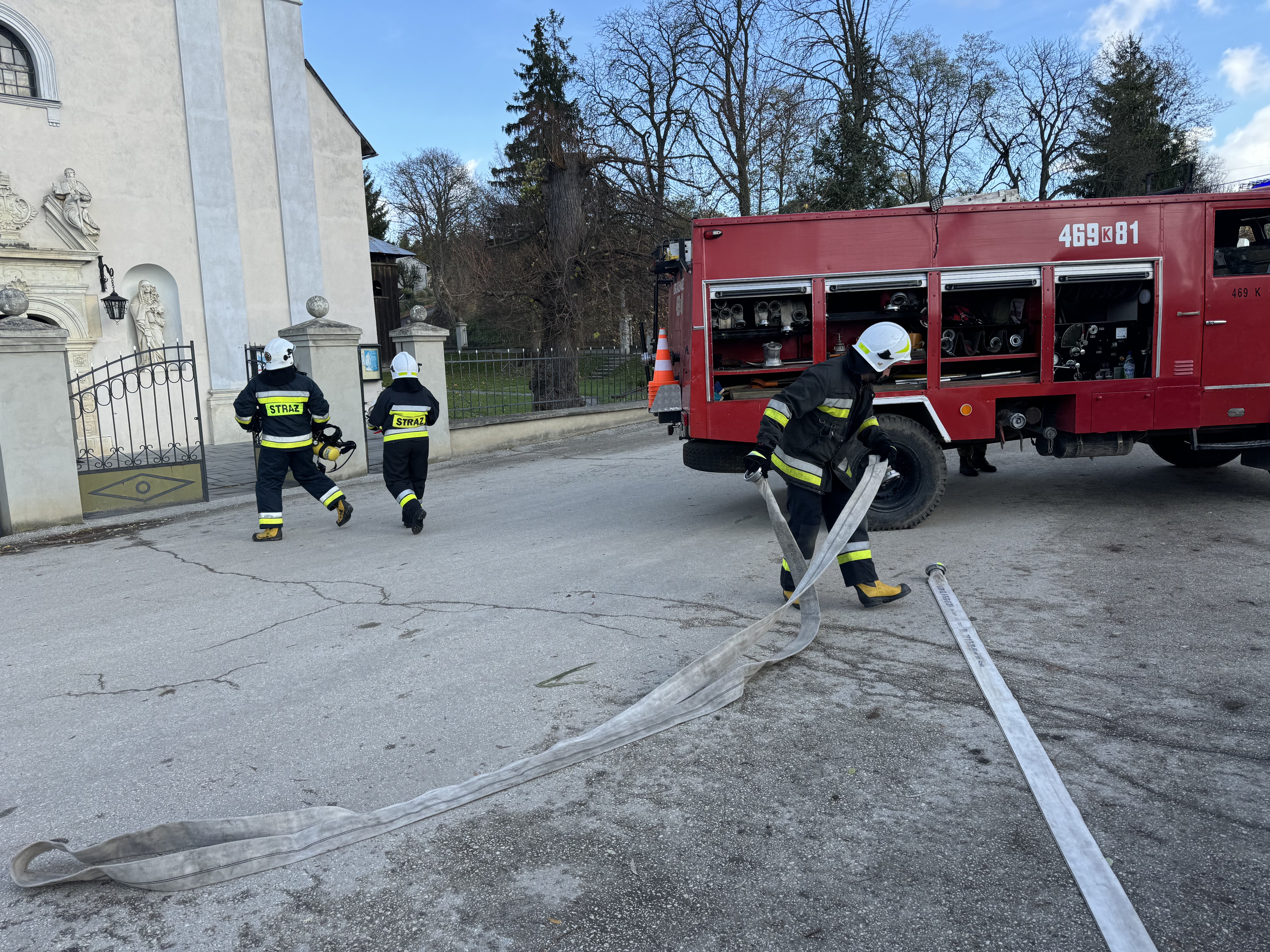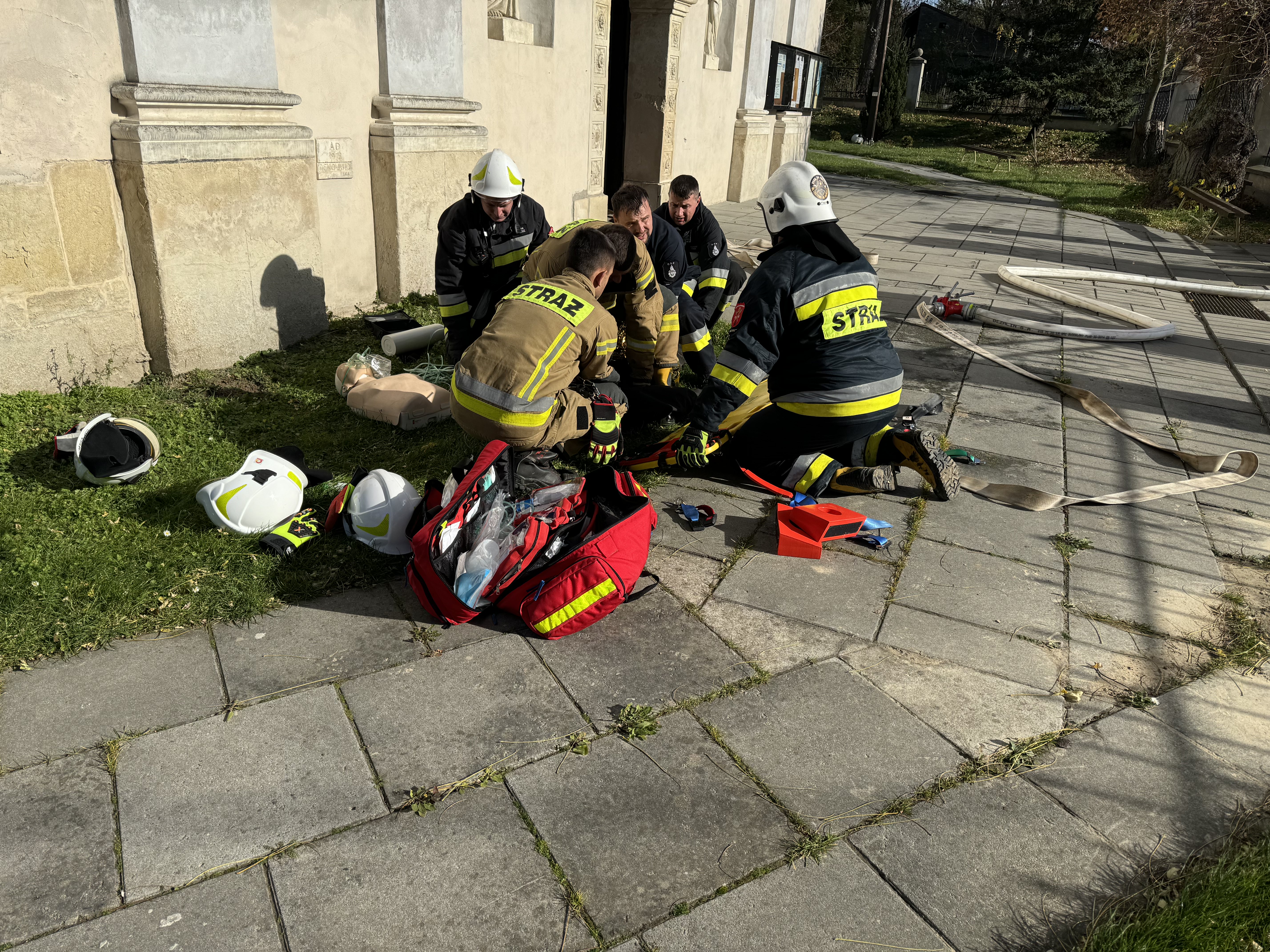 a następnie udzielenie im kwalifikowanej pierwszej pomocy. Z uwagi na dynamiczny rozwój pożaru oraz konieczność zapewnienia ciągłego dopływu wody, scenariusz ćwiczeń zakładał zasilanie wodne z pobliskiego stawu przy kościele.