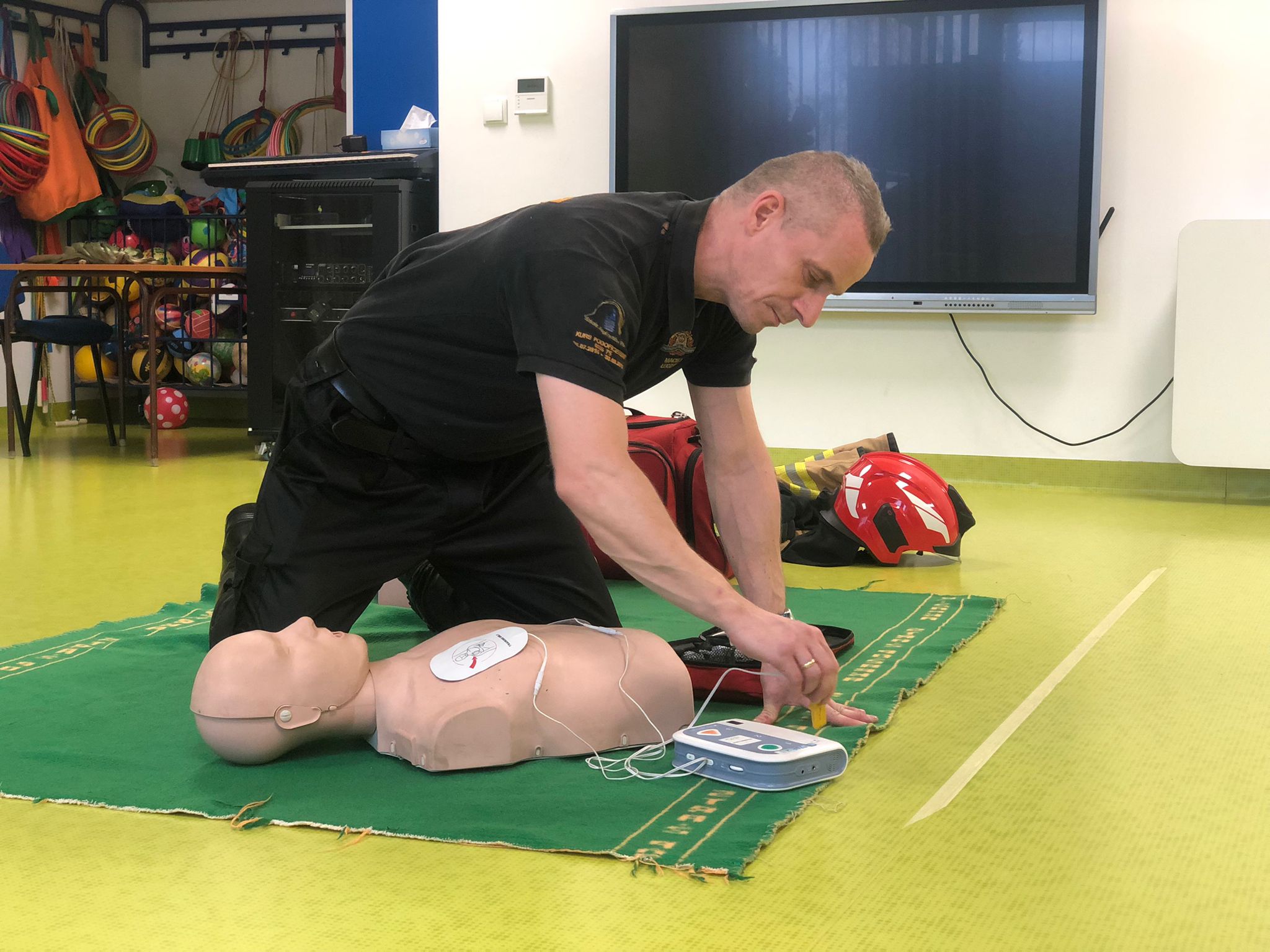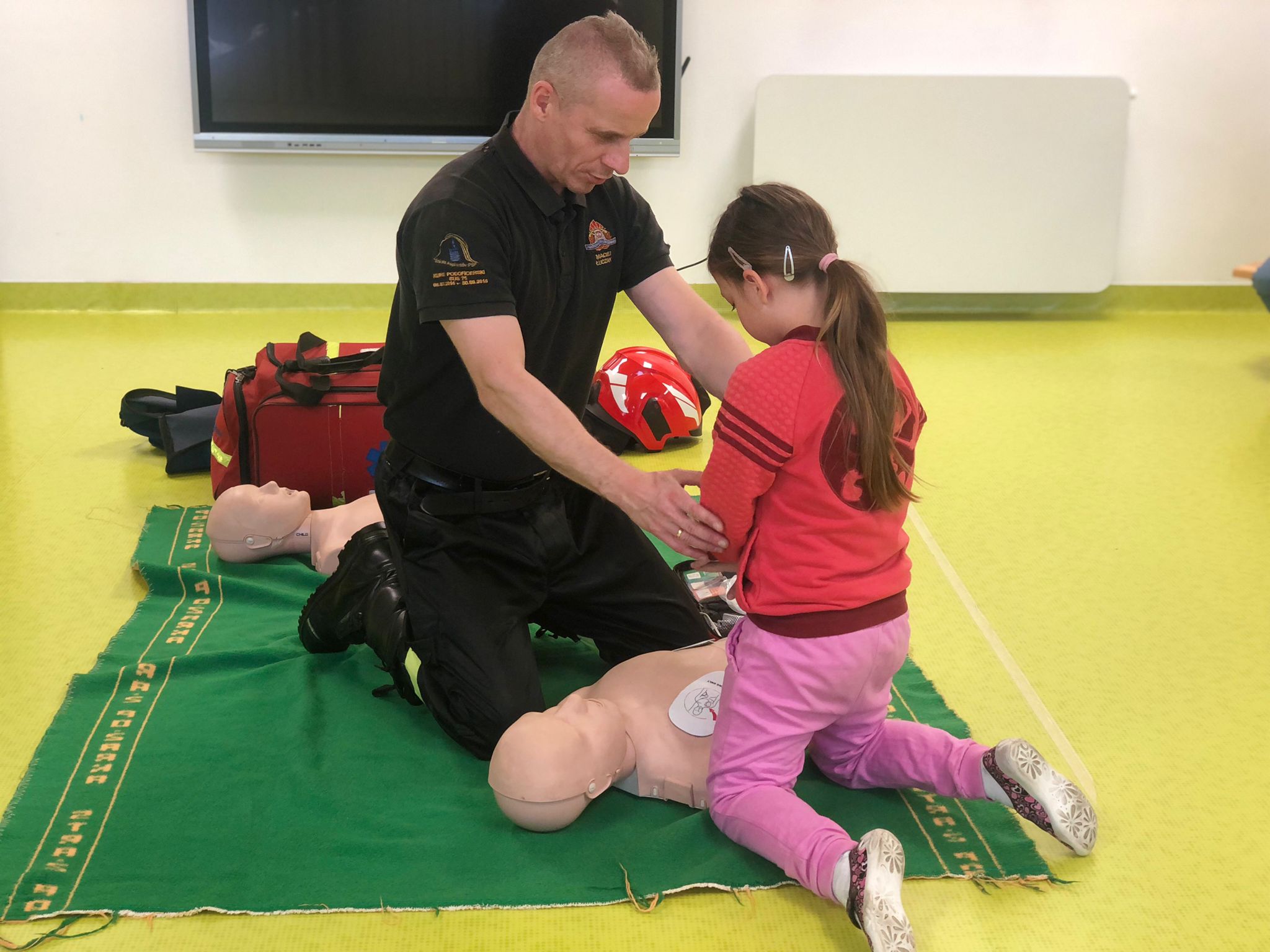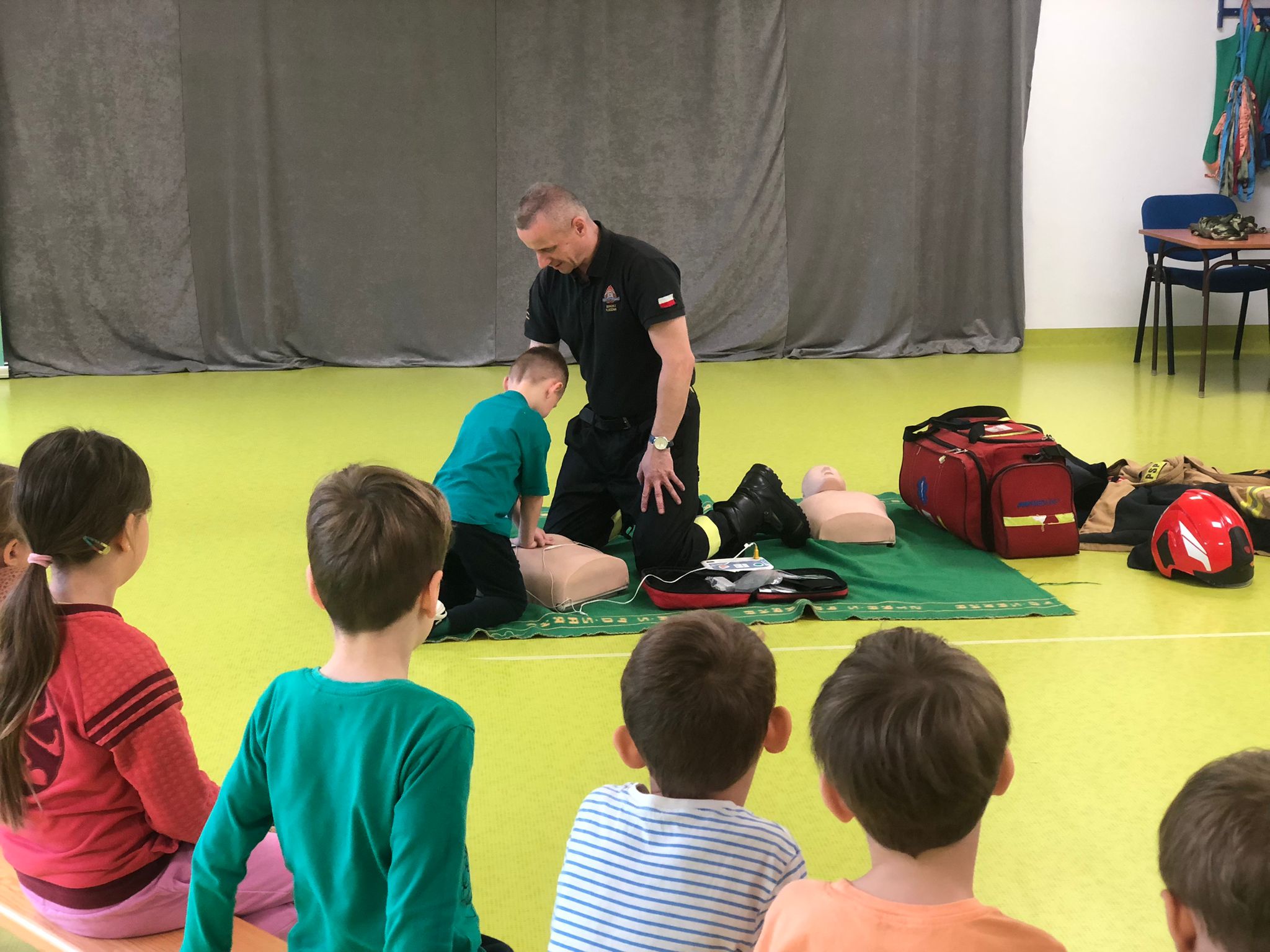 Podczas spotkania dzieci miały okazję wziąć czynny udział w realizacji zadań z pierwszej pomocy. Dowiedziały się w jakich okolicznościach można wezwać straż pożarną oraz uczyły się jak szybko i skutecznie alarmować służby poprzez ogólnoeuropejski numer alarmowy „112”.