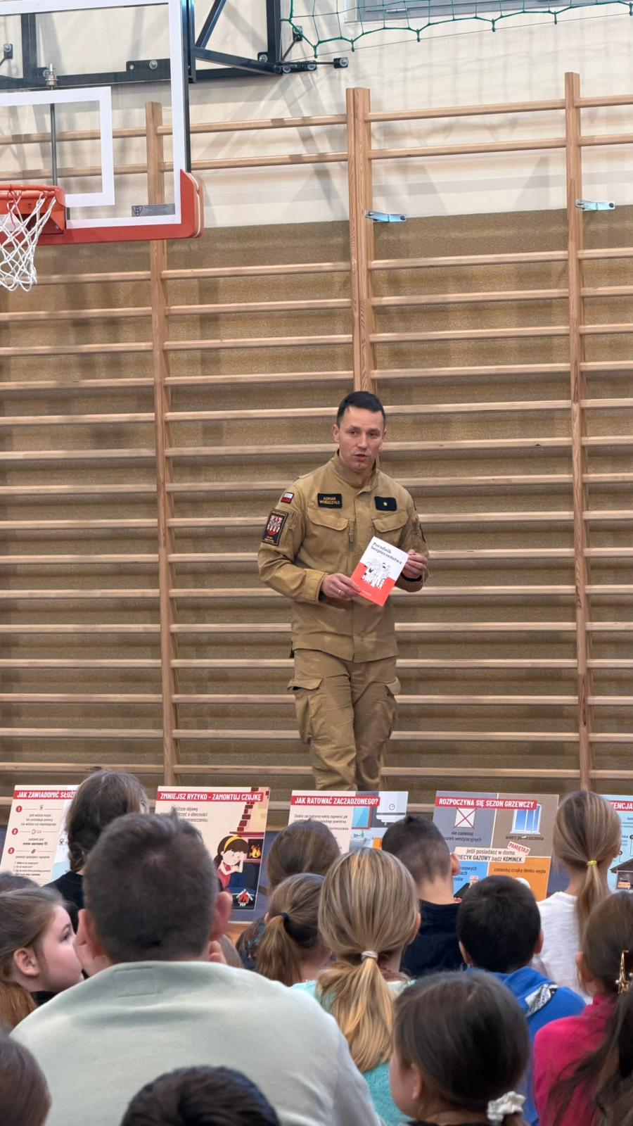 Na początku spotkania strażacy zaprezentowali uczniom poradnik bezpieczeństwa, w którym omówili podstawowe zasady dbania o zdrowie i życie w różnych sytuacjach zagrożenia.
