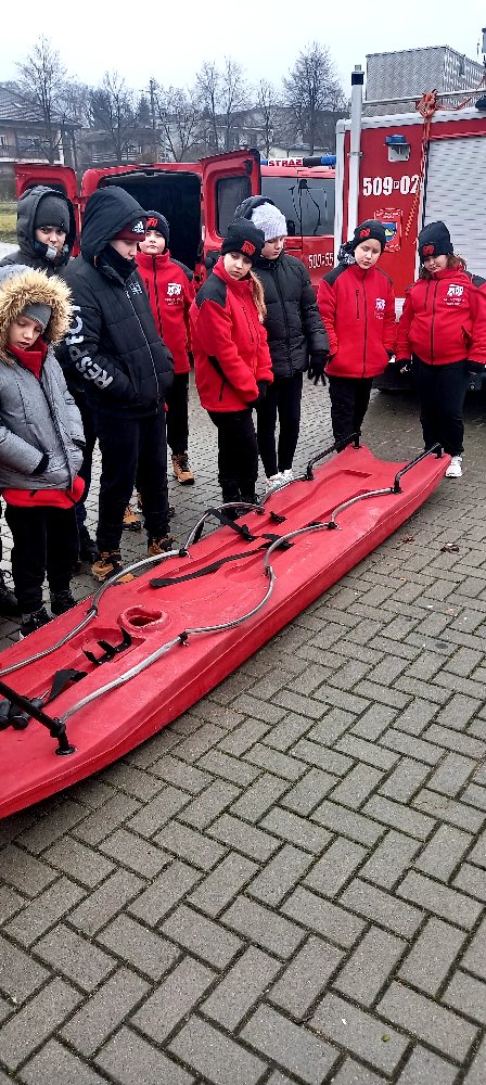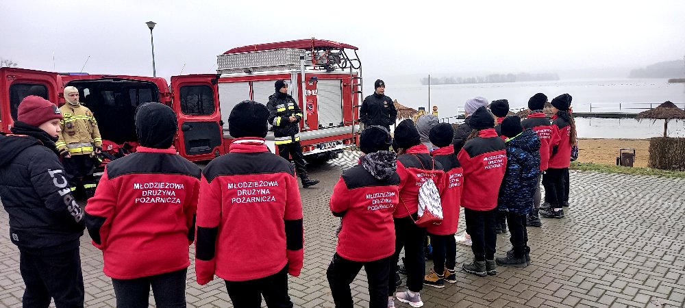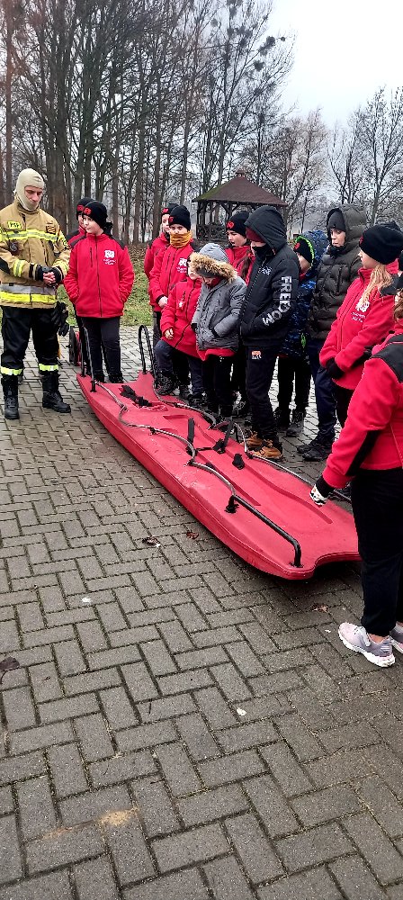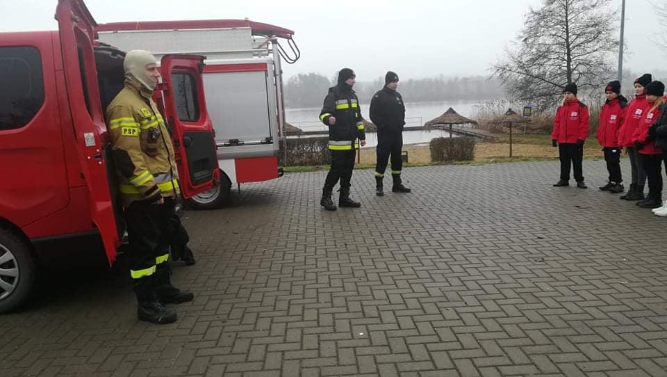 Strażacy porozmawiali z dziećmi i młodzieżą na temat źródeł zagrożeń w okresie zimowym, zwrócili uwagę na bezpieczną zabawę. Następnie zaprezentowano sprzęt, który jest wykorzystywany przez straż pożarną podczas działań na wodzie i lodzie.