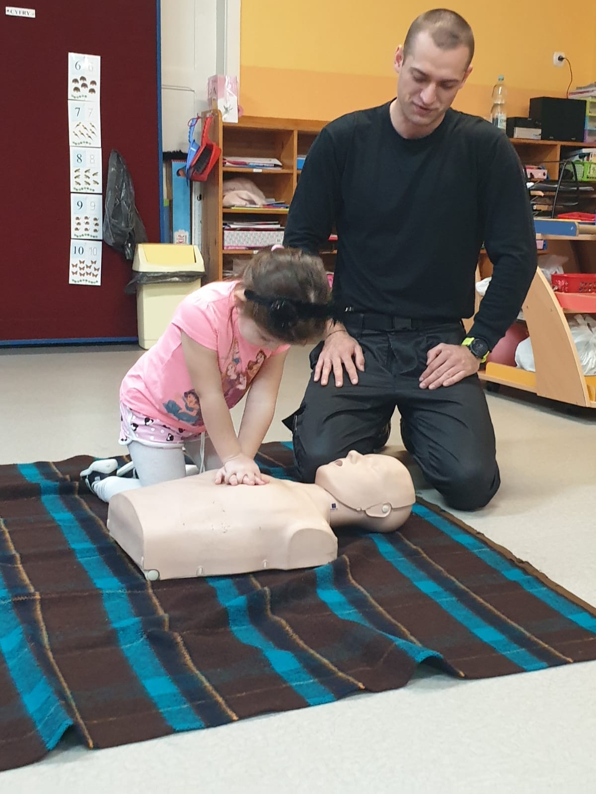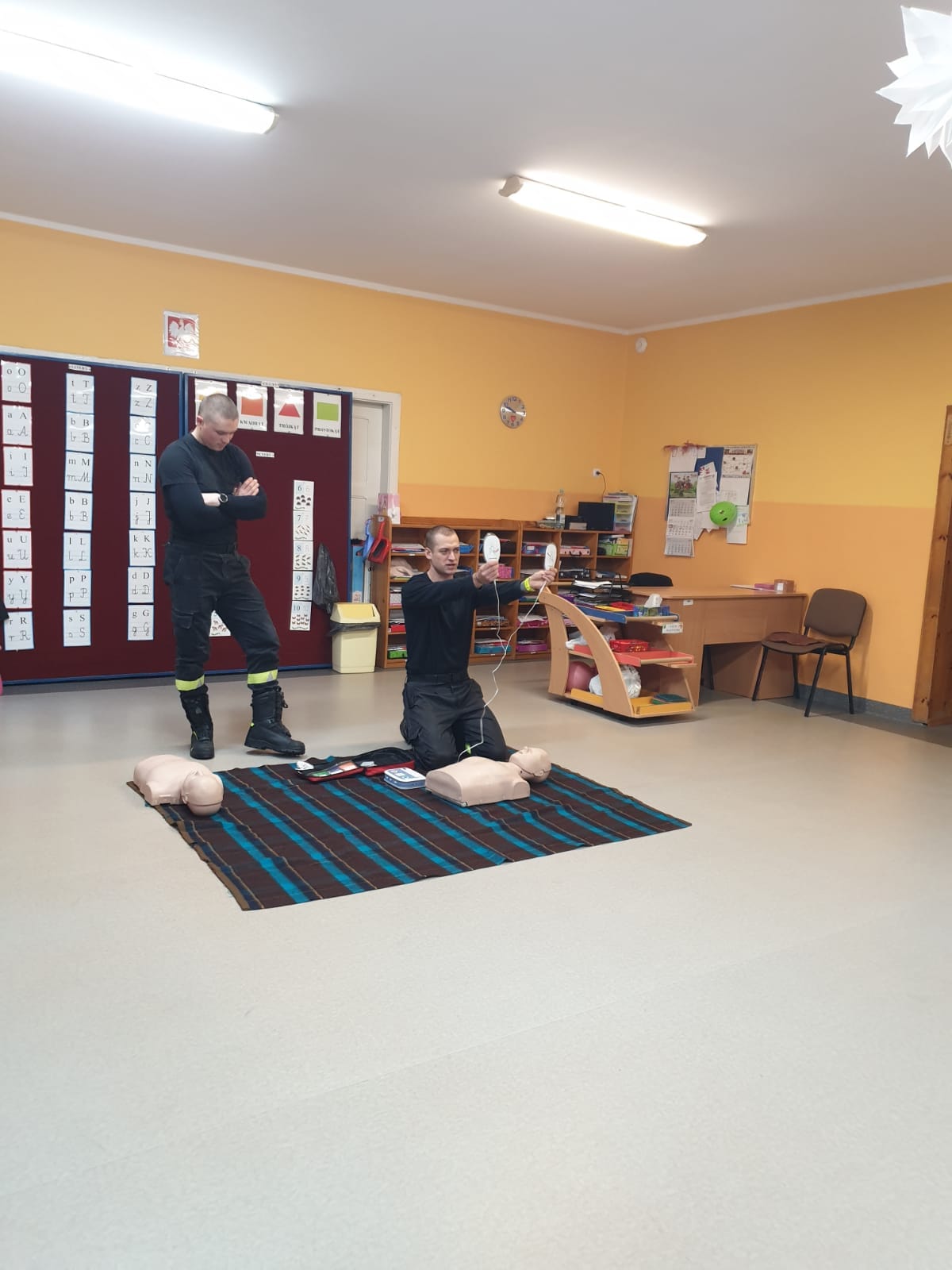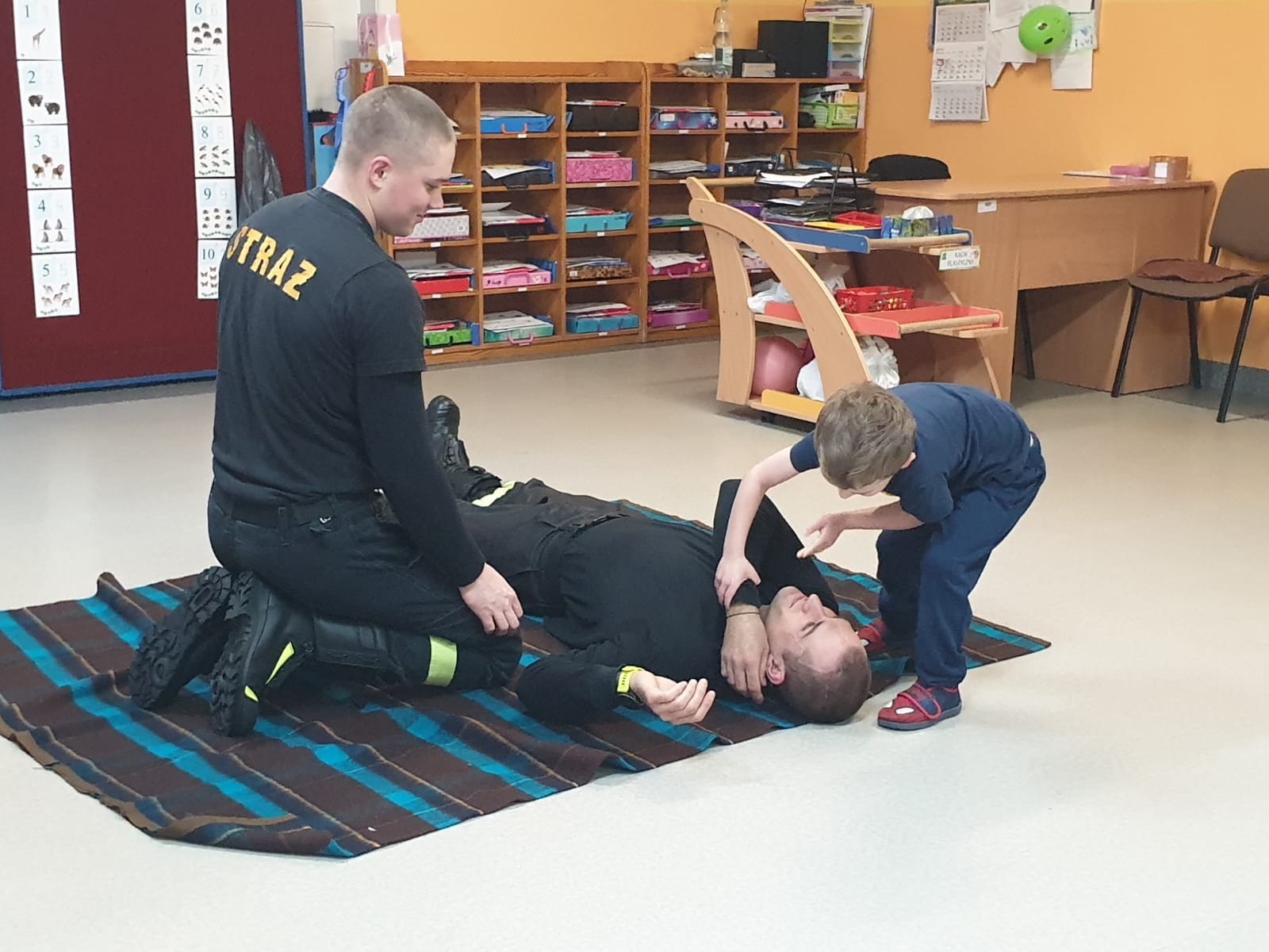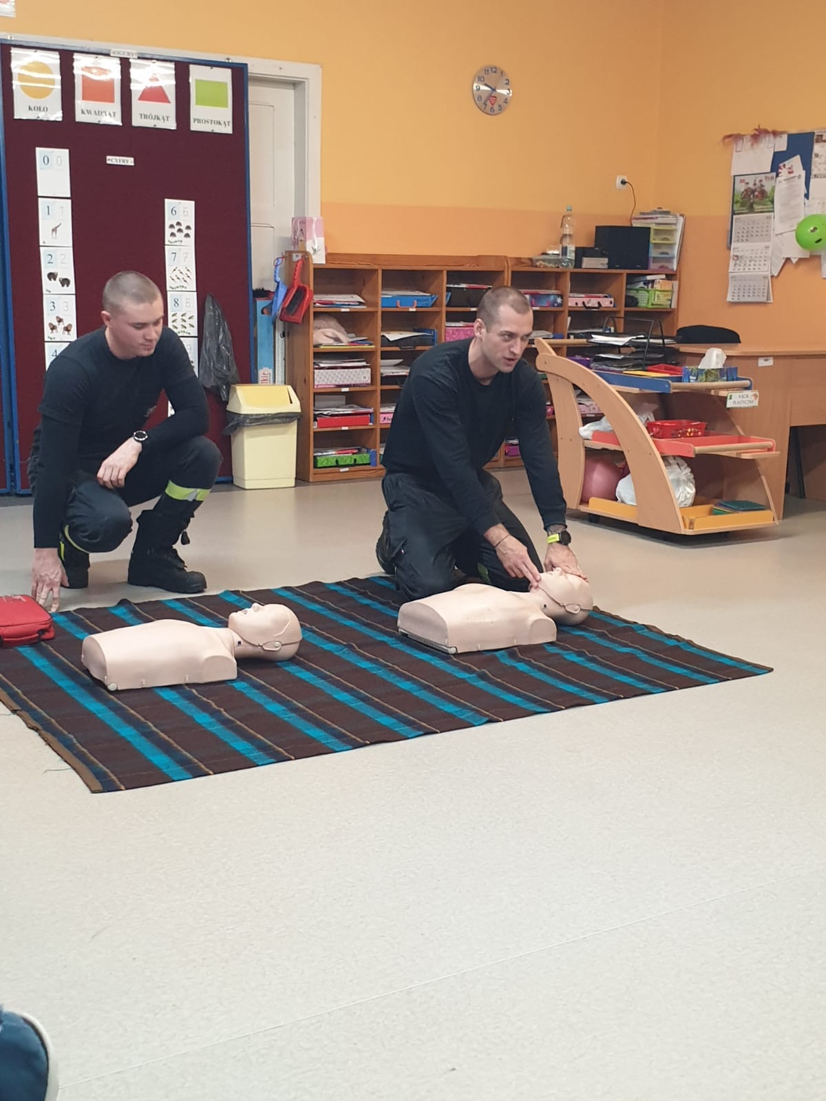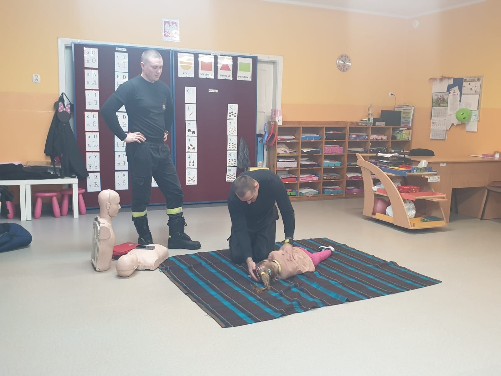 Funkcjonariusze podczas swojej obecności w przedszkolu, przeprowadzili zajęcia z zakresu udzielania pierwszej pomocy. W prosty i ciekawy sposób przedstawili w jaki sposób należy postępować z osobami wymagającymi pomocy medycznej. Dzieci uczyły się na fantomach jak wykonywać poprawnie resustytację krążeniowo – oddechową, poznały co to jest i jak wykonać pozycję boczną ustaloną u poszkodowanych oraz dowiedziały się jak działa automatyczny defibrylator AED. Ponadto, nasze maluchy uczyły się jak wzywać pomoc z wykorzystaniem numer alarmowego „112” i uczyły się jak reagować gdy występuje zagrożenie dla życia lub mienia.