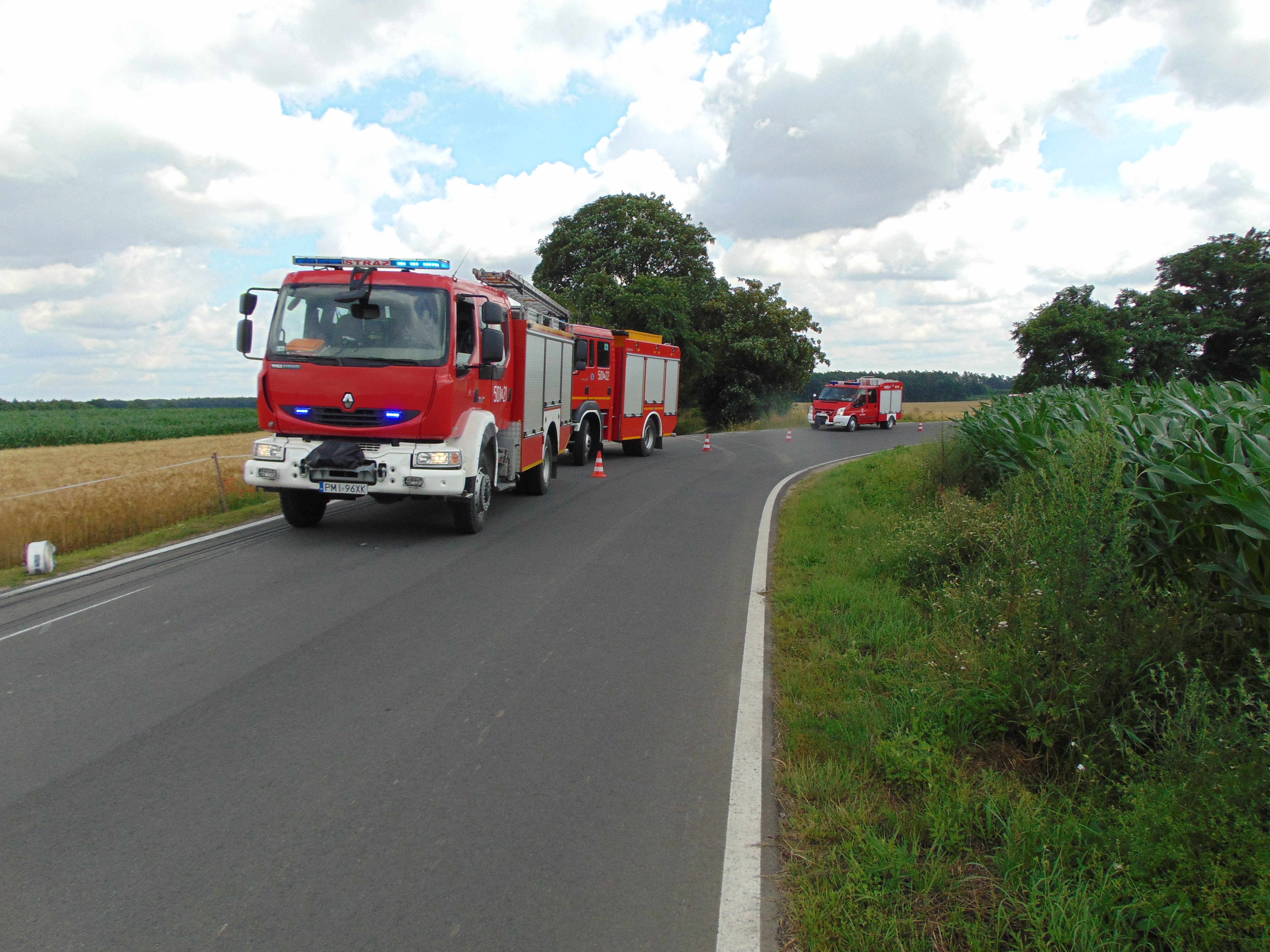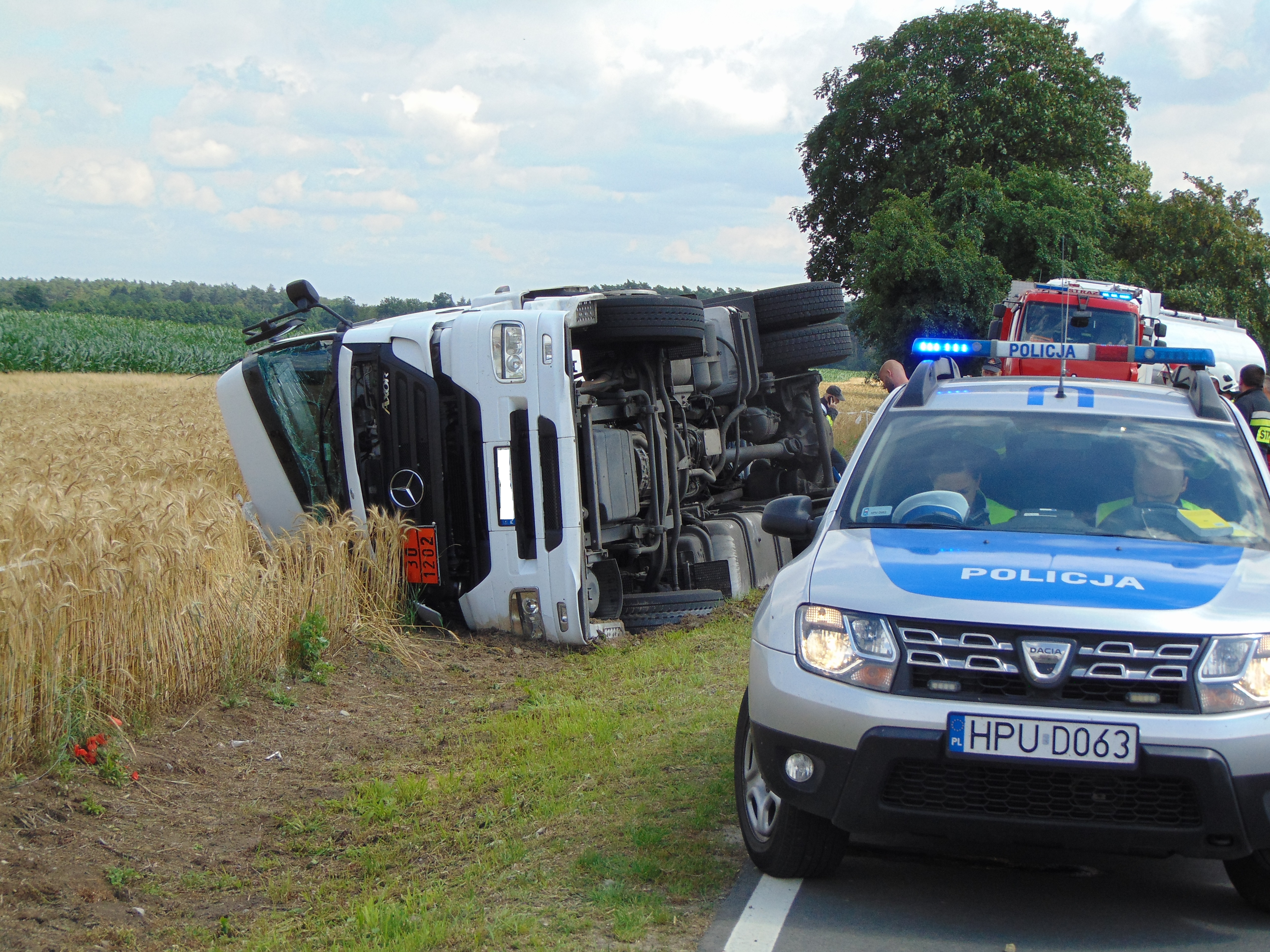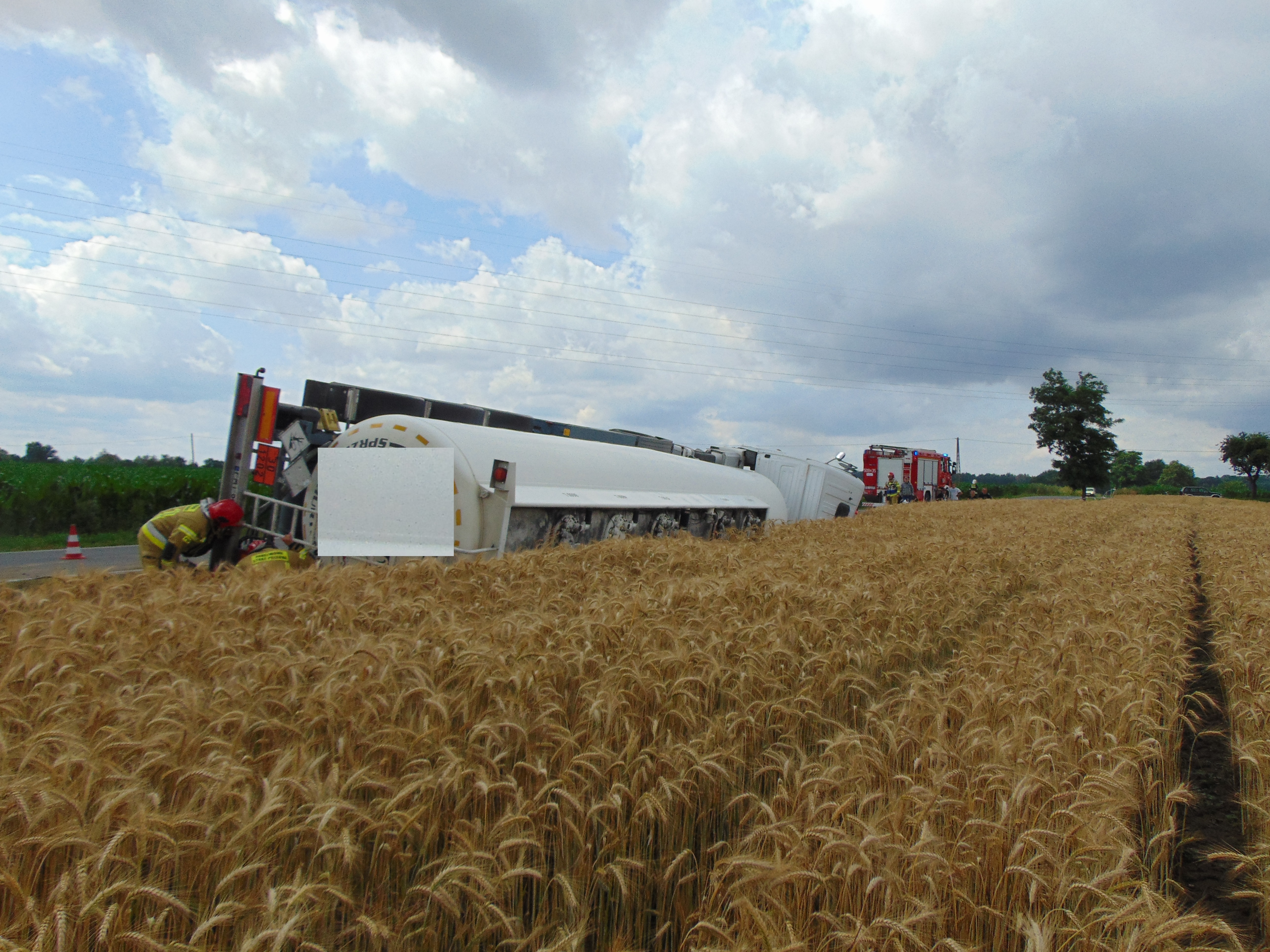 Jak okazało się po dojeździe na miejsce zdarzenia, na łuku drogi powiatowej z drogi wypadł ciągnik siodłowy z naczepą (cysterną), w której znajdowało się ok. 19 tyś. litrów oleju napędowego. Na szczęście nie doszło do wycieku. Kierowca samochodu ciężarowego został przebadany przez przybyły zespół ratownictwa medycznego i nie wymagał przewiezienia do szpitala.