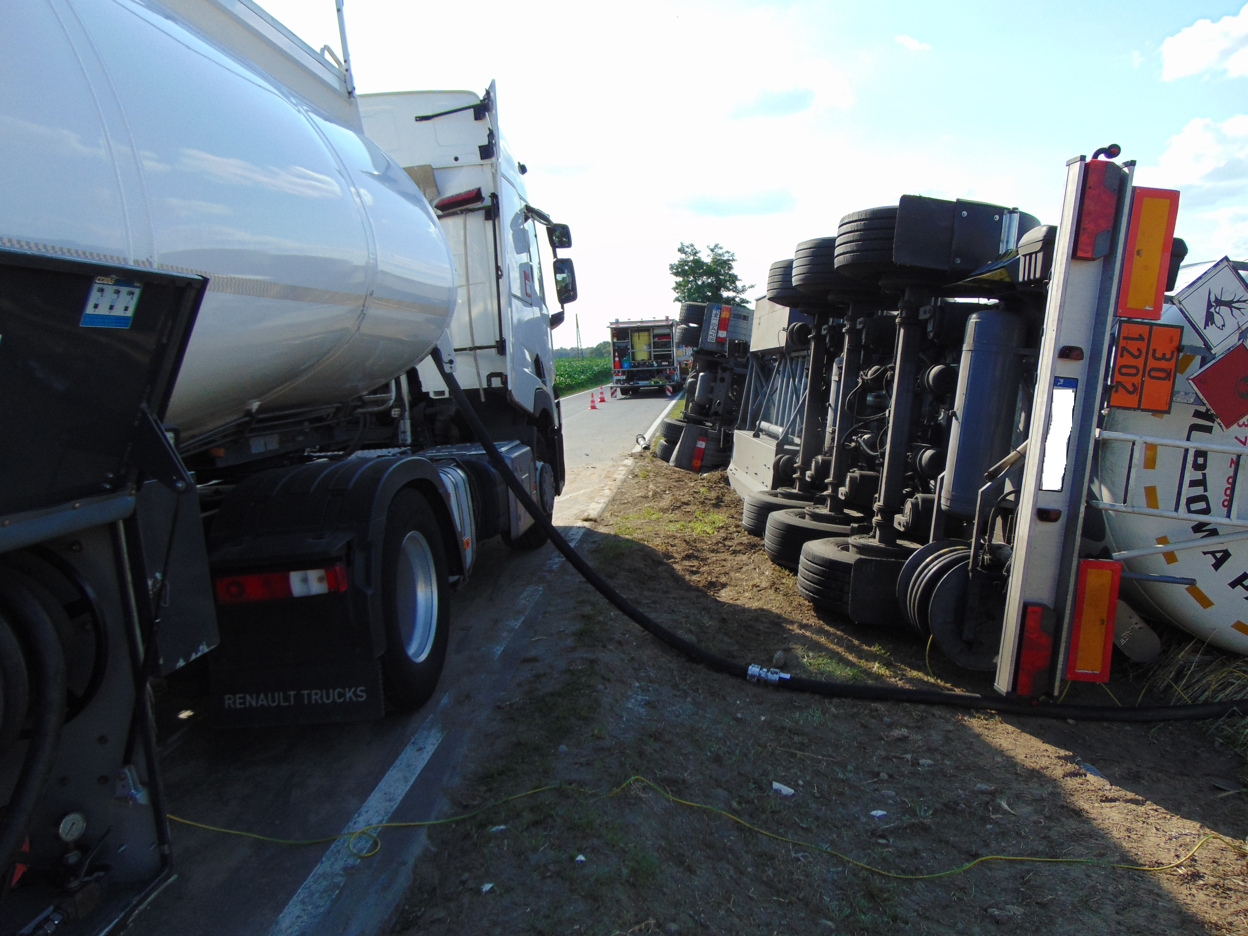 Na miejsce zdarzenia przybyła specjalistyczna grupa ratownictwa chemiczno – ekologicznego z JRG 2 w Gorzowie Wielkopolskim, która przepompowała olej napędowy do podstawionej cysterny. Po przepompowaniu, przy użyciu dwóch dźwigów i holownika ciągnik siodłowy i naczepa zostały postawione na koła.