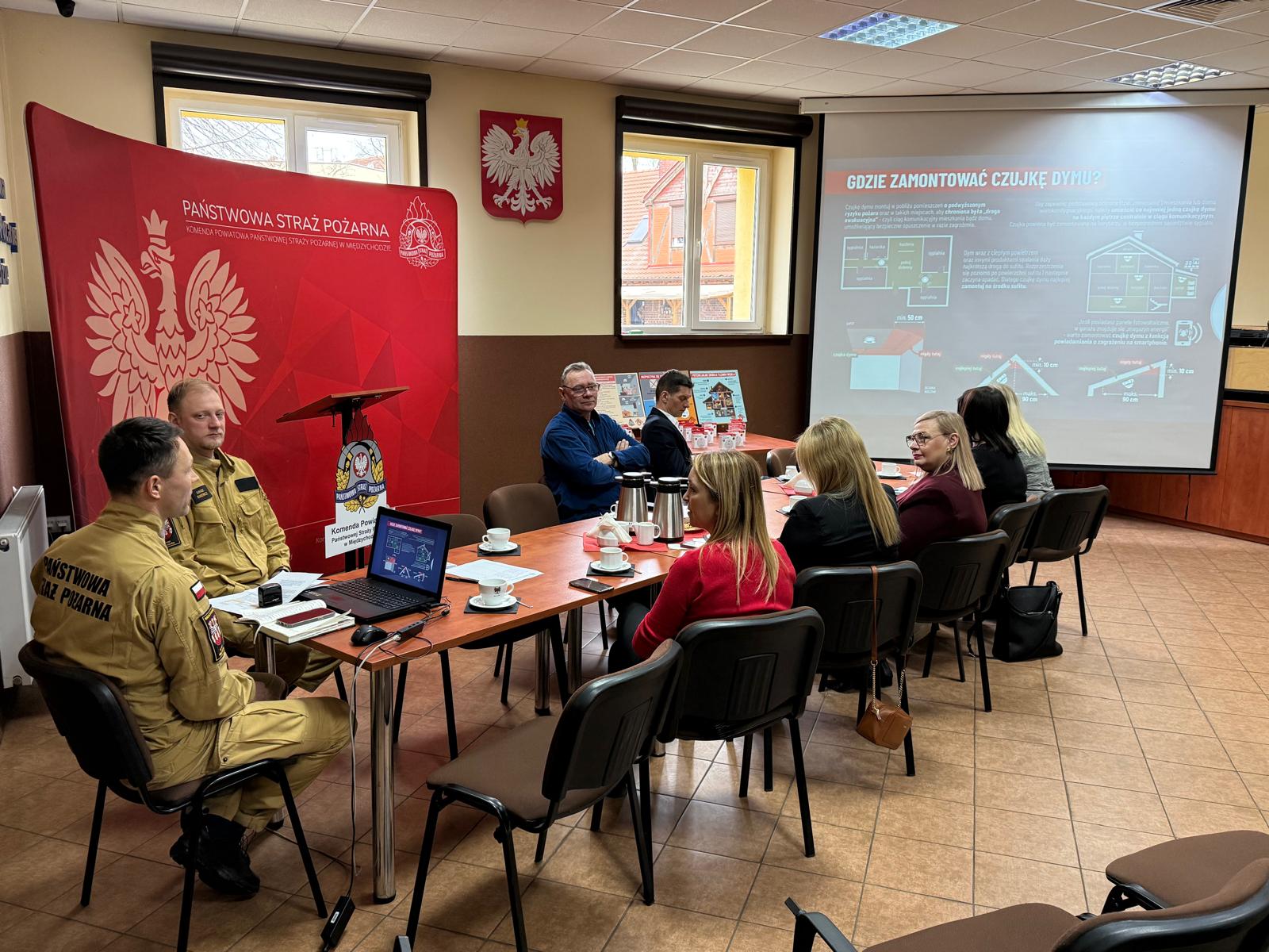 16 lutego 2026 r. w siedzibie Komendy Powiatowej Państwowej Straży Pożarnej w Międzychodzie odbyło się spotkanie z przedstawicielami Urzędów Miejsko-Gminnych, Powiatowego Centrum Pomocy Rodzinie oraz Ośrodków Pomocy Społecznej z powiatu międzychodzkiego, podczas którego omówiono szczegóły dystrybucji czujek.