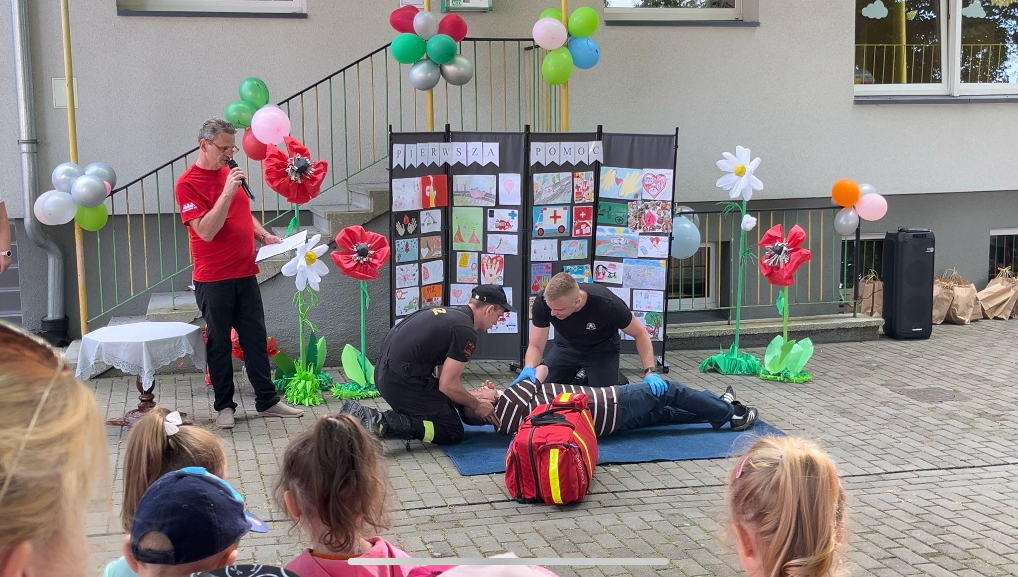 Podczas szkolenia z pierwszej pomocy dzieci dowiedziały się, jak prawidłowo zgłaszać sytuacje nagłe, jak rozpoznać oznaki utraty przytomności oraz jak wykonywać resuscytację krążeniowo-oddechową (RKO).