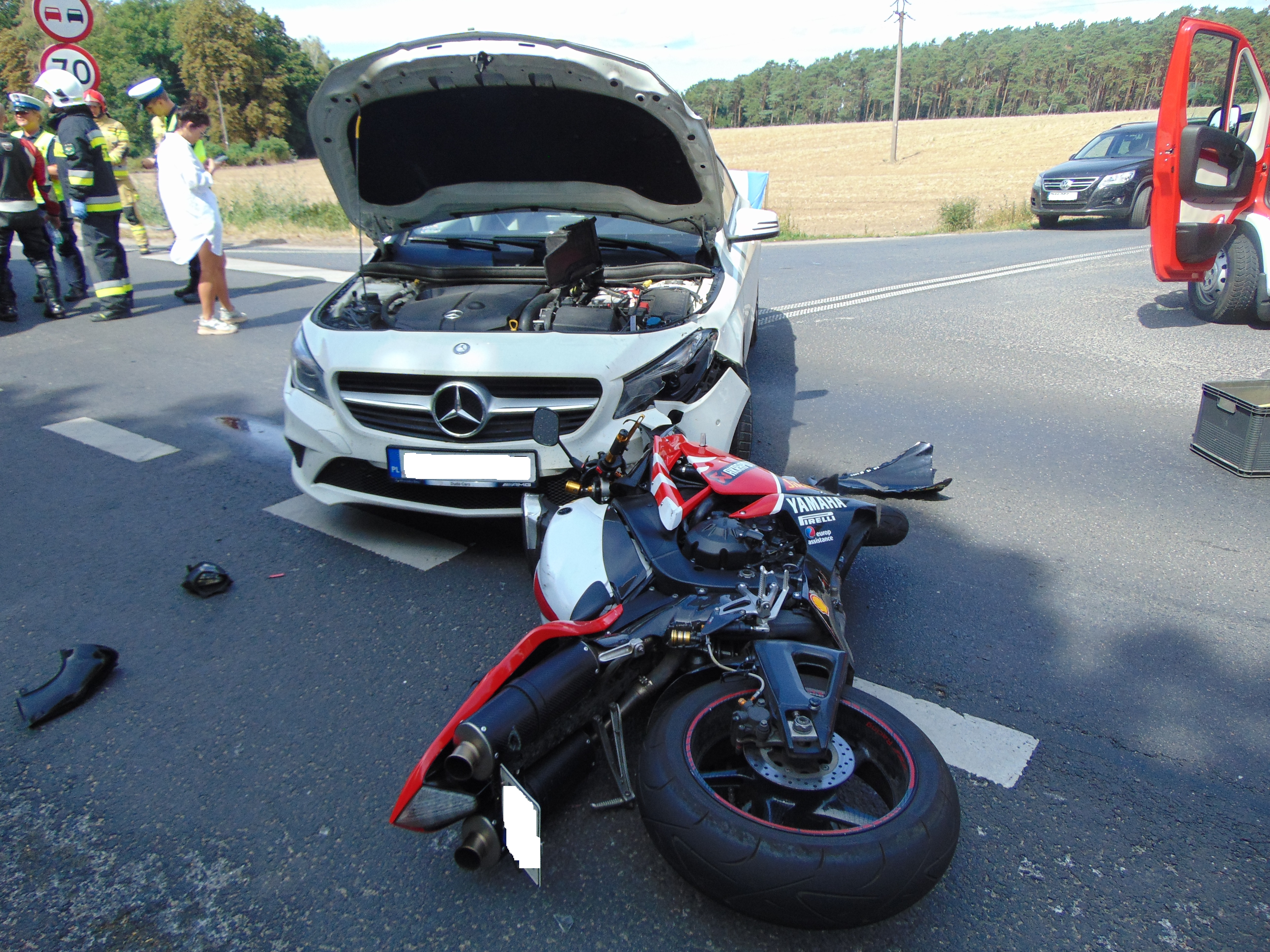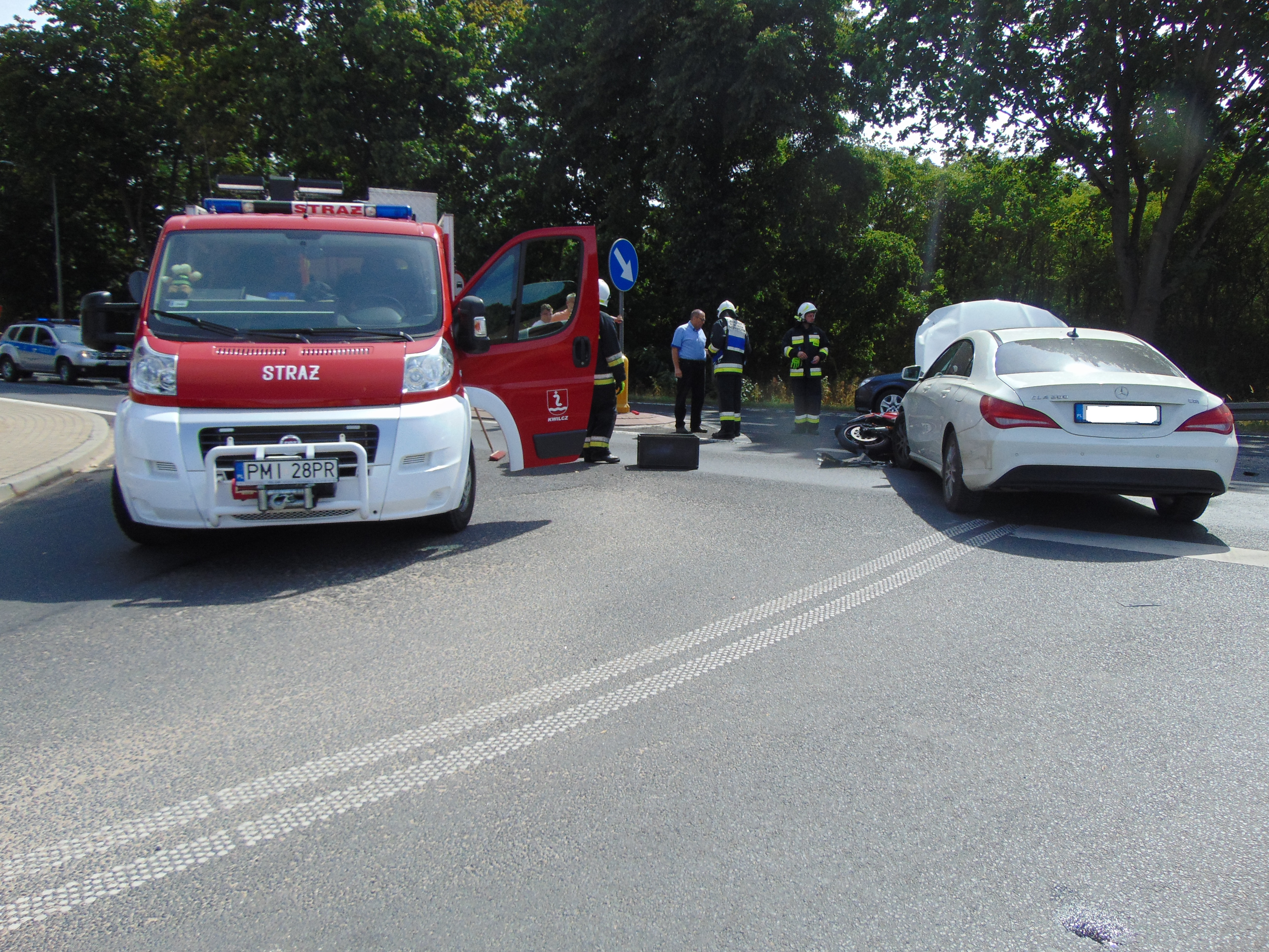 Do zdarzenia zadysponowano trzy zastępy straży pożarnych z: JRG Międzychód, OSP Kwilcz i OSP Kamionna. Strażacy zabezpieczyli miejsce zdarzenia, udzielili kwalifikowanej pierwszej pomocy kierującej samochodem osobowym. Motocykliście nic się nie stało.