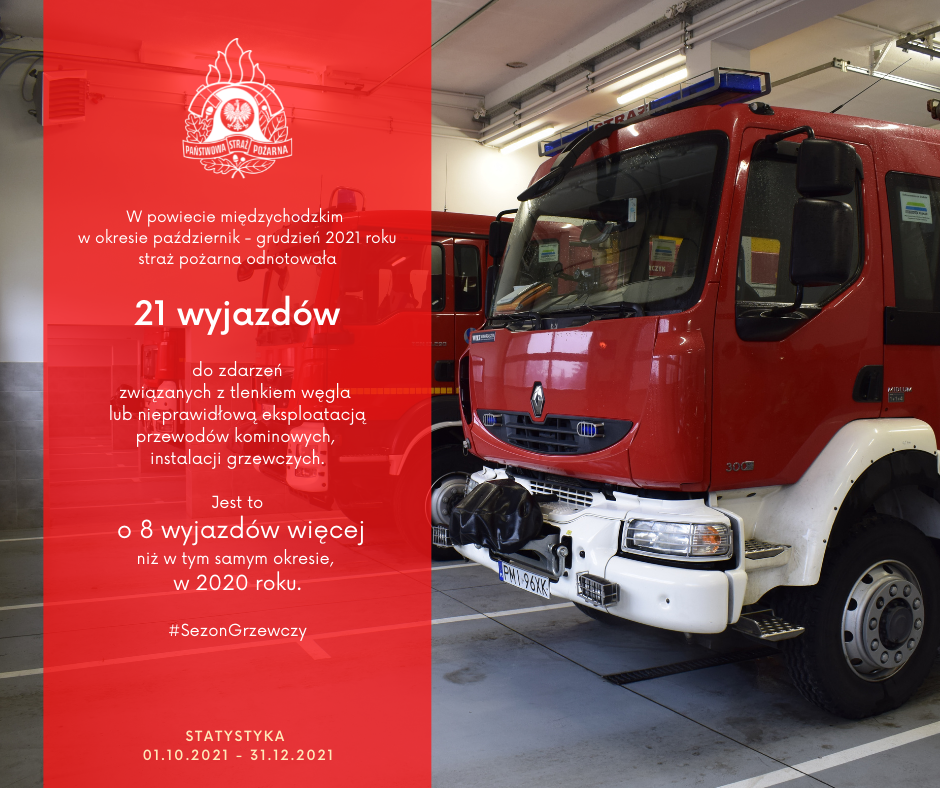 Jednostki ochrony przeciwpożarowej na terenie powiatu międzychodzkiego w okresie od 1 października 2021 roku do 31 grudnia 2021 roku wyjeżdżały do 21 zdarzeń, które dotyczyły ulatniającego się tlenku węgla (czadu) lub niesprawnego eksploatowania instalacji grzewczych, czego efektem był np. ulatniający się gaz w obiektach mieszkalnych.