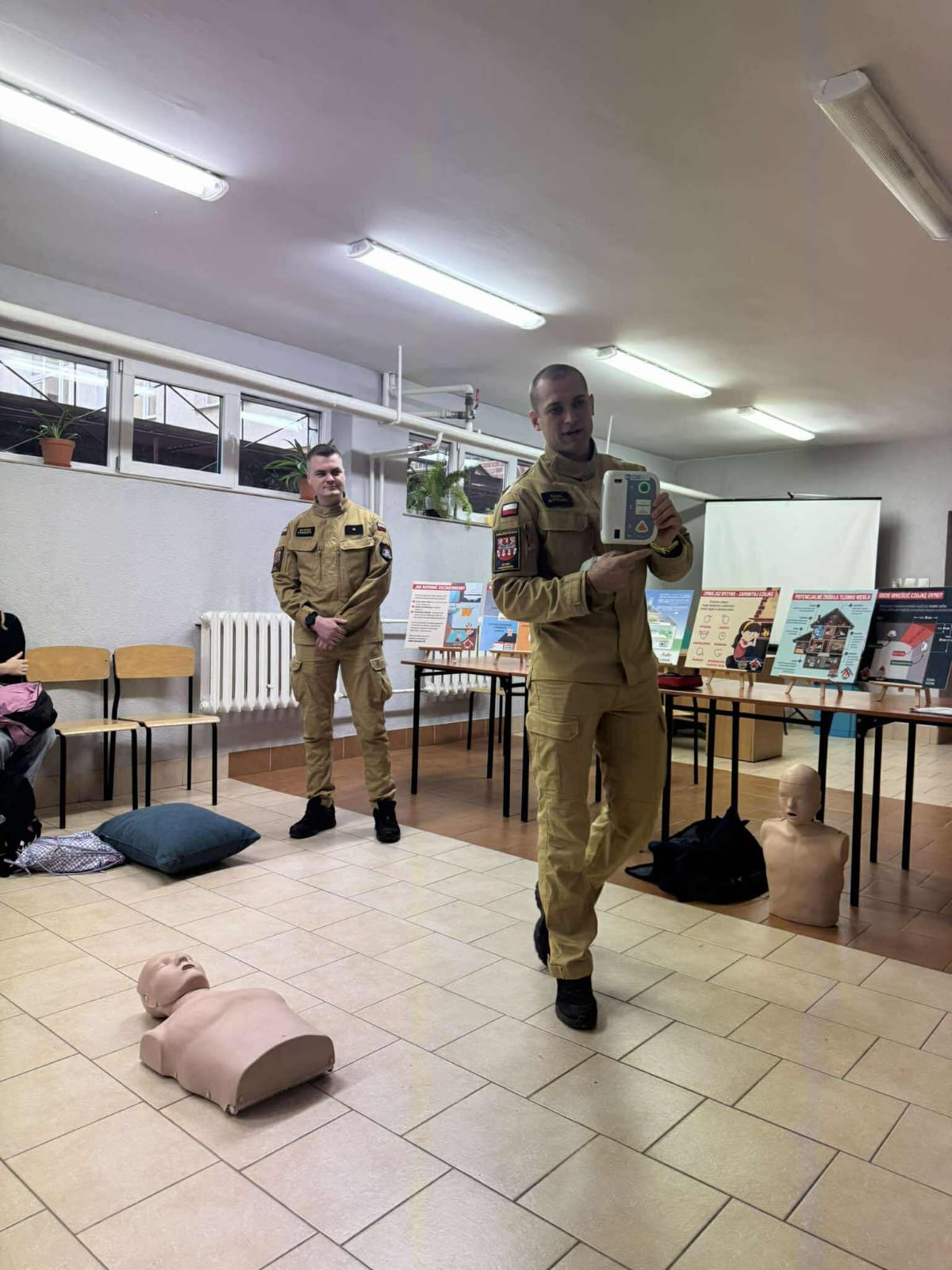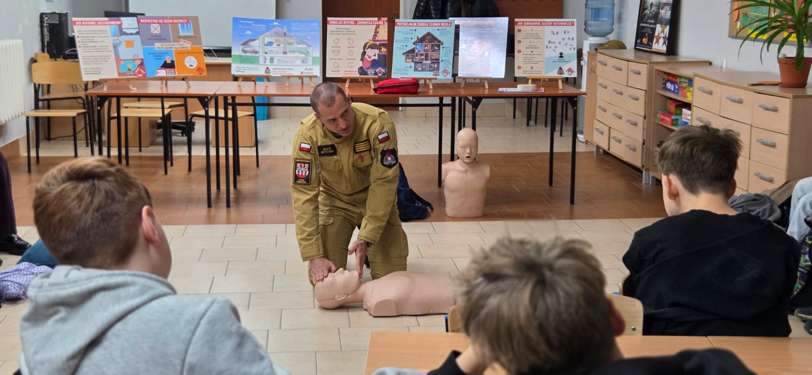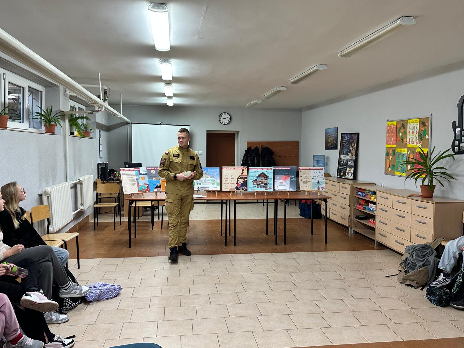 Podczas spotkania omówiono właściwości czadu, najczęstsze przyczyny zatruć, objawy zaczadzenia oraz zasady bezpiecznego użytkowania urządzeń grzewczych. Podkreślono znaczenie prawidłowej wentylacji pomieszczeń, regularnych kontroli przewodów kominowych i instalacji oraz montażu czujek czadu i dymu. Uczniom zaprezentowano także materiał edukacyjny, przygotowany jako część „Poradnika bezpieczeństwa”, zawierający najważniejsze wskazówki dotyczące ochrony przed zagrożeniami w domu. Po części teoretycznej strażacy przeprowadzili krótkie szkolenie z udzielania pierwszej pomocy za pomocą AED, podczas którego omówiono podstawowe zasady reagowania w sytuacjach zagrożenia życia.