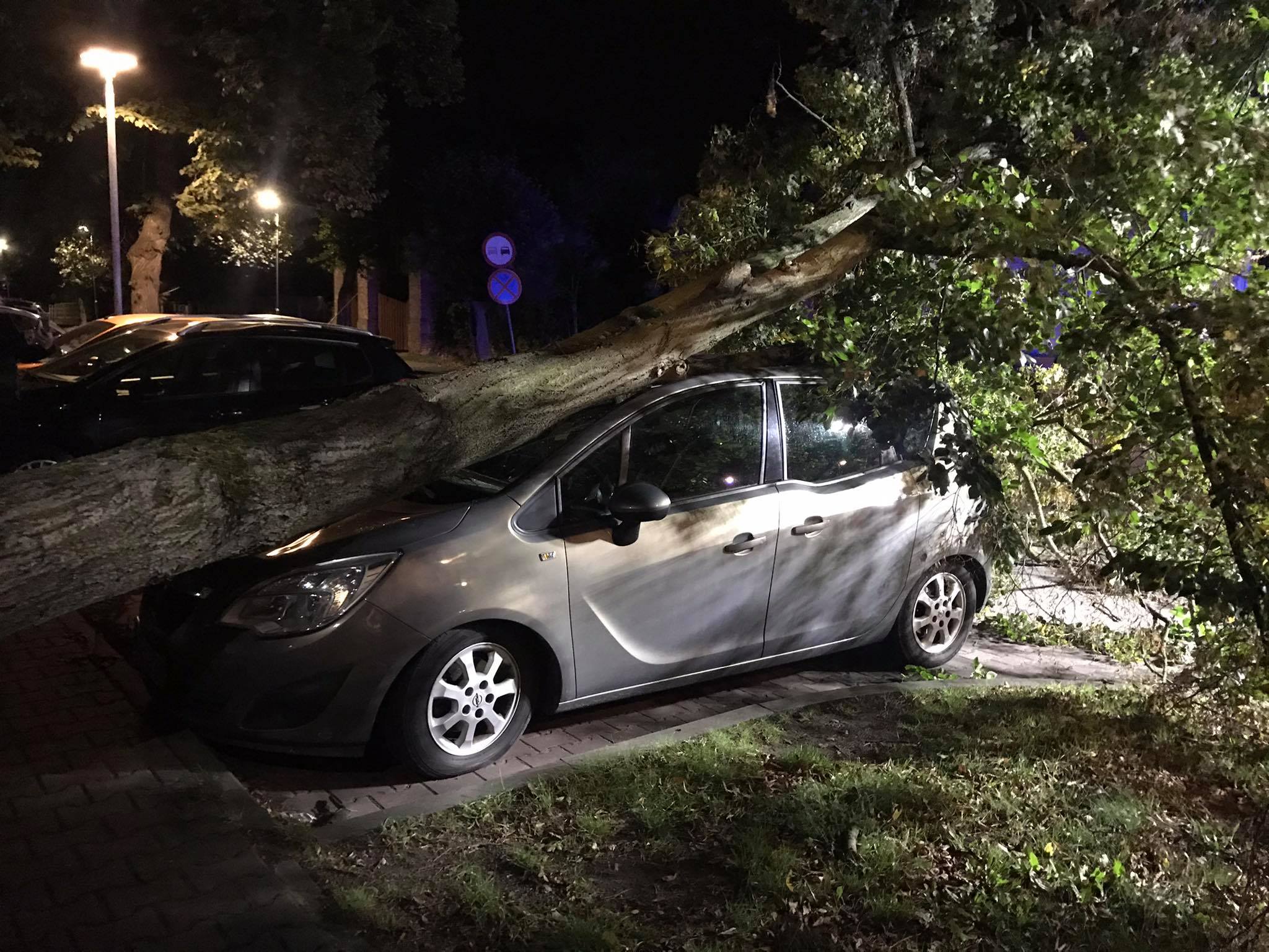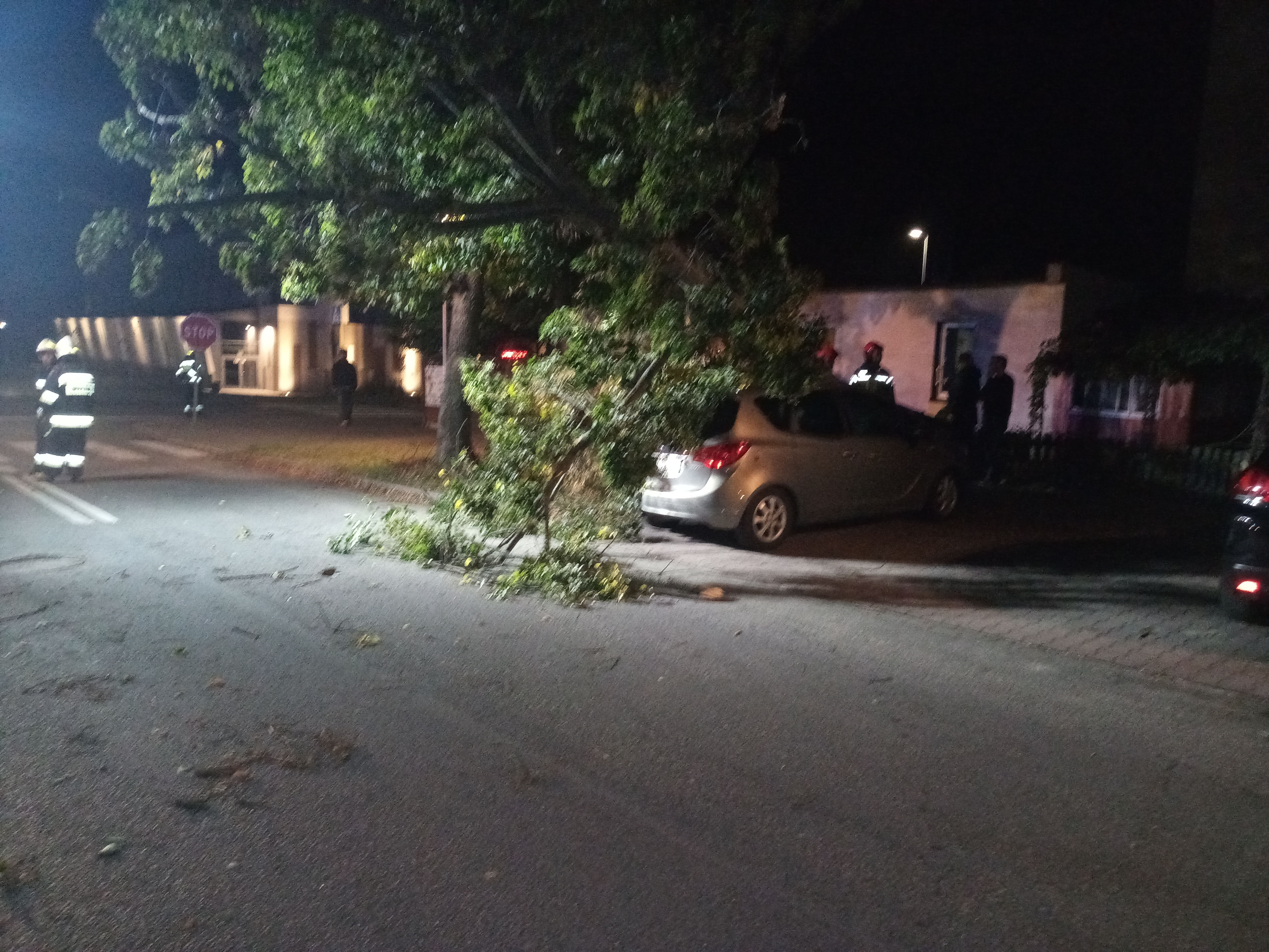 Drzewo przygniotło samochód osobowy stojący na parkingu, w działaniach brało udział JRG Międzychód i OSP Sieraków