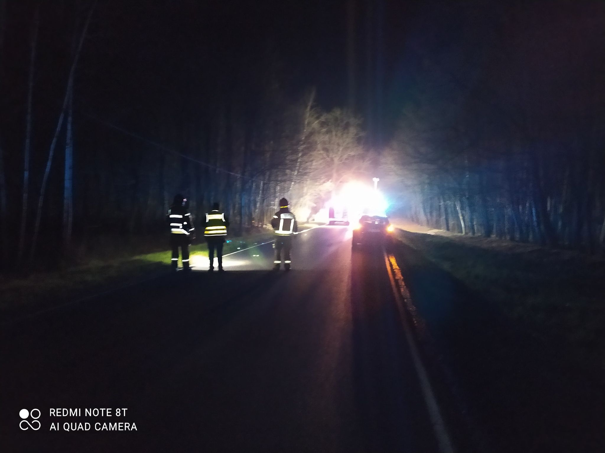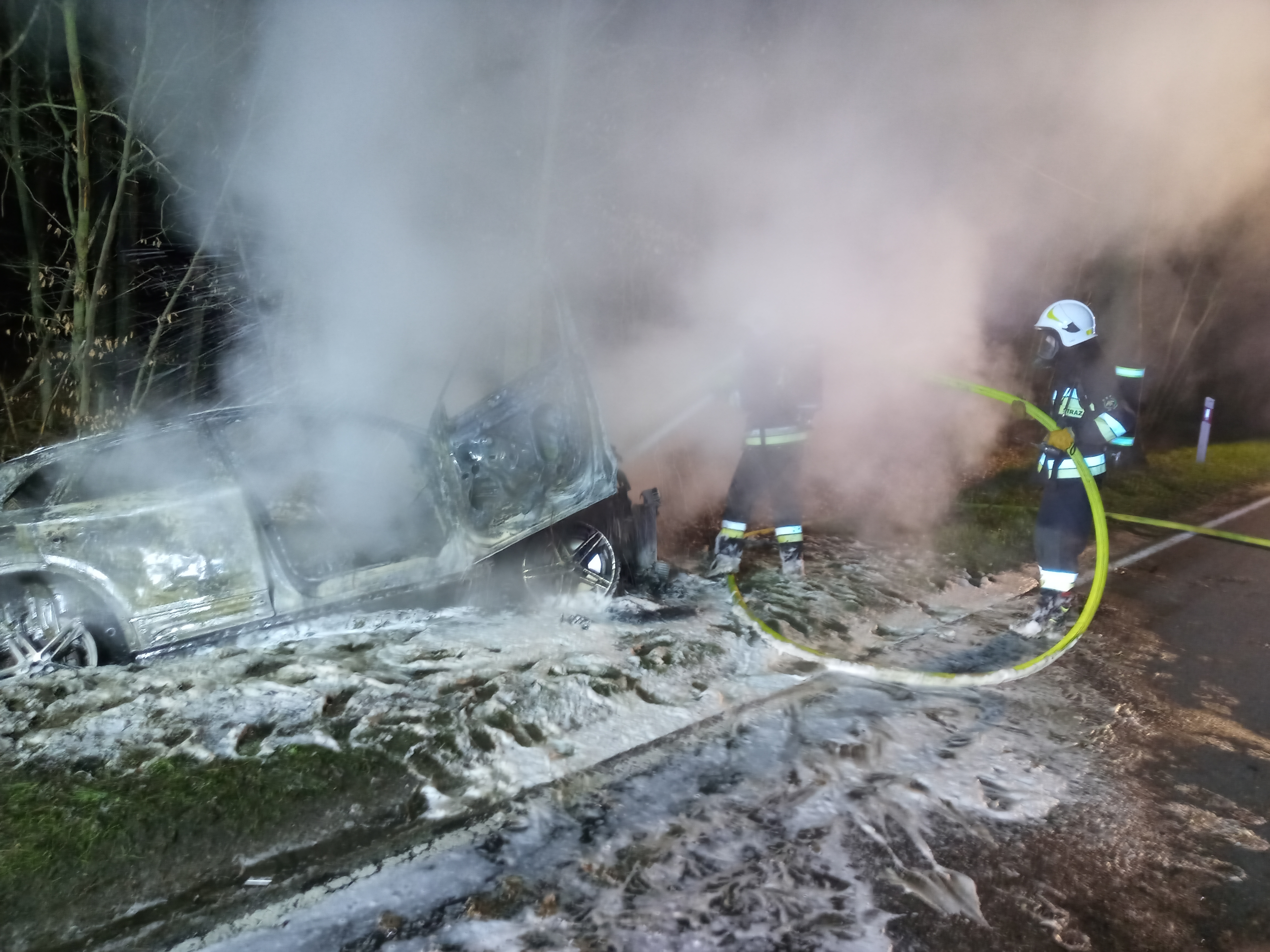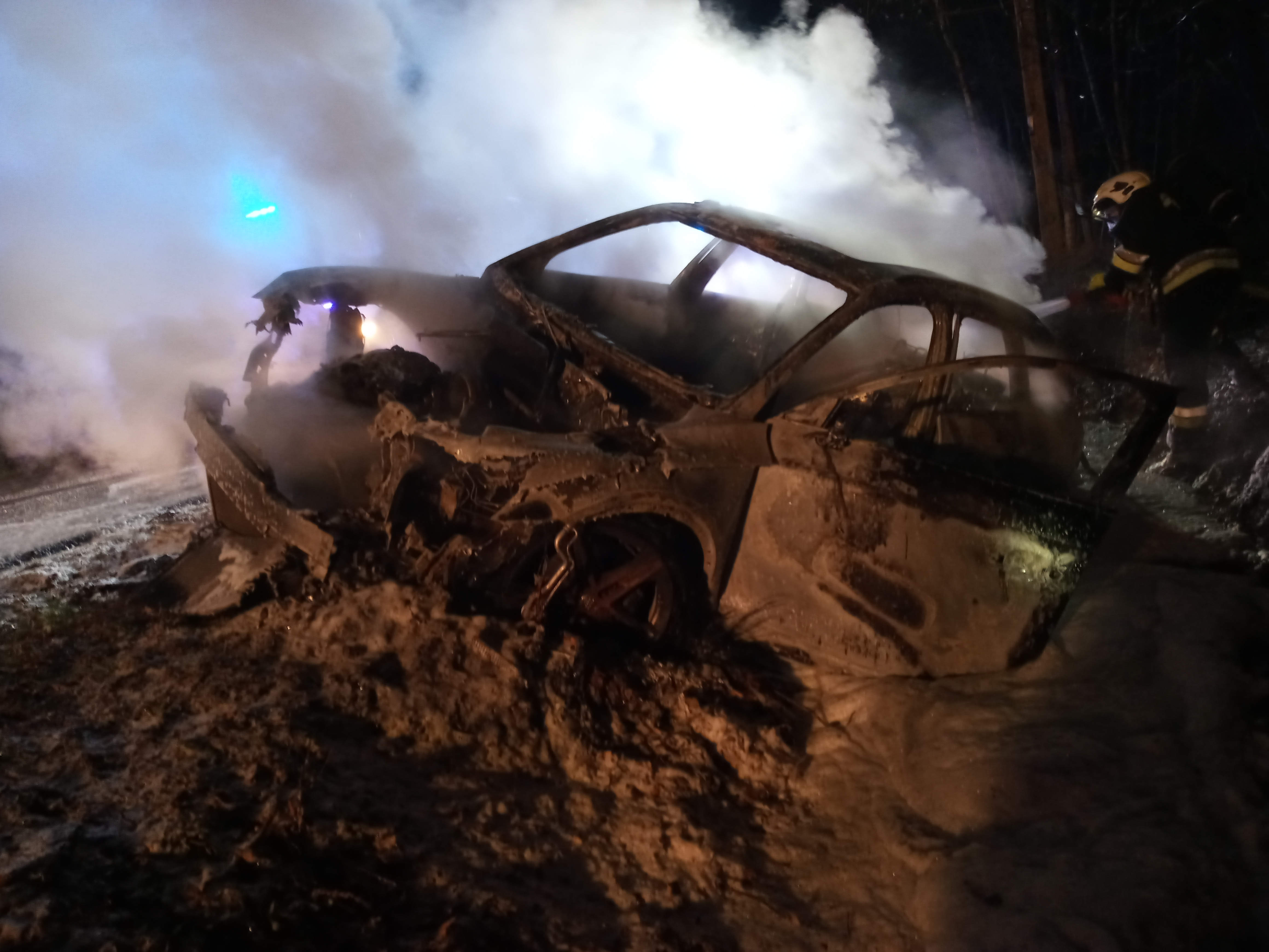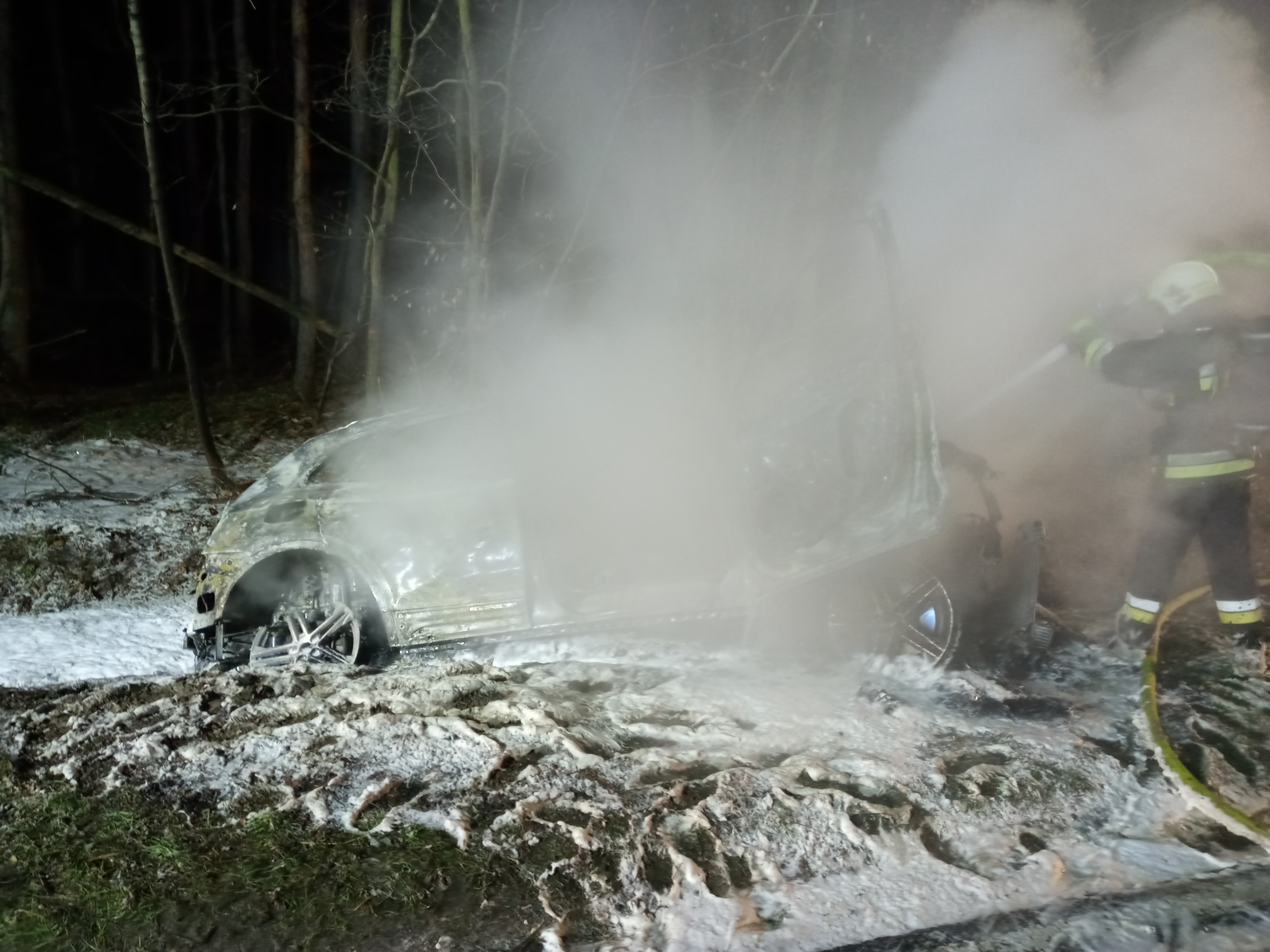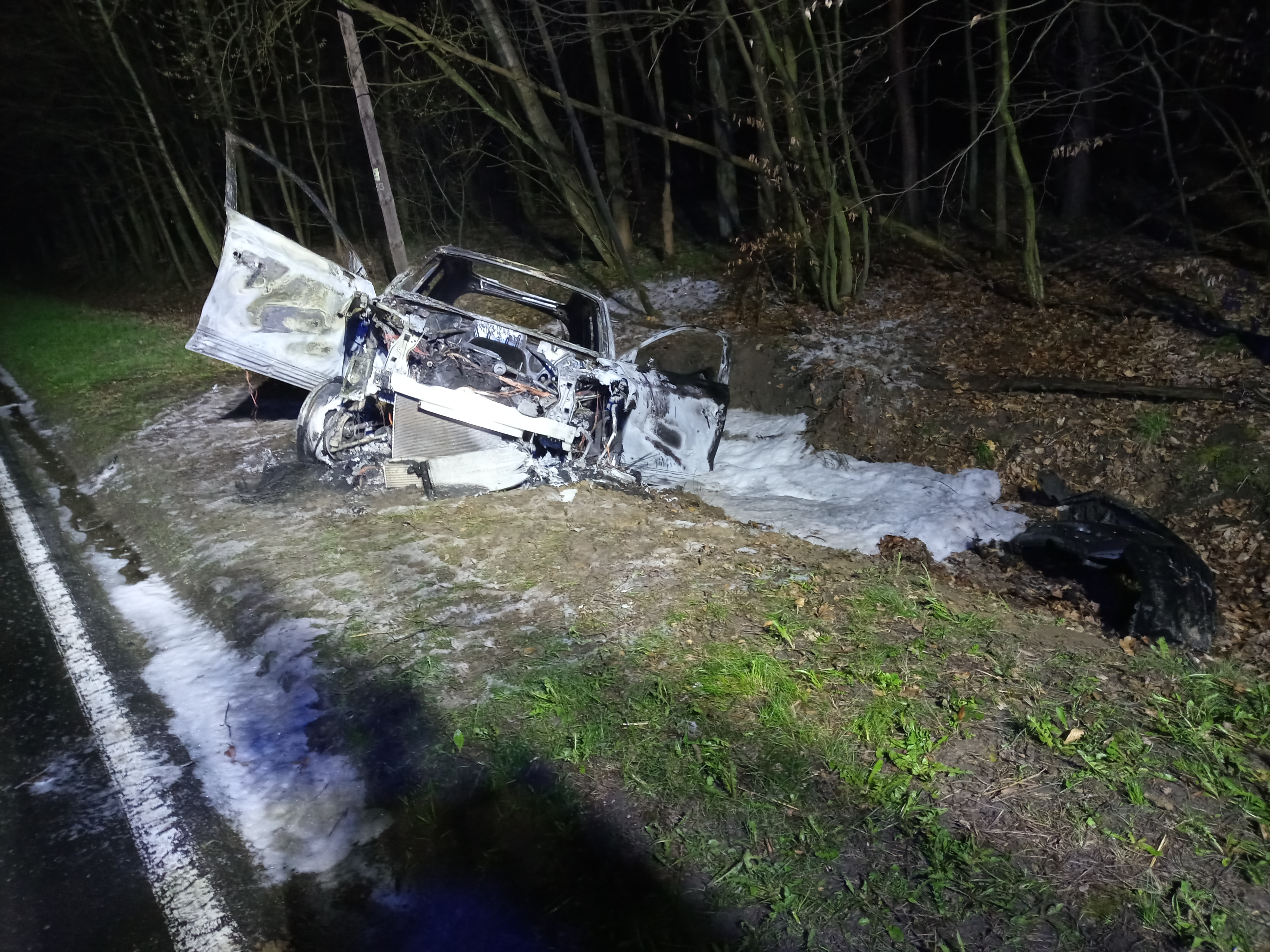 Po dojeździe pierwszych zastępów jednostek ochrony przeciwpożarowej rozpoznano, że pali się cały samochód osobowy, który wypadł z drogi i znajduje się na poboczu. Strażacy zabezpieczali teren i przystąpili do gaszenia pożaru. Następnie z uwagi na brak kierującego pojazdem na miejscu zdarzenia przystąpiono do przeszukania najbliższej okolicy w celu odnalezienia potencjalnych poszkodowanych.