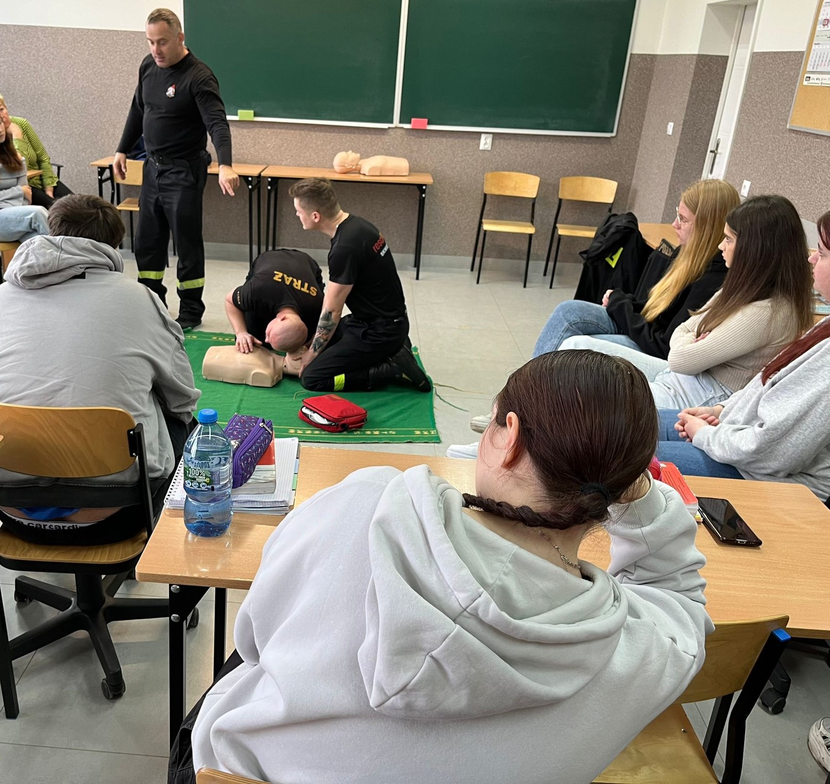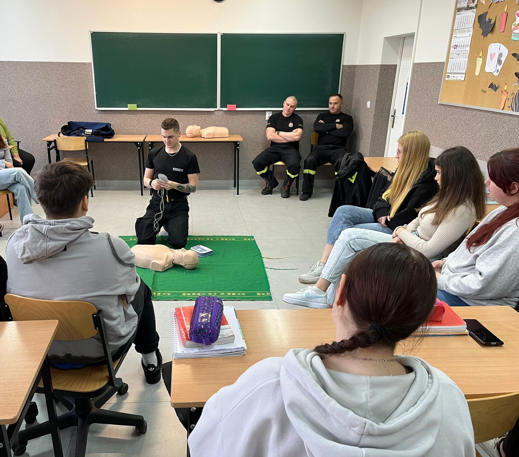 Zwieńczeniem wydarzenia było praktyczne szkolenie z zakresu udzielania pierwszej pomocy. Młodzież miała okazję zapoznać się z technikami resuscytacji krążeniowo-oddechowej (RKO), a także nauczyć się, jak postępować w sytuacjach zagrożenia życia i zdrowia. W trakcie szkolenia omówiono kluczowe zagadnienia, takie jak resuscytacja krążeniowo-oddechowa (RKO), postępowanie w przypadku upadków z wysokości, ataku padaczki, zakrztuszenia się oraz tamowania krwotoków.