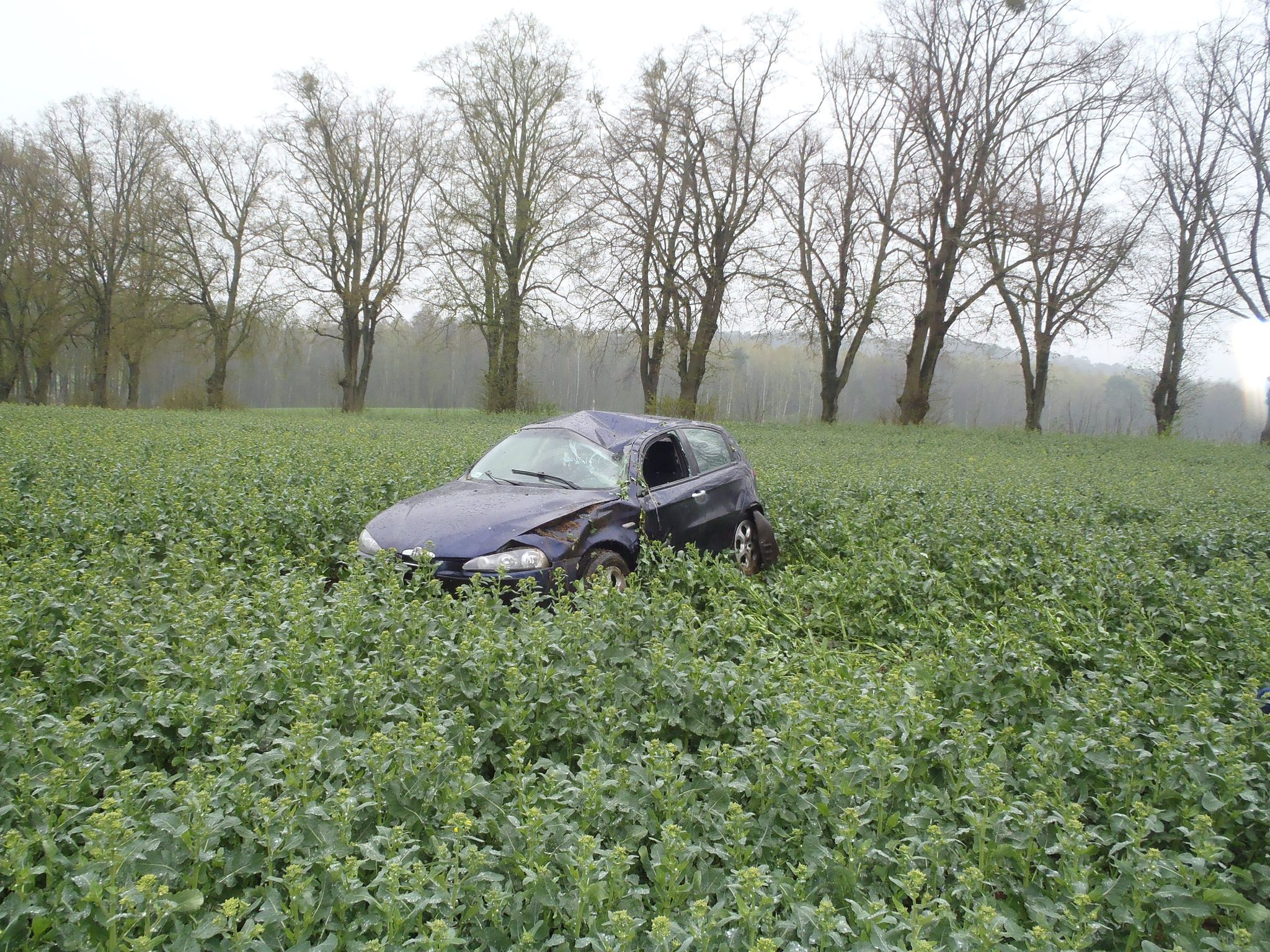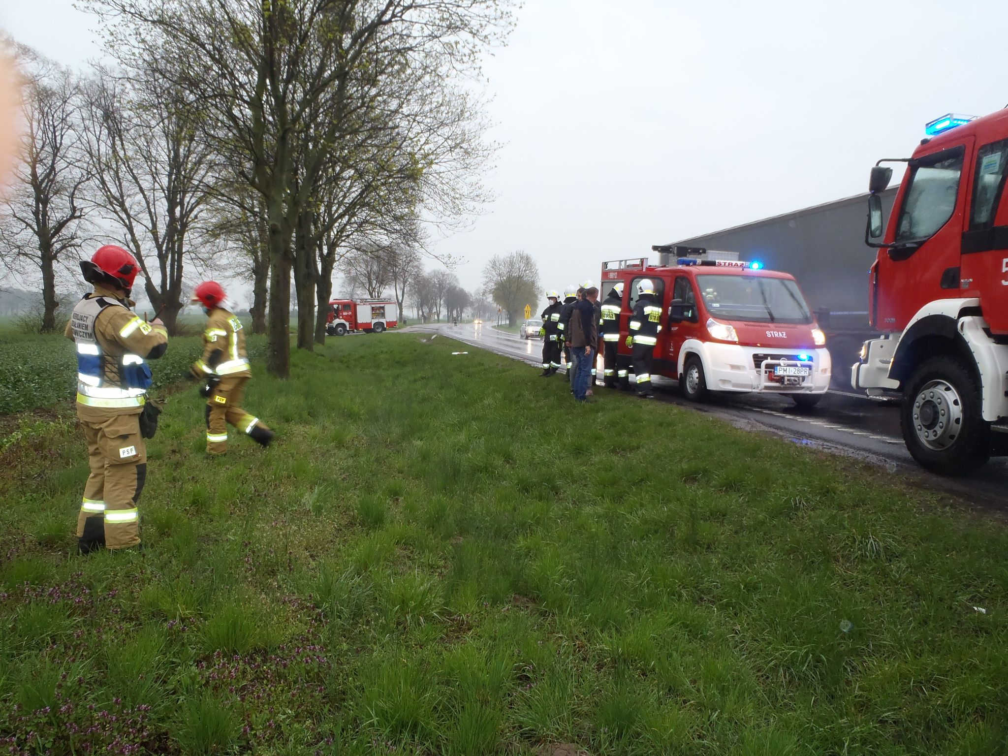 Po dojechaniu pierwszych zastępów jednostek ochrony przeciwpożarowej na miejsce zdarzenia rozpoznano, że samochód osobowy wypadł z drogi i znajuje się na polu, a osoby nim podróżujące o własnych siłach opuściły pojazd jeszcze przed przybyciem straży pożarnej na miejsce zdarzenia. Strażacy zabezpieczyli teren, kobiecie i mężczyźnie została udzielona kwalifikowana pierwsza pomoc.
