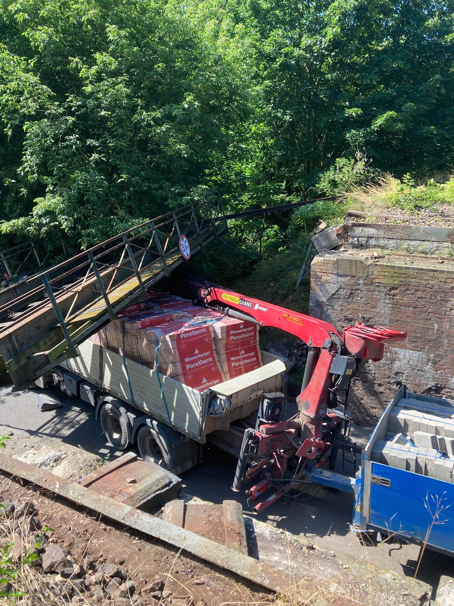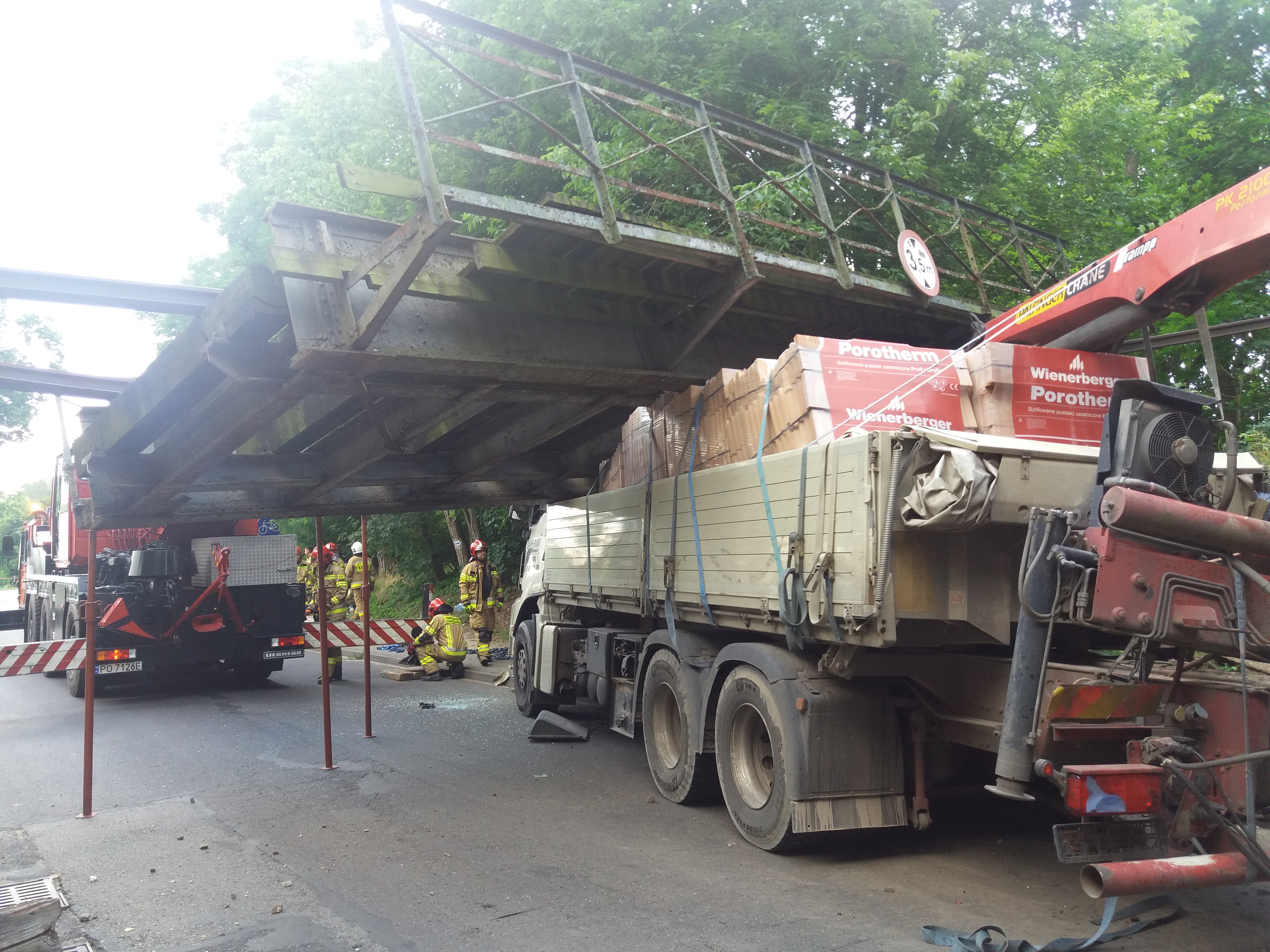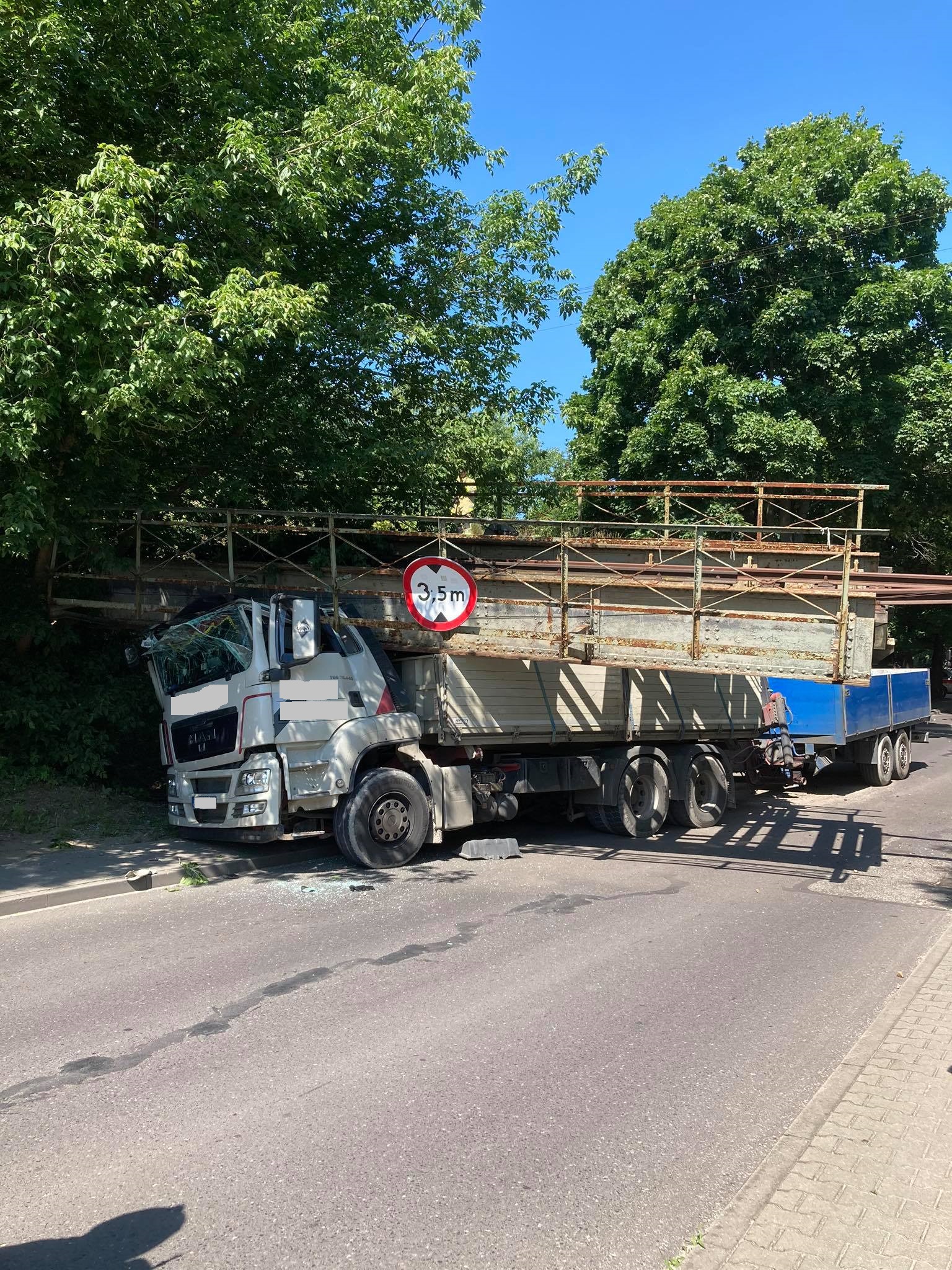 Przęsło przemieściło się o kilka metrów względem osi torów, uszkodziło kabinę samochodu i oparło się na skrzyni ładunkowej.