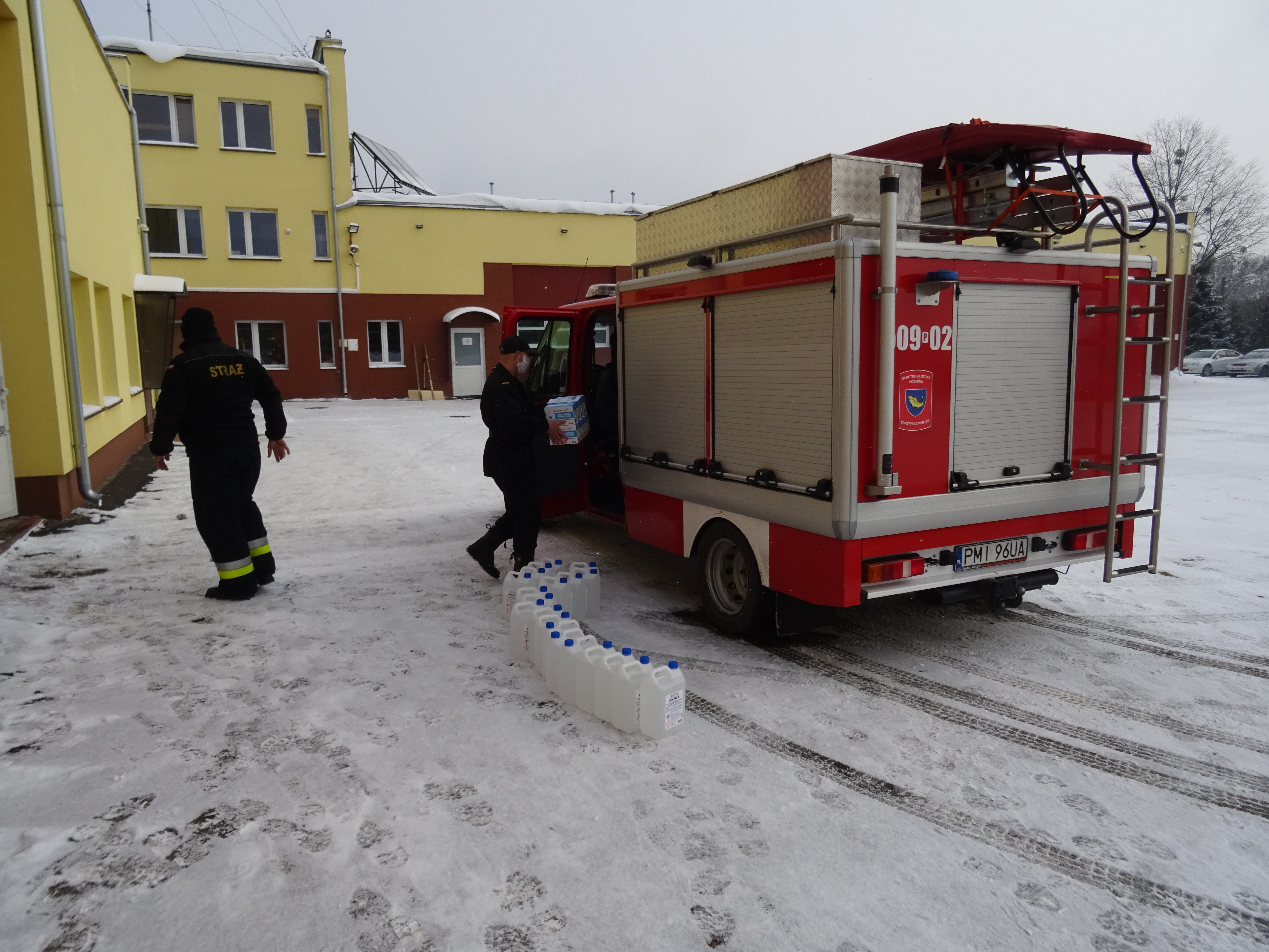 W poniedziałek 8 lutego 2021 roku z Wojewódzkiego Centrum Zarządzania Kryzysowego w Poznaniu wyznaczone siły i środki jednostek ochrony przeciwpożarowej przetransportowały do komend powiatowych Państwowej Straży Pożarnej na terenie województwa wielkopolskiego płyny do dezynfekcji rąk oraz maseczki chirurgiczne.