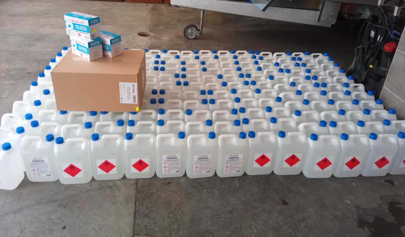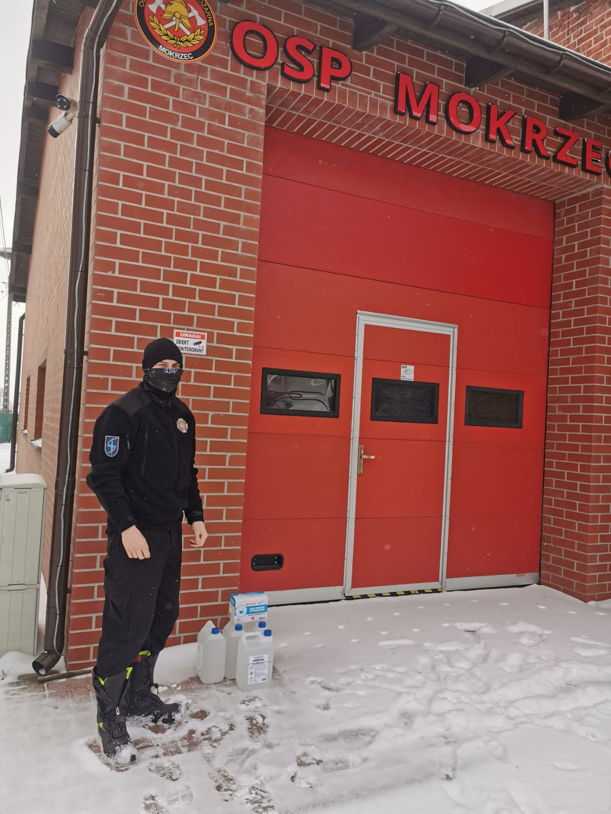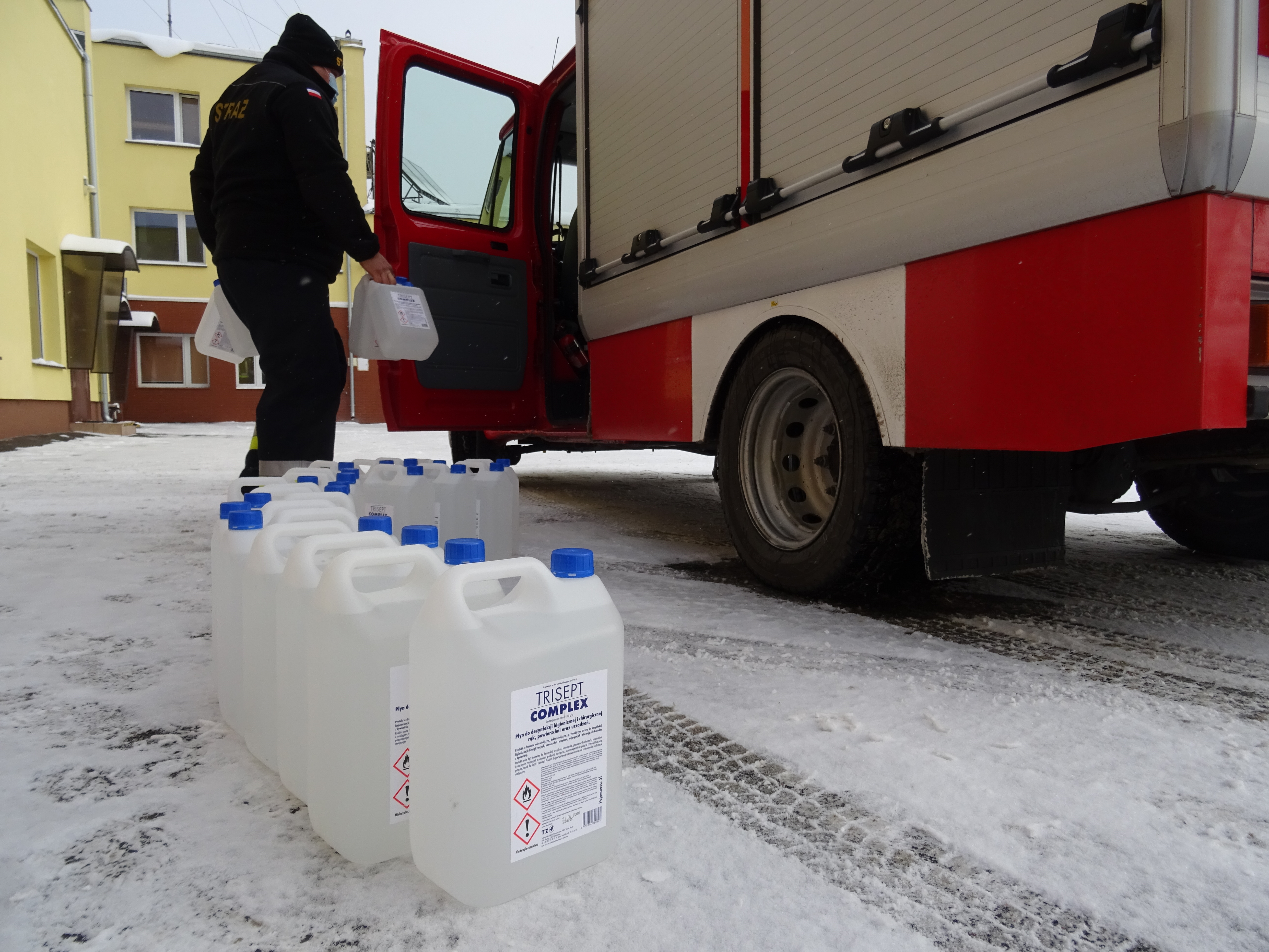 Jednostki ochrony przeciwpożarowej z terenu powiatu międzychodzkiego otrzymały w sumie 220 szt. zbiorników 5 litrowych płynu dezynfekcyjnego oraz 2000 szt. maseczek.