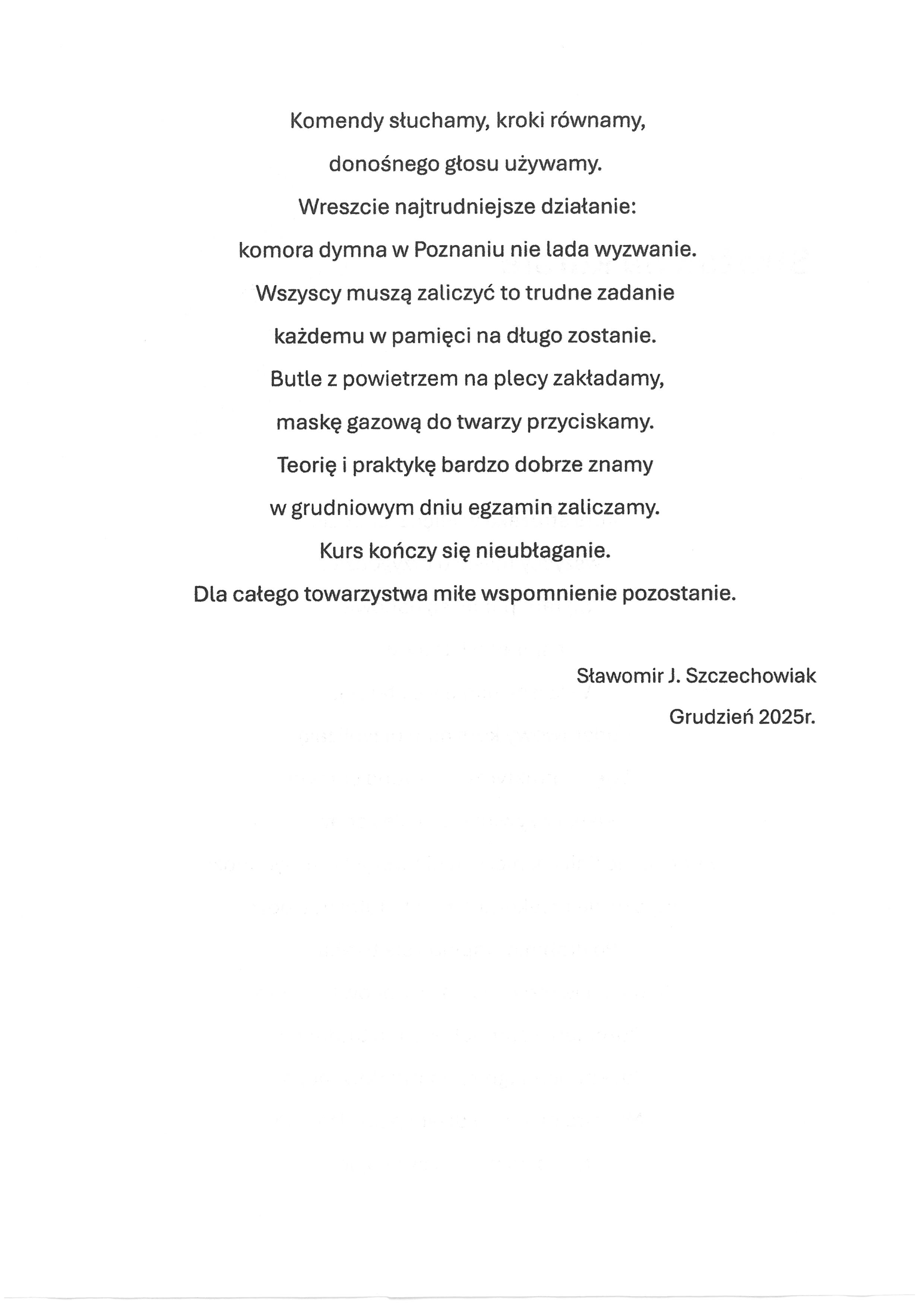 Podczas zakończenia kursu jeden z absolwentów druh Sławomir Szczechowiak z OSP Ryżyn odczytał wiersz który napisał pt. „Strażak na kursie”. Autor po odczytaniu otrzymał gromkie brawa od grupy w dowód uznania swojej twórczości poetyckiej oraz wręczył kopie wiersza Dowódcy JRG, w załączeniu publikujemy treść wiersza.