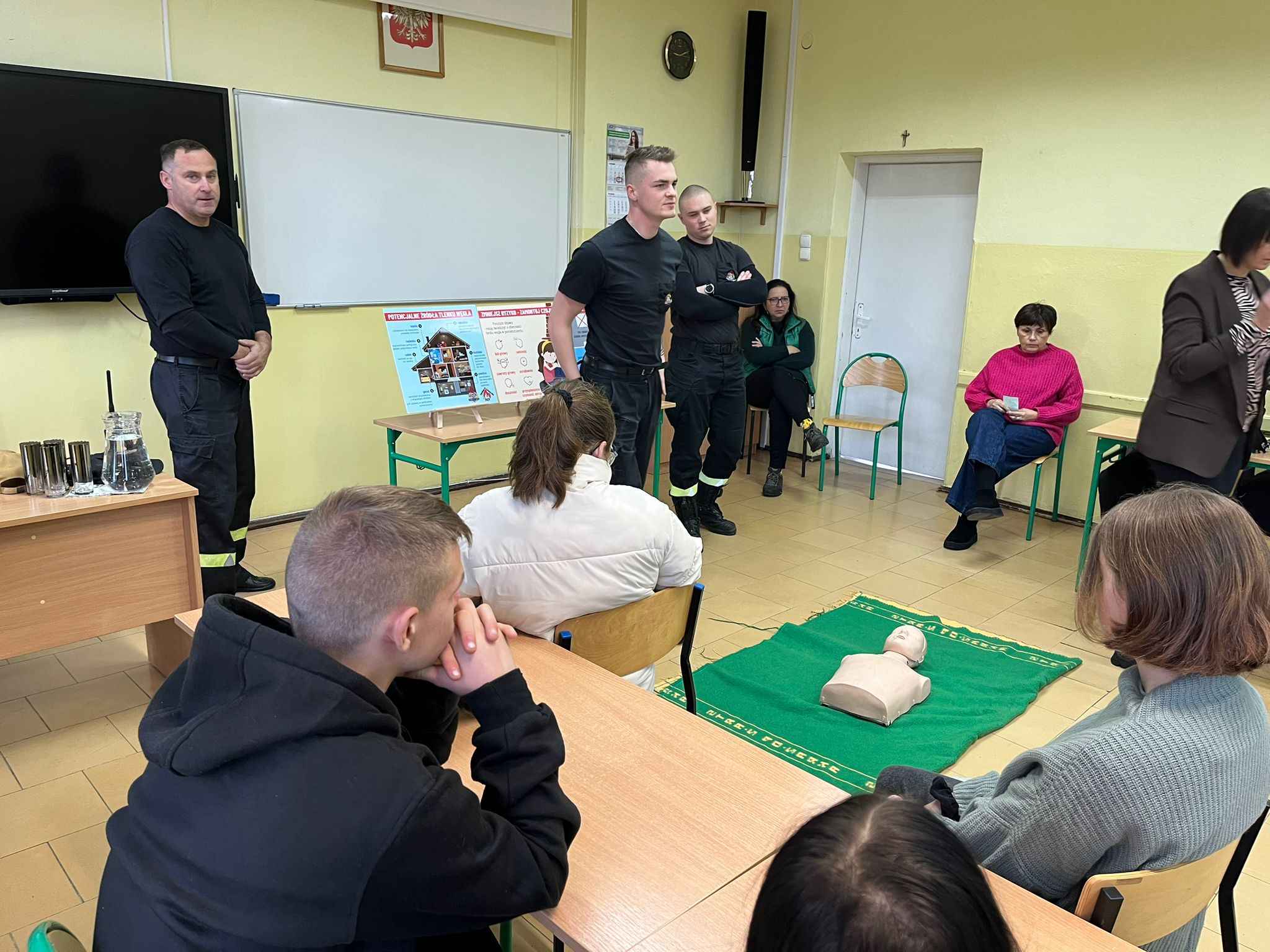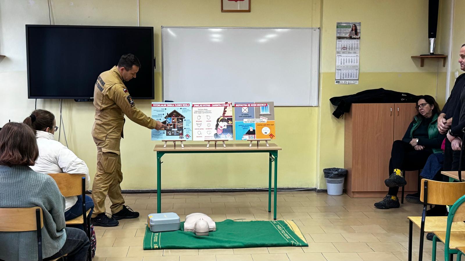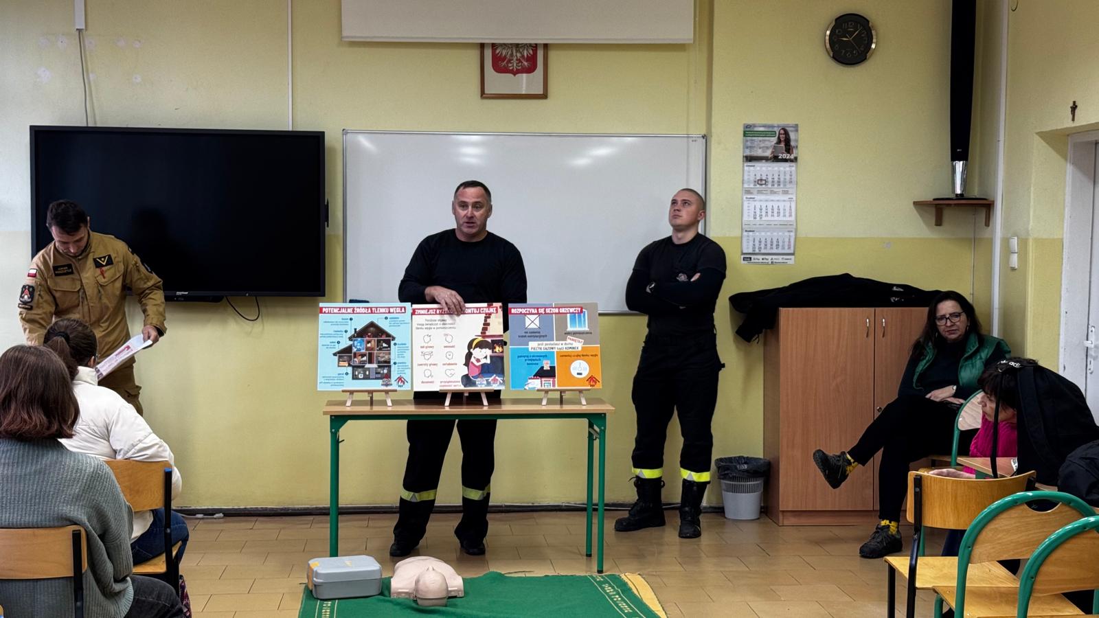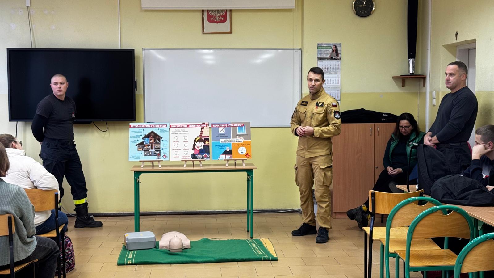 Strażacy omówili zagrożenia związane z sezonem grzewczym, takie jak zatrucie tlenkiem węgla i pożary oraz przypomnieli o zasadach bezpieczeństwa. Dodatkowo, uczniowie zostali przeszkoleni z udzielania pierwszej pomocy, w tym resuscytacji i reagowania na różne sytuacje.