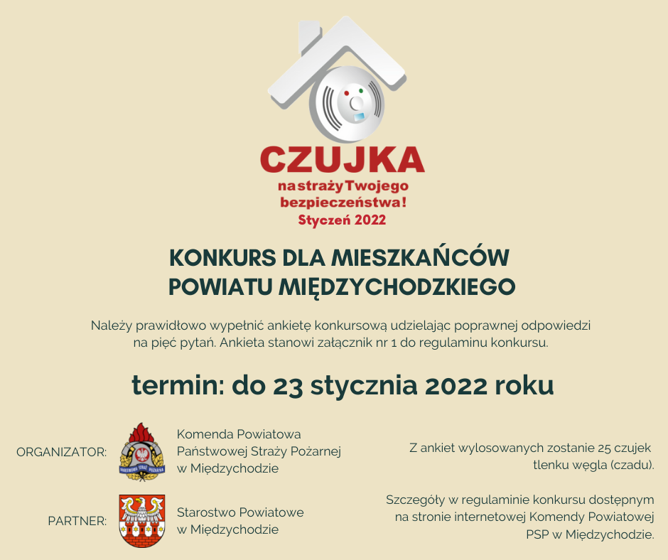 Komenda Powiatowa Państwowej Straży Pożarnej w Międzychodzie wraz ze Starostwem Powiatowym w Międzychodzie serdecznie zapraszają do udziału w konkursie "Czujka na straży Twojego bezpieczeństwa - Styczeń 2021", który skierowany jest do dorosłych mieszkańców powiatu międzychodzkiego.