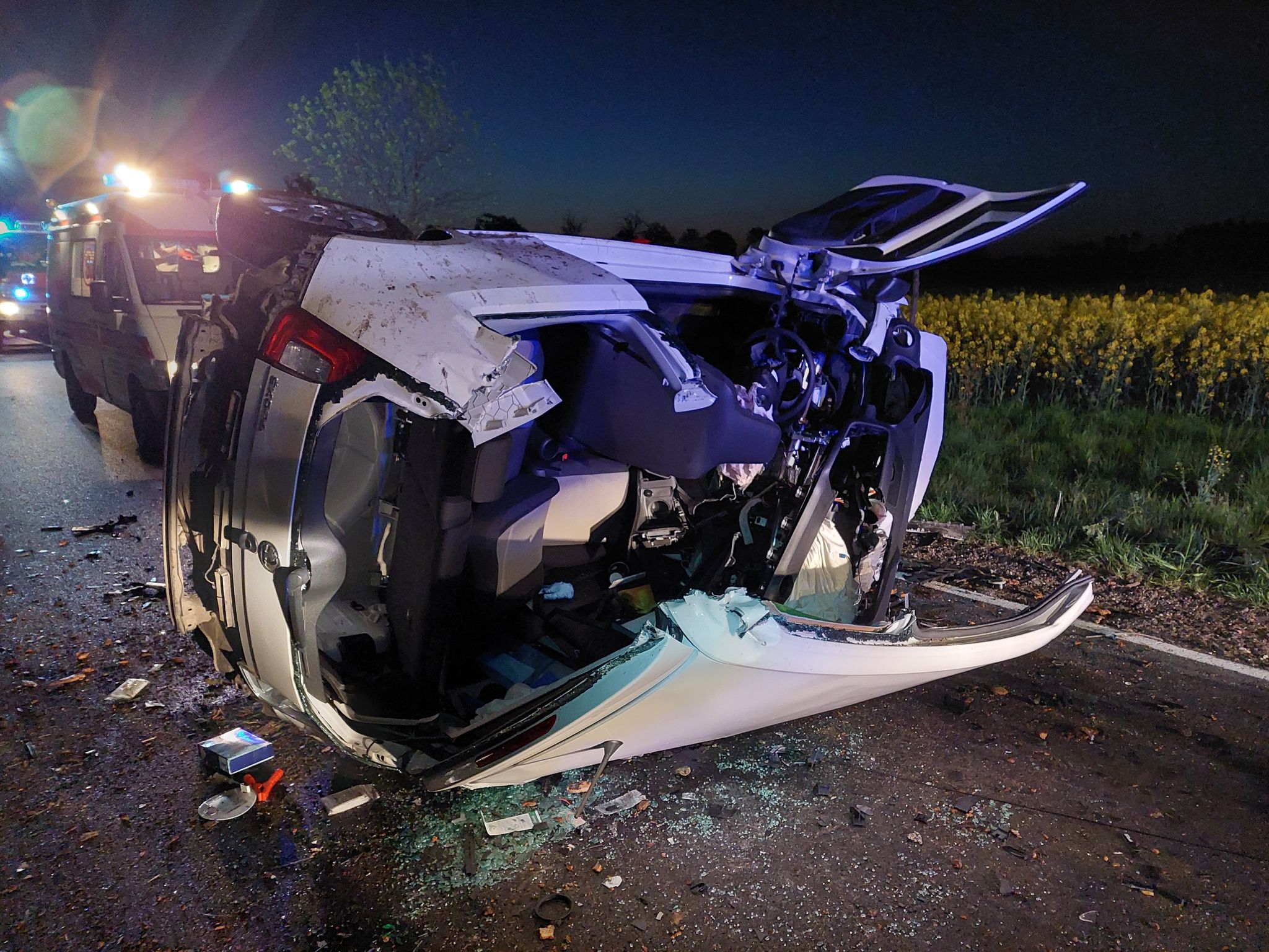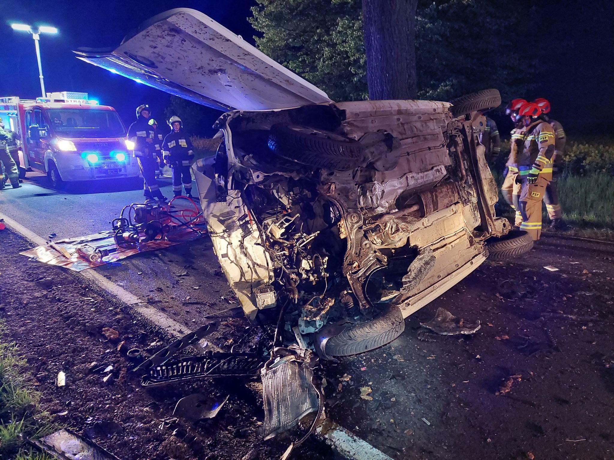 Po dojeździe strażacy zastali samochód osobowy leżący na boku, a w nim uwięzionego mężczyznę. Działania strażaków poległy na uwolnieniu poszkodowanego przy pomocy narzędzi hydraulicznych oraz udzieleniu mu kwalifikowanej pierwszej pomocy, po dojeździe przekazano poszkodowanego zespołowi ratownictwa medycznego.
