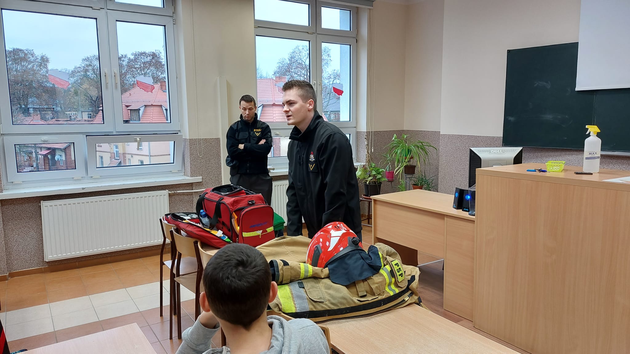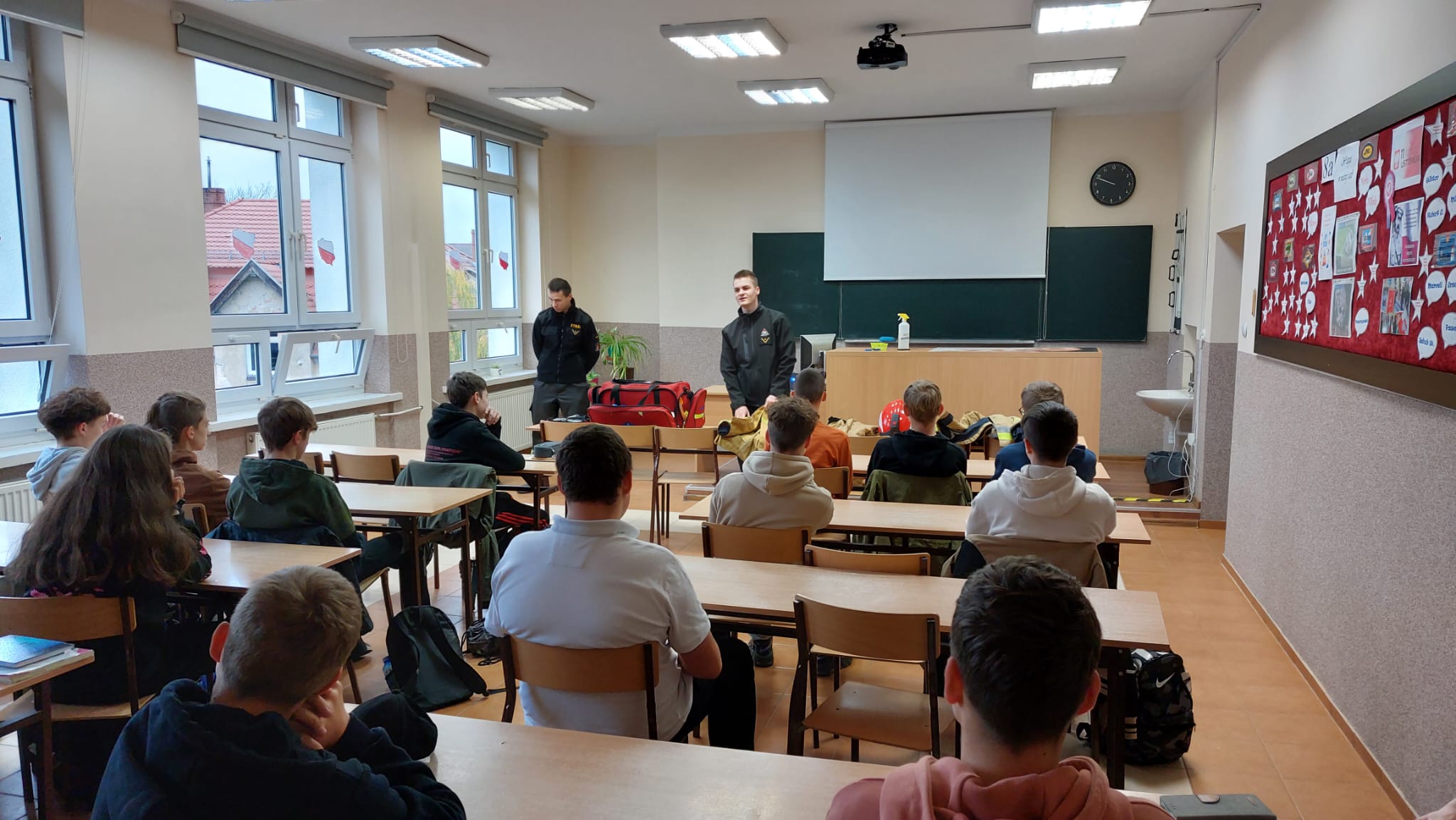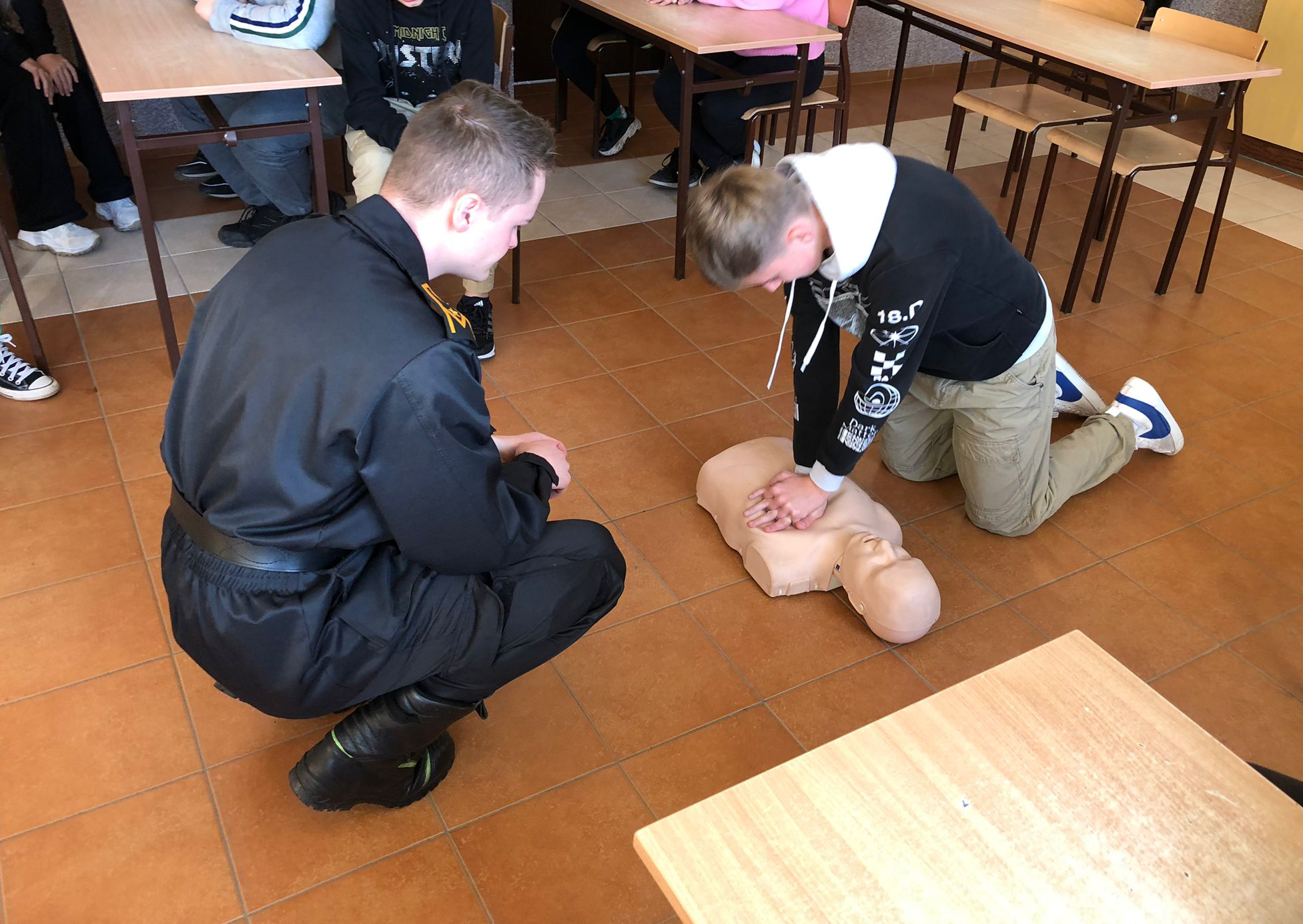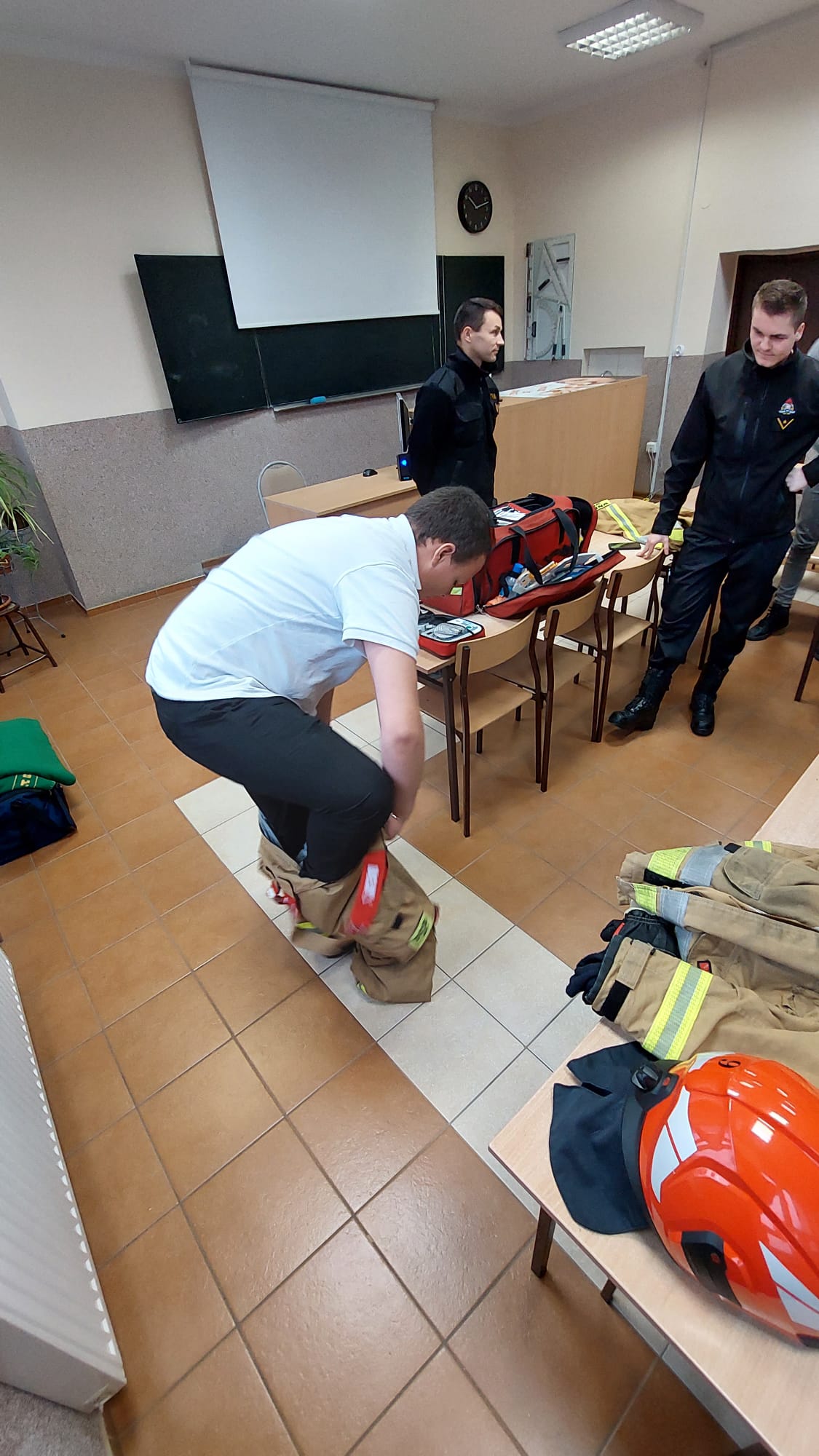 Strażacy podczas swojej wizyty zapoznali uczniów i omówili jaką drogę musi przejść kandydat chętny do podjęcia służby w Państwowej Straży Pożarnej i etapy rekrutacji do Szkół Aspirantów i Szkoły Głównej Służby Pożarniczej. Dużym zainteresowaniem wśród młodzieży cieszyło się umundurowanie bojowe strażaka. Chętni mogli założyć strój i sprawdzić czy zdążyliby się ubrać i w przepisowym czasie wyjechać do działań. Następnie funkcjonariusze opowiedzieli o zadaniach z jakimi zmagają się w czasie swojej pracy, a dodatkowo młodzież miała okazję na żywo przekonać się i spróbować swoich sił podczas ćwiczeń i nauki z pierwszej pomocy.
