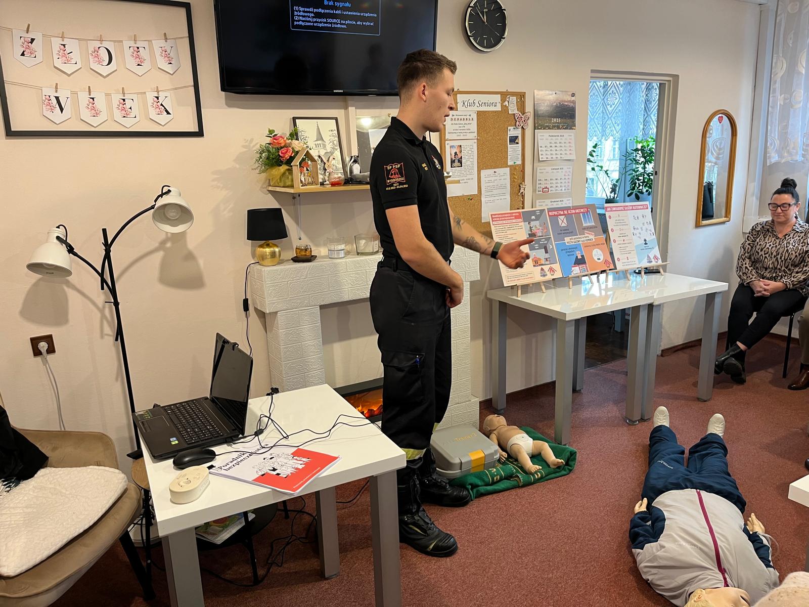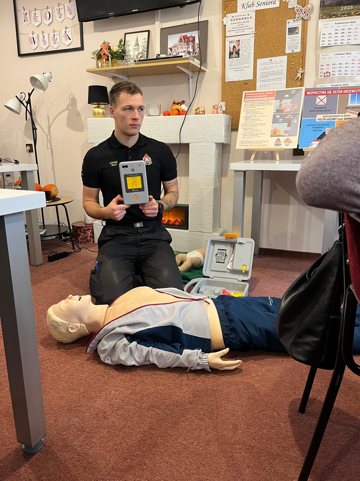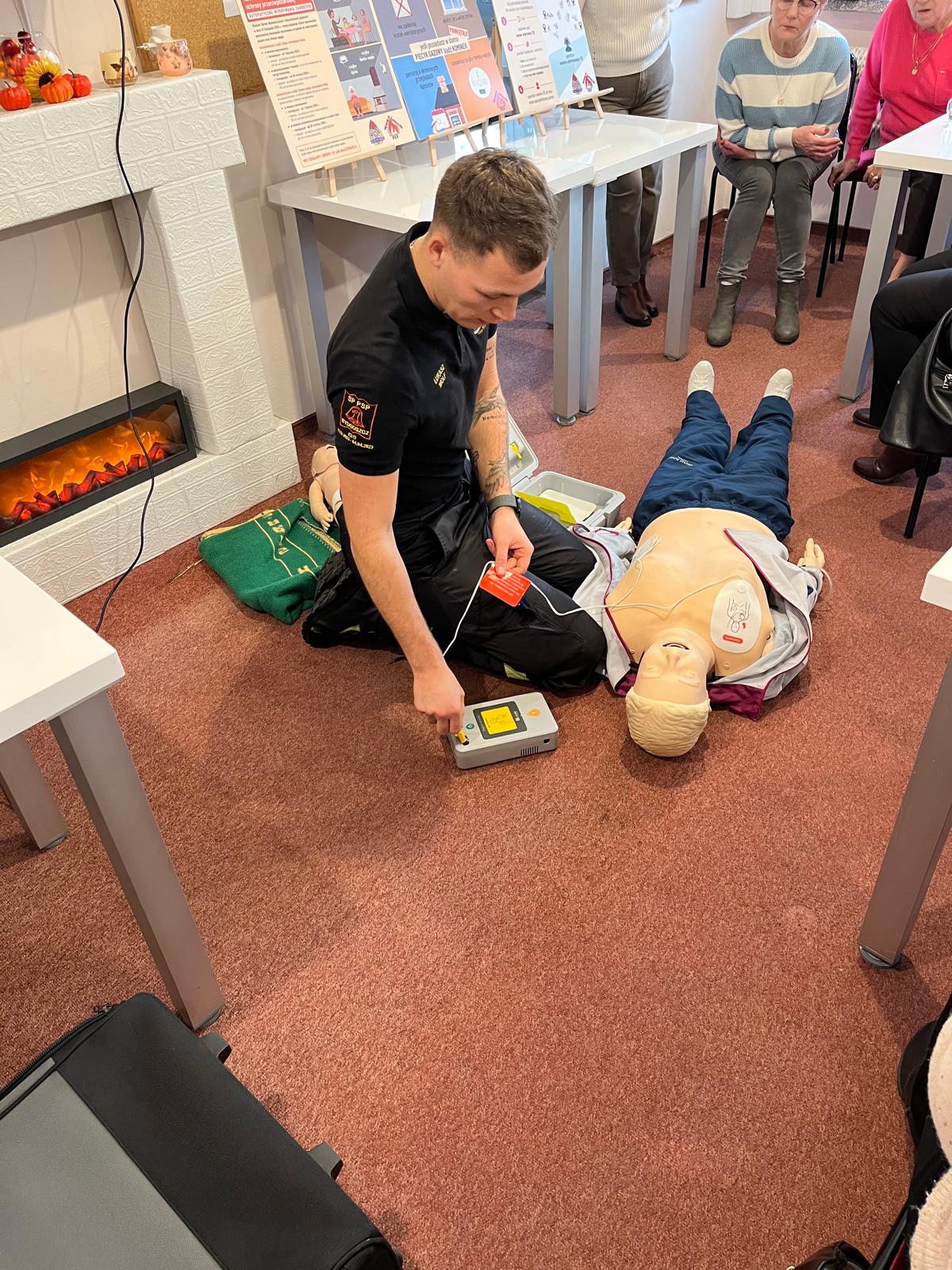 Druga część spotkania obejmowała podstawy udzielenia pierwszej pomocy. Seniorzy mieli okazję przypomnieć sobie najważniejsze zasady postępowania w przypadku utraty przytomności, zatrzymania krążenia czy zatrucia dymem lub czadem.