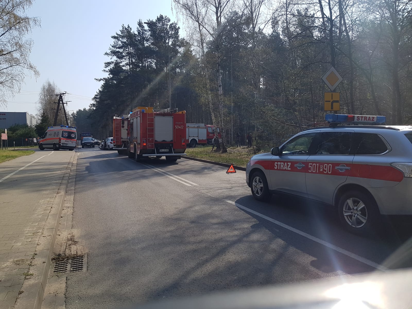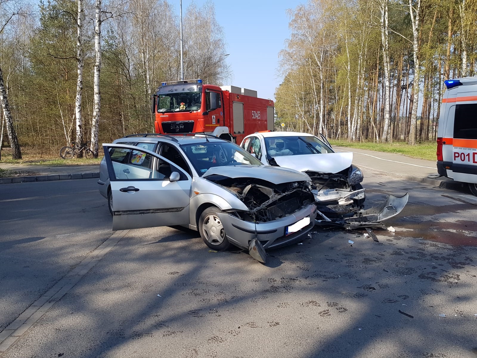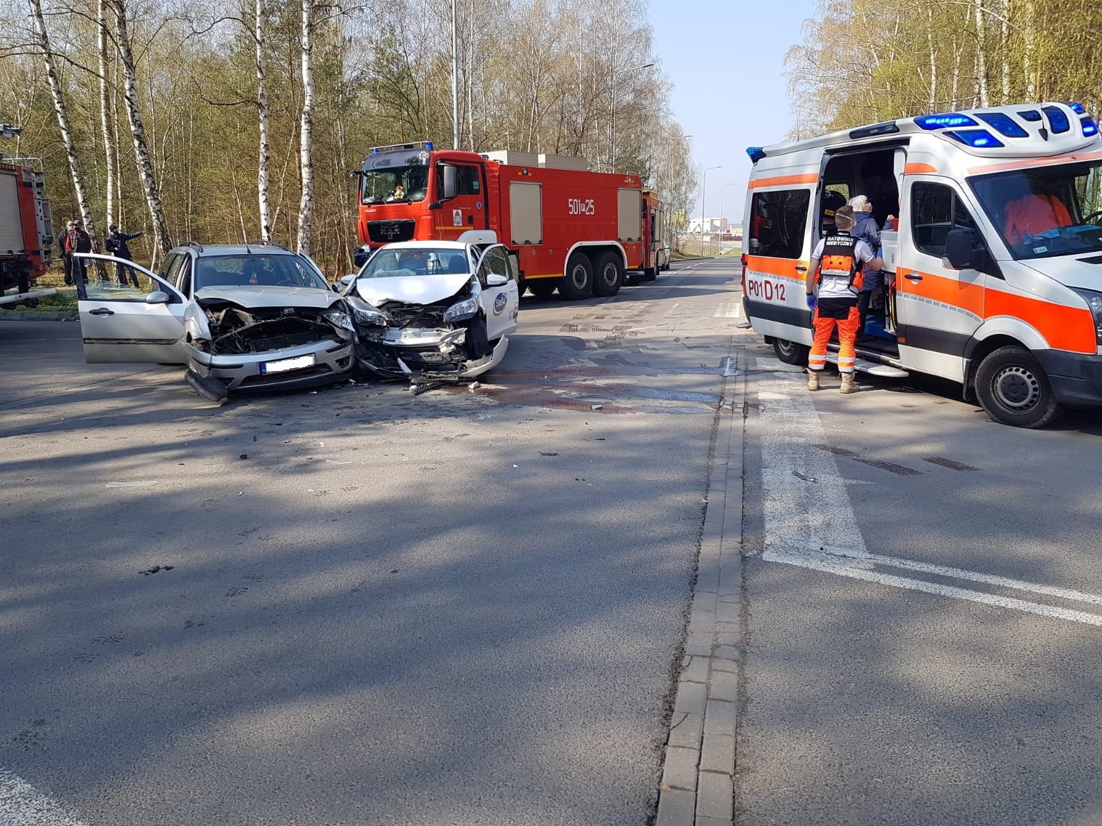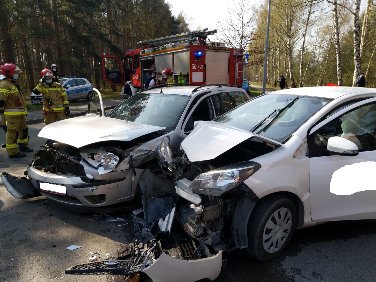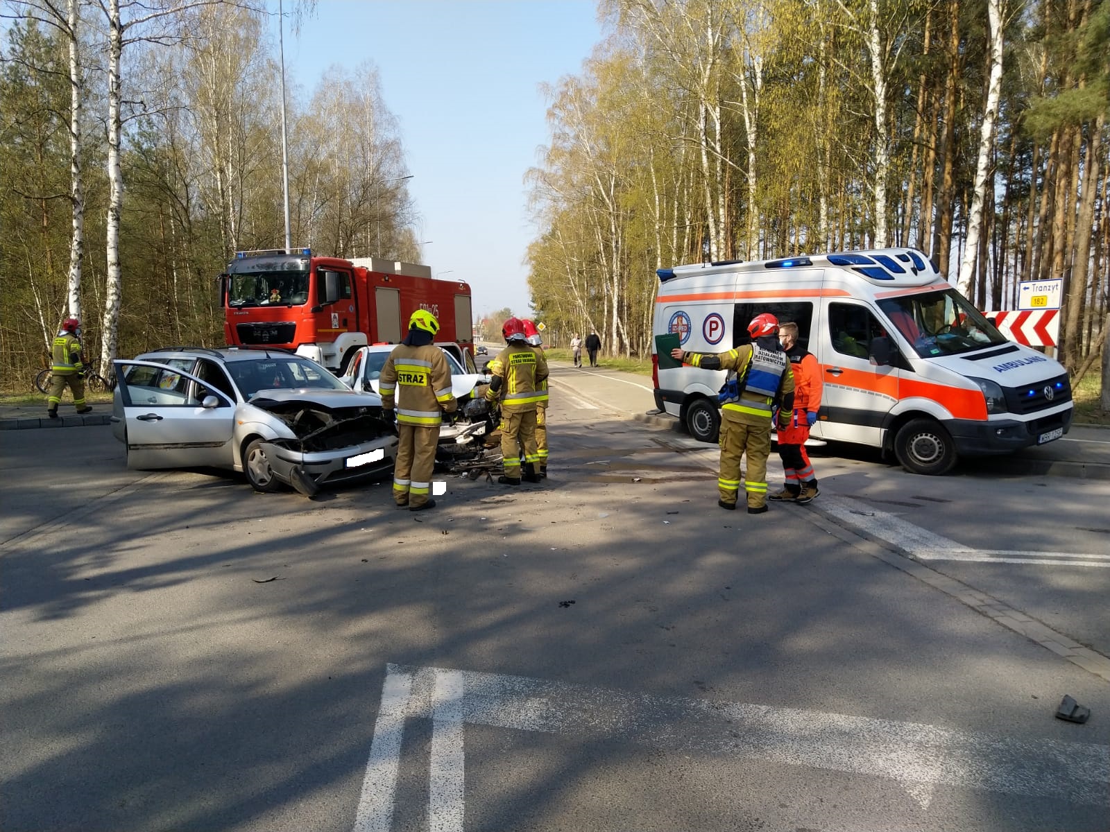 Po dojeździe zastępów straży pożarnej na miejsce zdarzenia rozpoznano, że zderzyły się dwa samochody osobowe, którymi podróżowały trzy osoby. Strażacy zabezpieczyli teren, udzielili kwalifikowanej pierwszej pomocy trzem poszkodowanym kobietom. Po przekazaniu poszkodowanych zespołowi ratownictwa medycznego zdecydowano, że dwie osoby wymagają przewiezienia do szpitala.