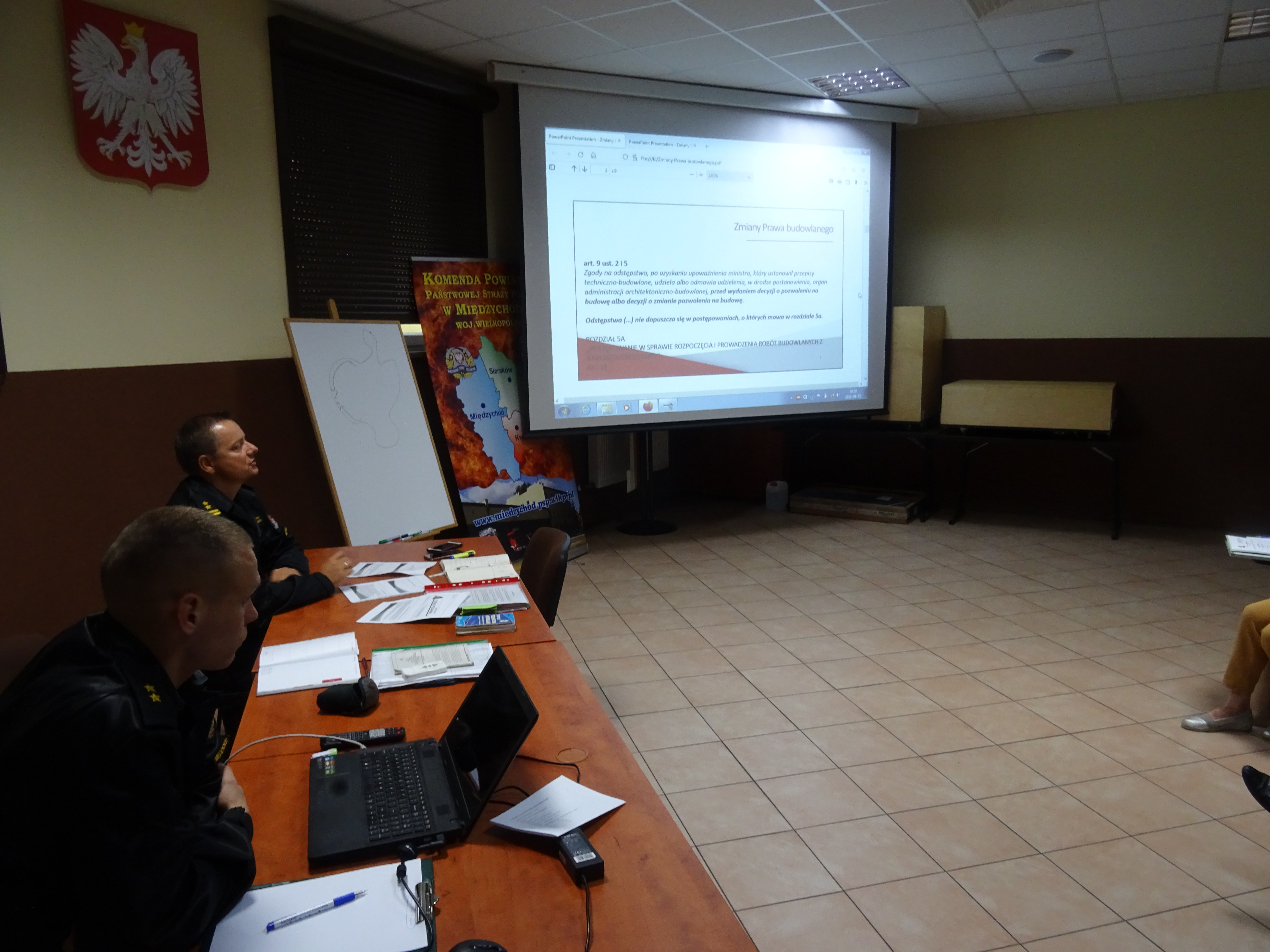 Podczas spotkania nadzorujący pion kontrolno – rozpoznawczy Zastępca Komendanta Powiatowego Państwowej Straży Pożarnej w Międzychodzie bryg. Roman Grzebieta omówił zmiany prawa budowlanego oraz przepisów wykonawczych w zakresie zagadnień związanych z ochroną przeciwpożarową. Było to podstawą do wspólnej dyskusji i wypracowania wniosków.