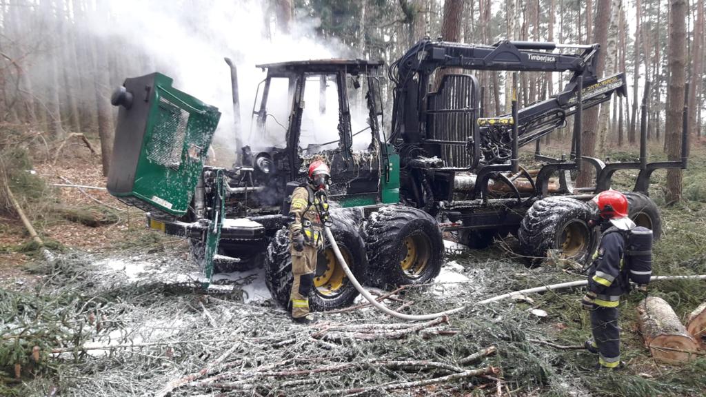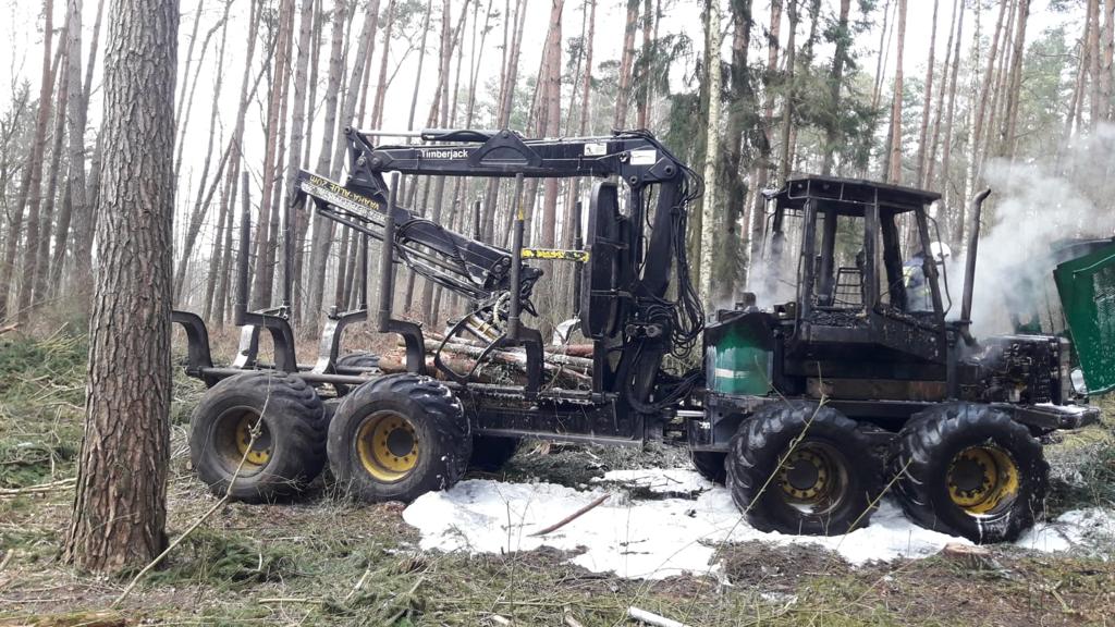 1 kwietnia br. w godzinach popołudniowych w Nadleśnictwie Trzciel w okolicy miejscowości Policko interweniowały trzy zastępy gaśnicze z JRG Międzyrzecz oraz OSP Międzyrzecz-Obrzyce. Zaalarmowano Stanowisko Kierowania Komendanta Powiatowego o pożarze maszyny leśnej Timberjack. W momencie strażaków pożarem objęta była cała maszyna. Obsługa palącego się pojazdu próbowała bezskutecznie ugasić pożar przed przybyciem jednostek ochrony przeciwpożarowej za pomocą gaśnic proszkowych. Działania zastępów polegały na podaniu jednego prądu piany ciężkiej na powierzchnię pożaru. Po lokalizacji pożaru przystąpiono do chłodzenia maszyny, przy pomocy 2 prądów wody. Na miejsce zdarzenia zadysponowano przedstawiciela Lasów Państwowych, który nie stwierdził strat w 80-cio letnim lesie sosnowym.