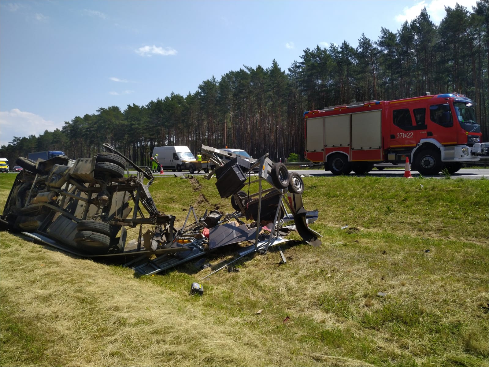 W wyniku zderzenia pojazd Iveco został zepchnięty do rowu, natomiast ciężarówka zatrzymała się około 100 m dalej na pasie awaryjnym. W chwili zderzenia w samochodzie Iveco nikt nie przebywał. Kierowca ciężarówki również nie odniósł żadnych obrażeń. W działaniach brały udział 2 zastępy JRG oraz jeden z OSP w KSRG. W wyniku zdarzenia zniszczeniu uległ samochód Iveco wraz z sygnalizacją świetlną oraz przód ciężarówki DAF.
