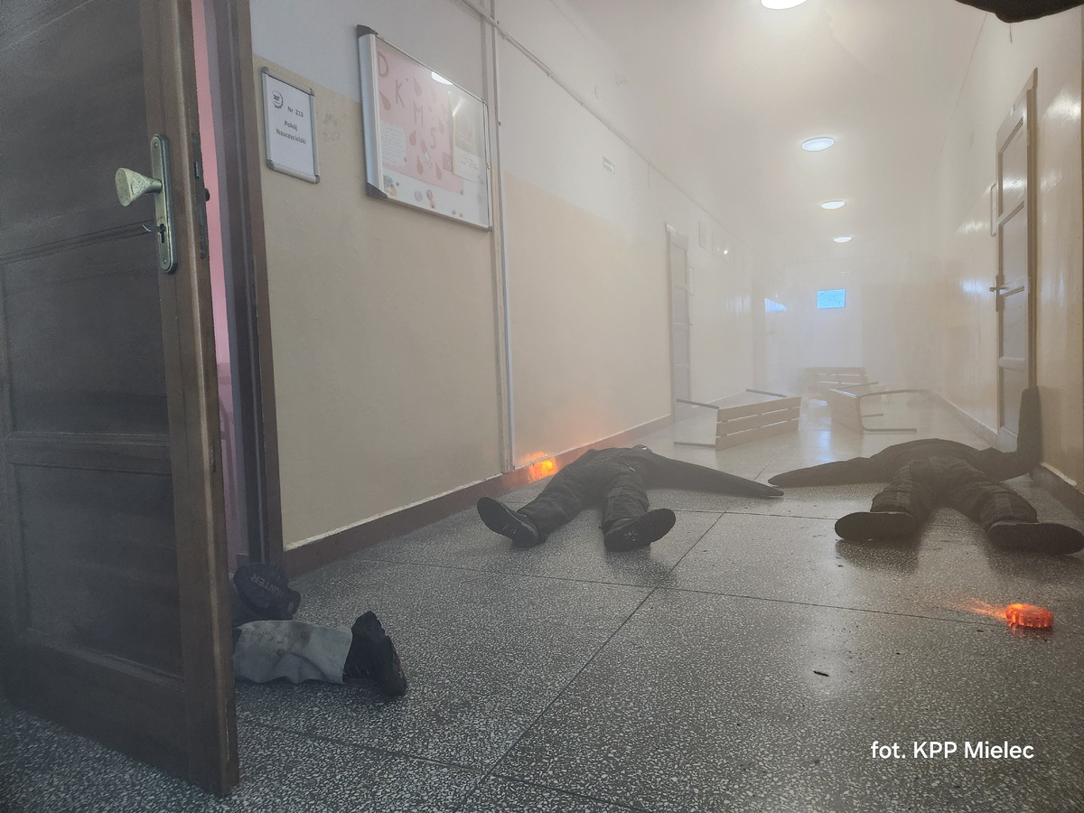 W trakcie działań doszło do symulowanego wybuchu. W jego wyniku poszkodowanych zostało 12 osób, w tym dwóch funkcjonariuszy Policji oraz pies służbowy. Eksplozja spowodowała również pożar w kilku pomieszczeniach budynku.