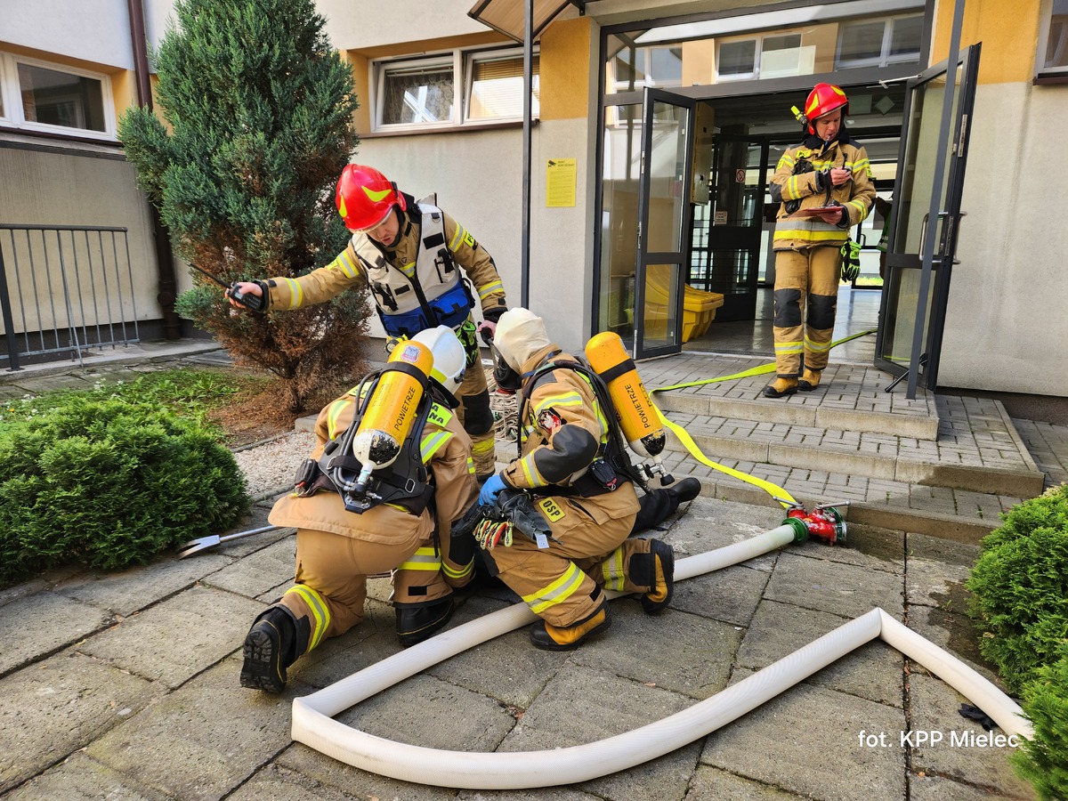 Dodatkowo sprawdzono możliwości dojazdu do obiektu, wykorzystanie drogi pożarowej, dostępność hydrantów zewnętrznych oraz skuteczność wykorzystania sprzętu specjalistycznego, w tym drabiny mechanicznej.