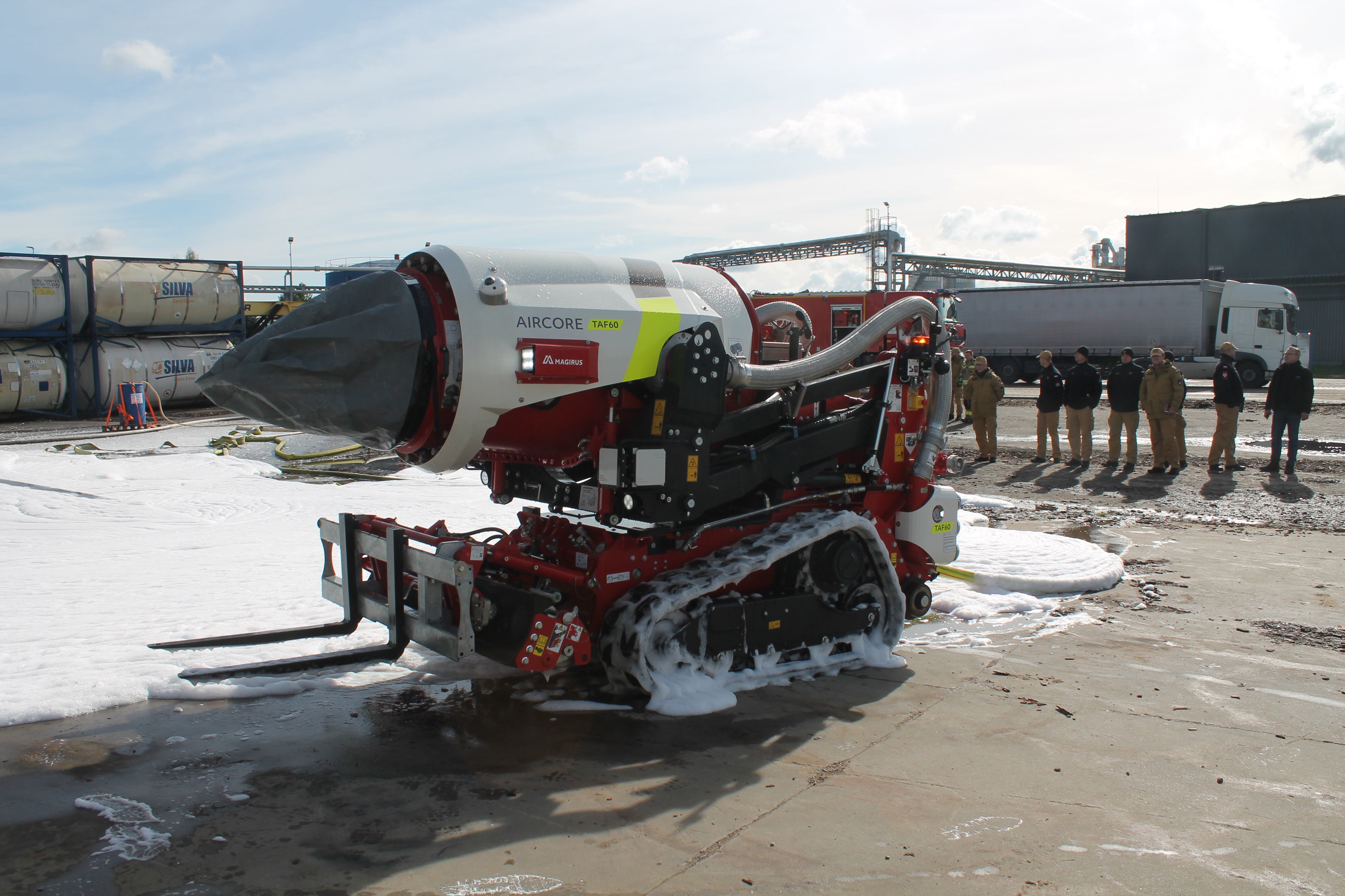 Na terenie zakładów Kronospan w Mielcu odbył się pokaz nowoczesnej turbiny gaśniczej MAGIRUS AirCore TAF 60 – innowacyjnego rozwiązania przeznaczonego do gaszenia dużych, trudnych i niebezpiecznych pożarów.