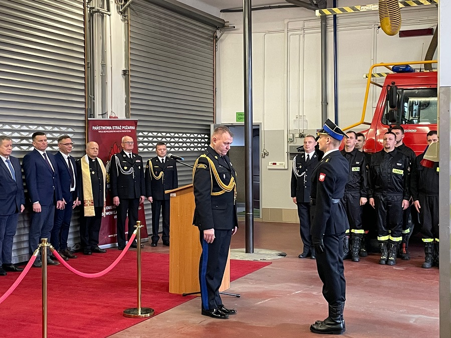 Uroczystość przekazania wozów strażackich była okazją do wręczenia awansu na wyższy stopnień służbowy funkcjonariuszowi komendy powiatowej PSP w Mielcu asp. Jakubowi Kania.
