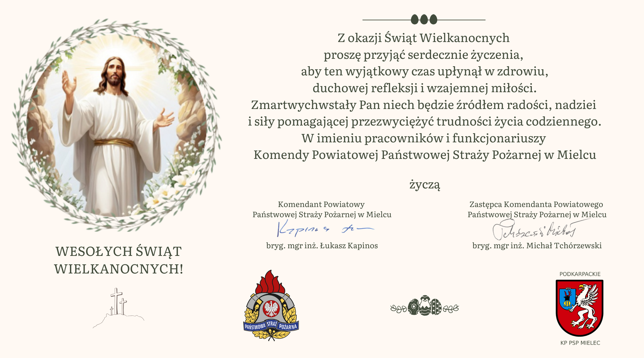 Zdjęcie przedstawia logo "Państwowej Straży Pożarnej" oraz "Komendy Powiatowej Państwowej Straży Pożarnej w Mielcu". Pod logami znajduje się napis "Wesołych Świąt Wielkanocnych!". Wszystko znajduje się na jasnym tle