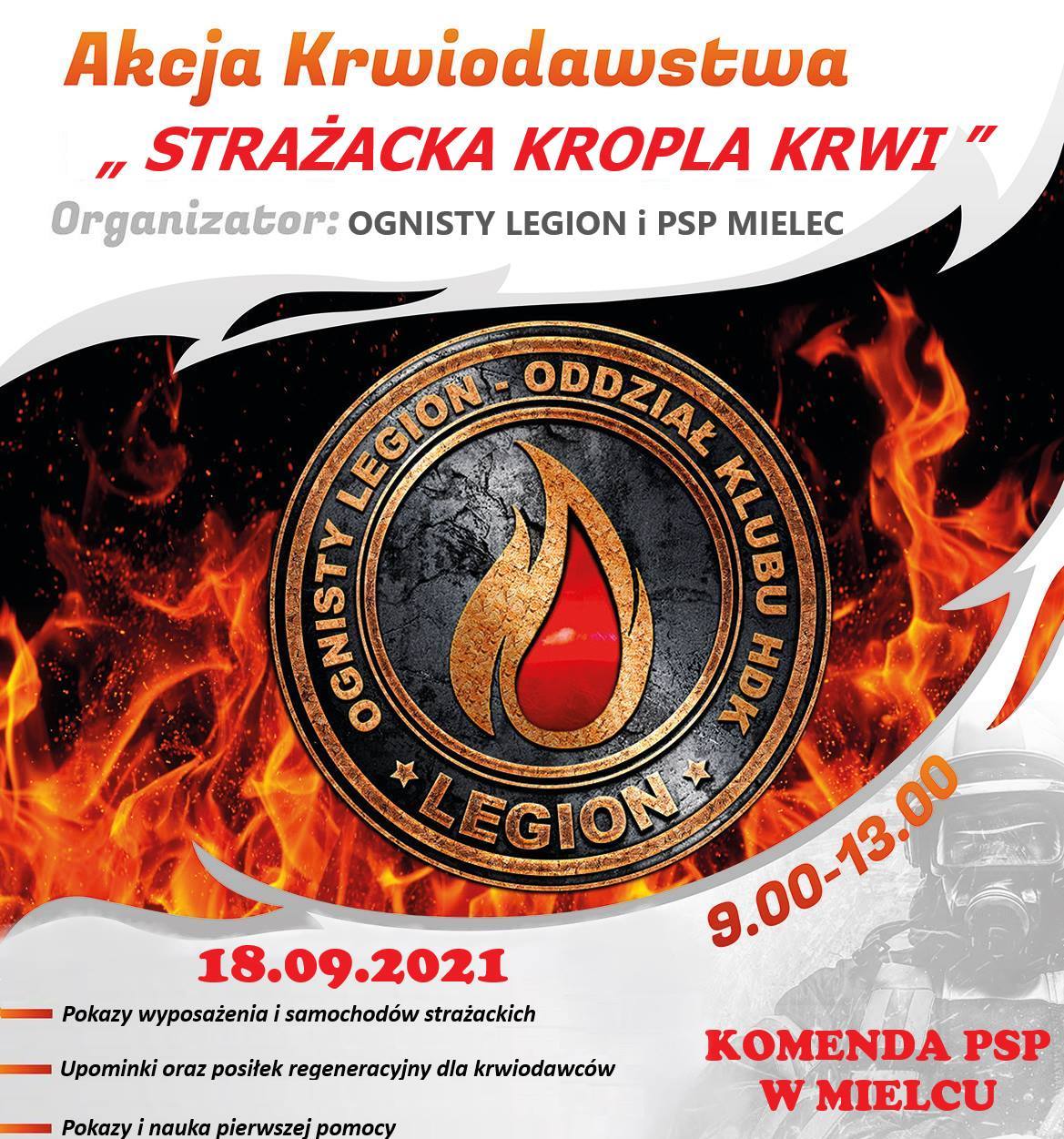 18 września 2021 roku w Komendzie Powiatowej PSP w Mielcu odbędzie się "Akcja Krwiodawstwa - Strażacka Kropla Krwi". Chętnych do uczestnictwa w tej szczytnej akcji serdecznie zapraszamy do komendy powiatowej PSP w Mielcu w godzinach 9.00 do 13.00 . Dla krwiodawców zapewniamy upominki i posiłki regeneracyjne. W dniu tym przewidziano również pokazy i naukę pierwszej pomocy oraz prezentacje wyposażenia i samochodów pożarniczych.