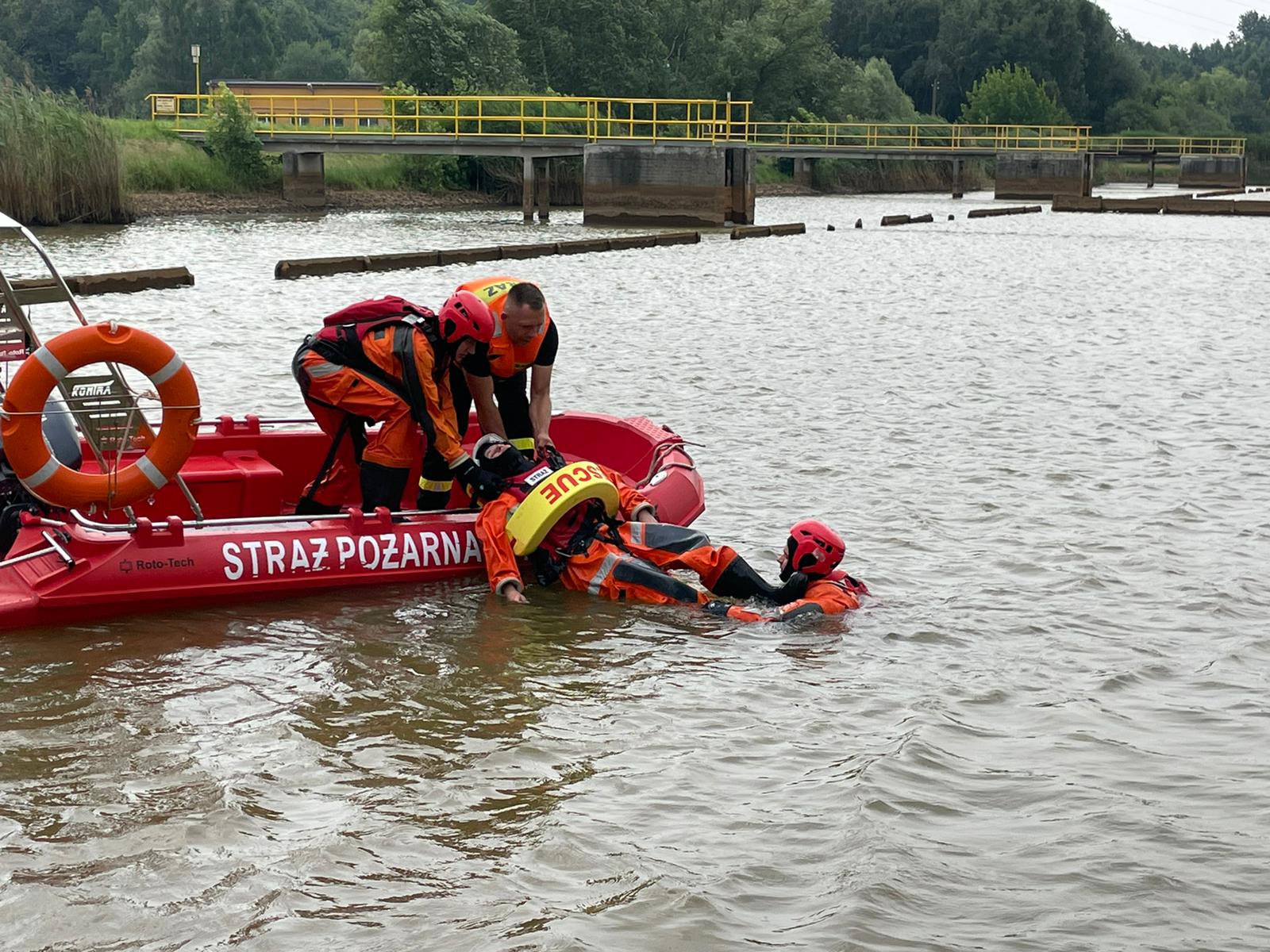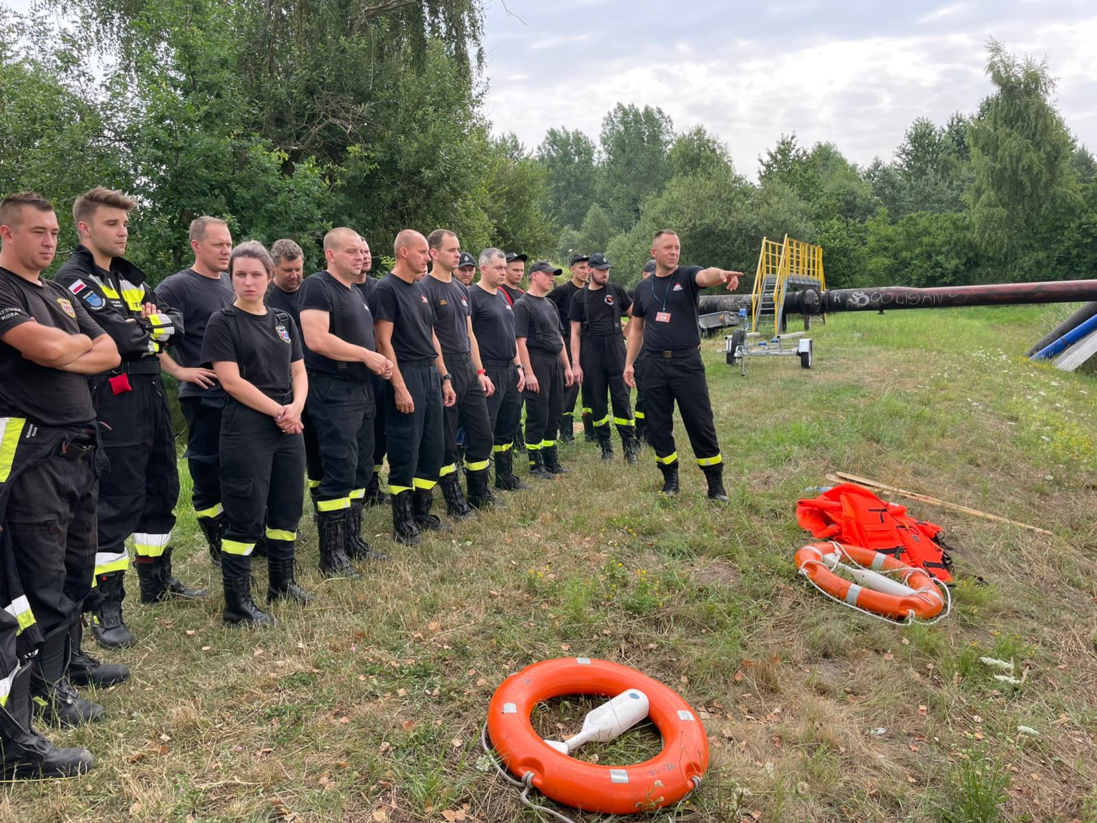 W okresie od 14 do 20 lipca 2021 roku strażacy Jednostki Ratowniczo-Gaśniczej w Mikołowie odbyli ćwiczenia z zakresu ratownictwa wodnego. Do udziału zaproszone zostały także jednostki OSP Łaziska Średnie oraz OSP Gostyń, które mają na wyposażeniu pontony. Podczas odprawy omówiono wyposażenie indywidualne i sposoby zabezpieczania ratowników, zagrożenia mogące wystąpić w miejscu prowadzenia działań oraz taktykę działań ratowniczych. Na zbiorniku wodnym Elektrowni Łaziska ćwiczono wodowanie łodzi motorowej i pontonów, dotarcie do poszkodowanego, podejmowanie osoby poszkodowanej oraz doskonalono umiejętności bezpiecznego poruszania się na zbiornikach wodnych.