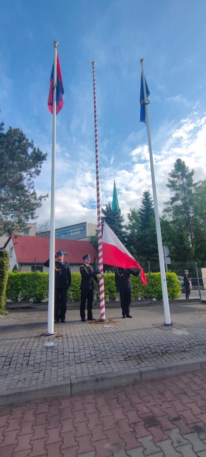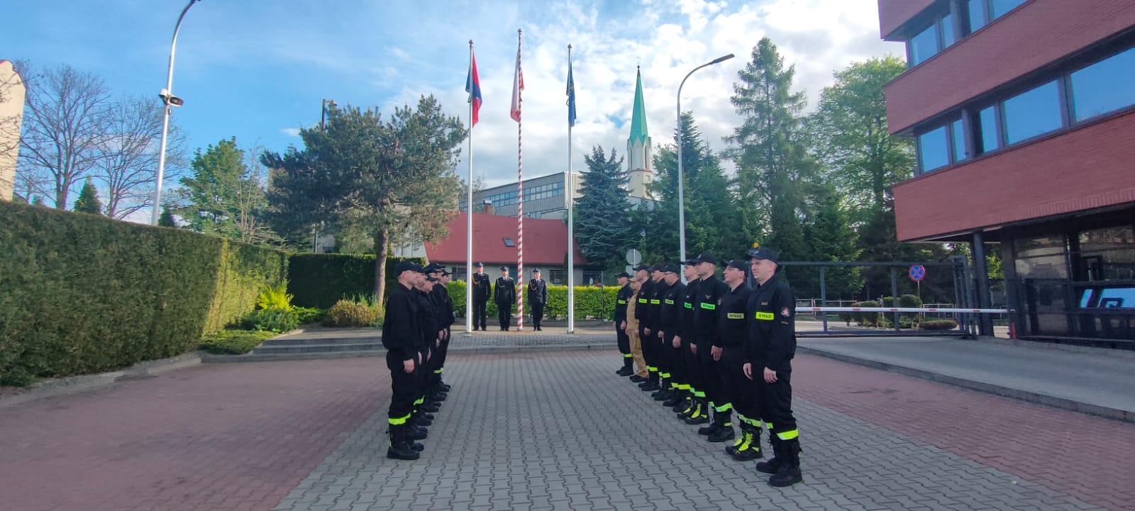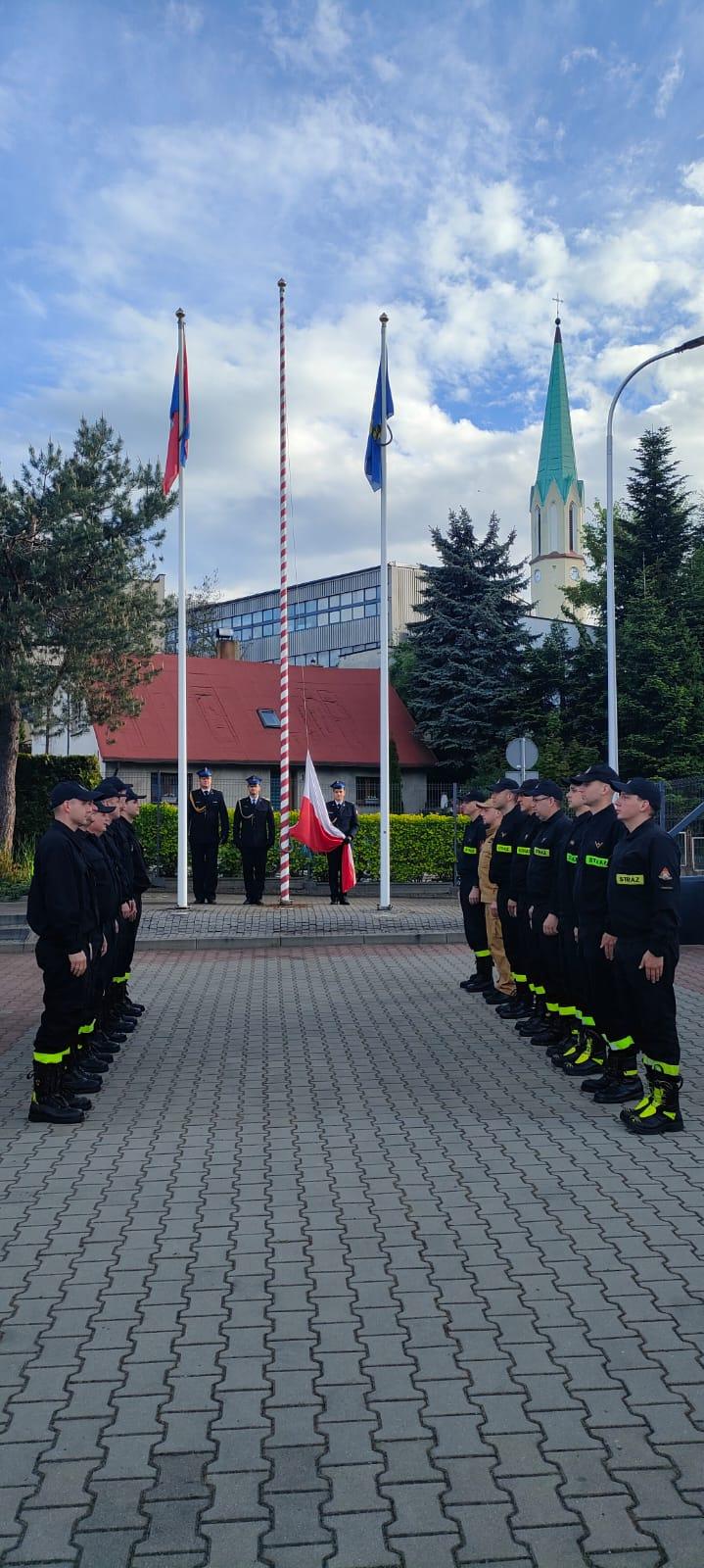 Z okazji Dnia Flagi Rzeczypospolitej Polskiej w Komendzie Powiatowej Państwowej Straży Pożarnej w Mikołowie odbyła się uroczysta zmiana służby podczas której podniesiono flagę państwową.